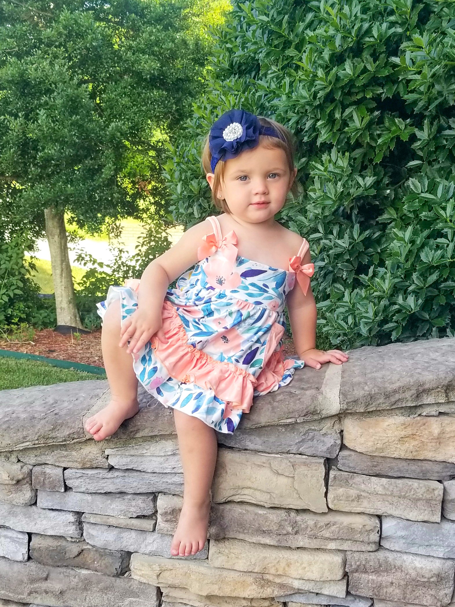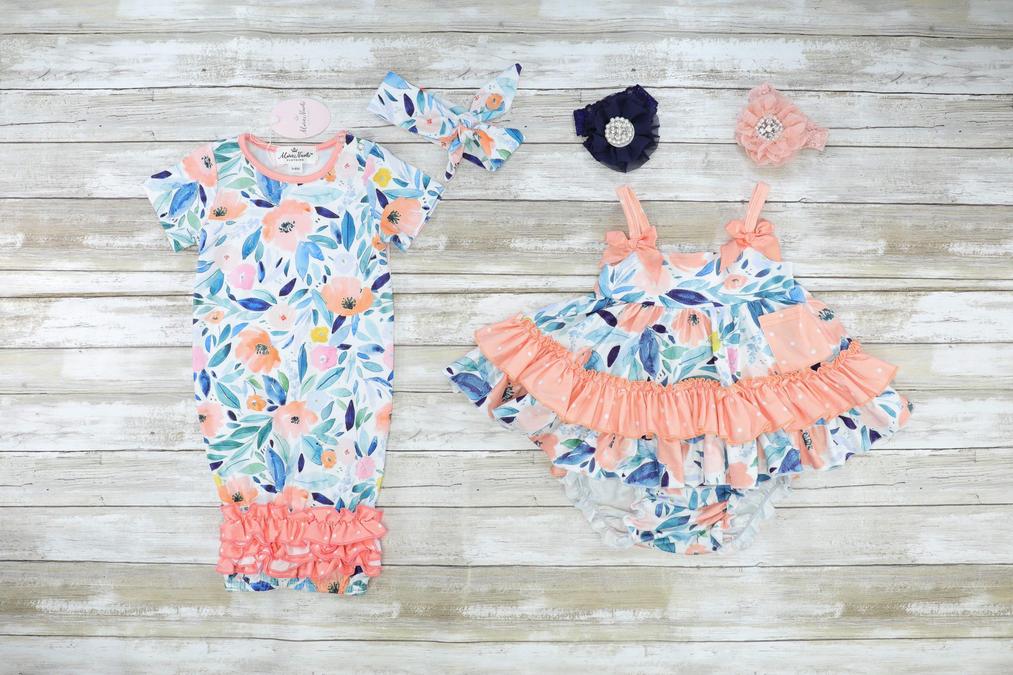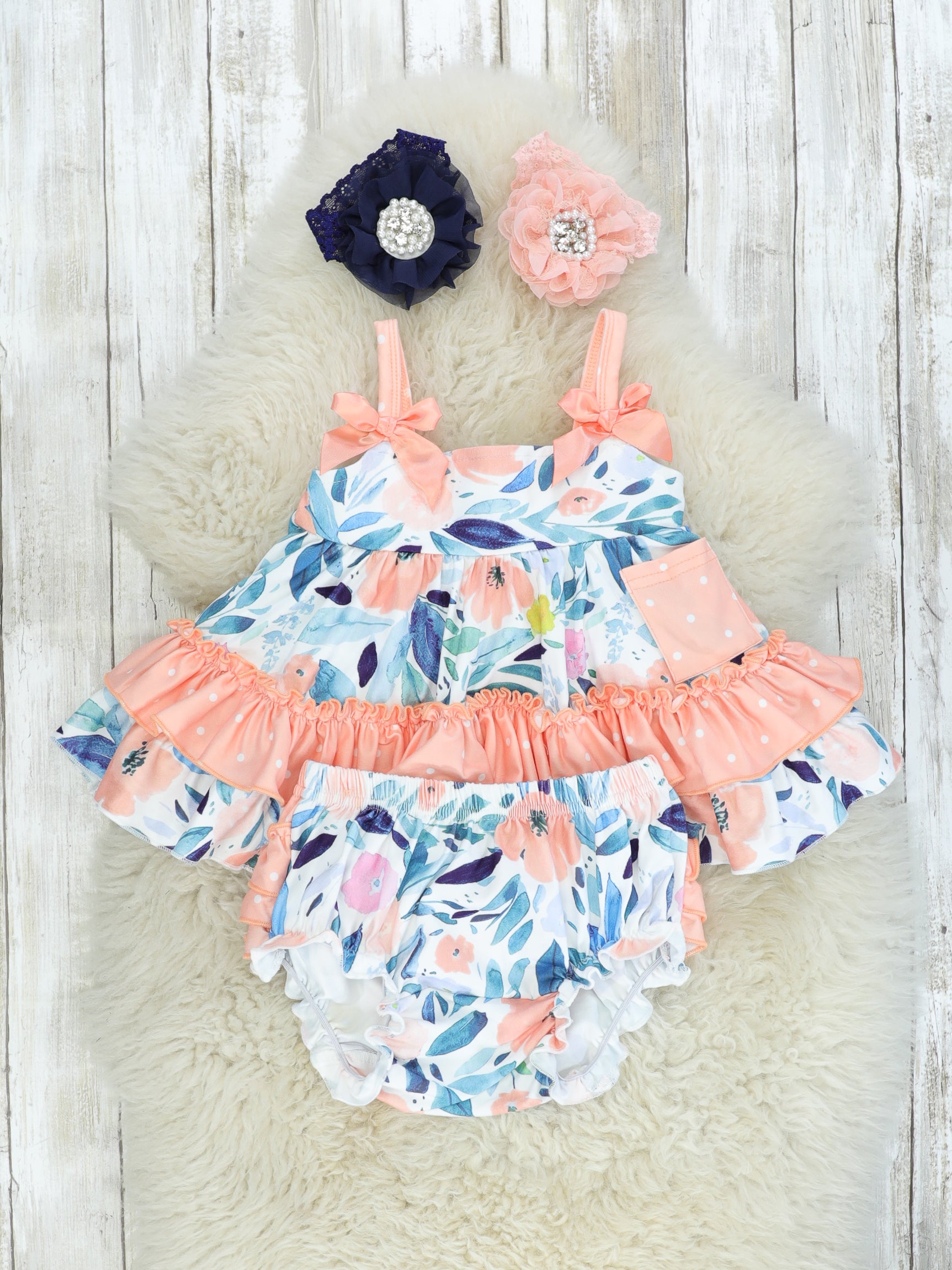 Our sweet Blushing Susie Collection is complete with our swing dress & matching bloomers! This sweet swing dress features our Blushing Susie print, peach polka dots, and peach bows.