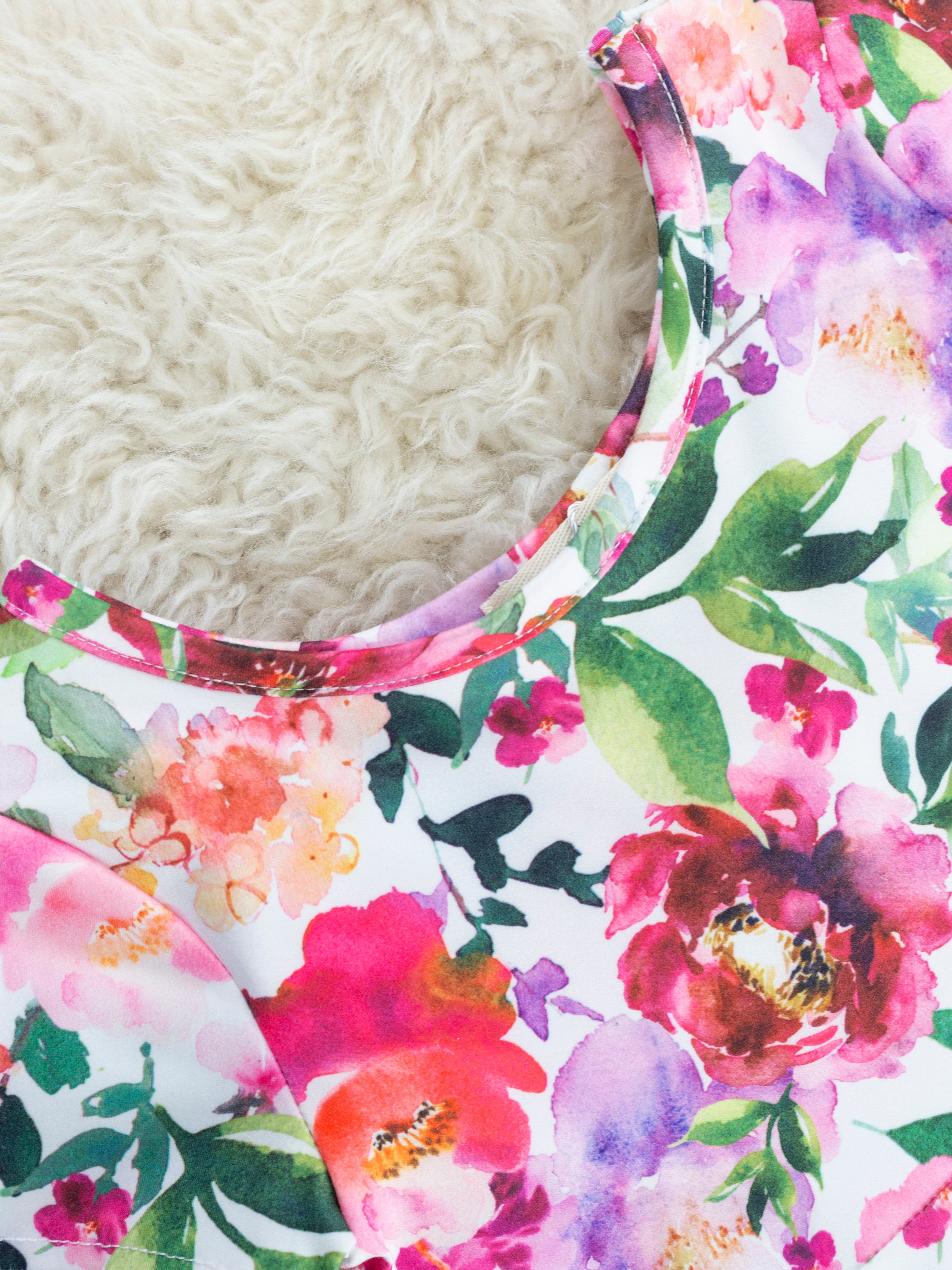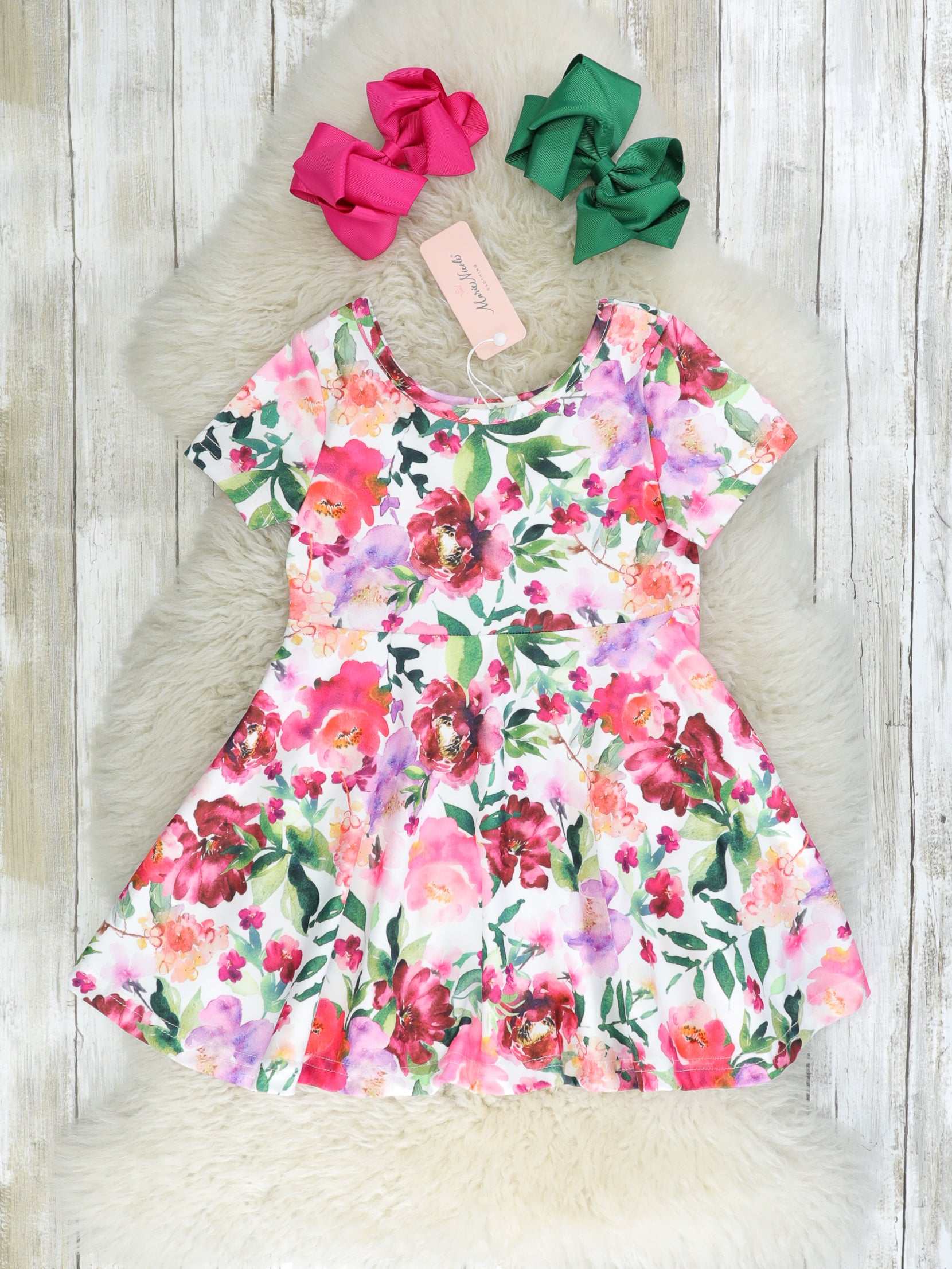 A vivid dress for your girls with flower power! This swing dress features fuchsia watercolor roses.
