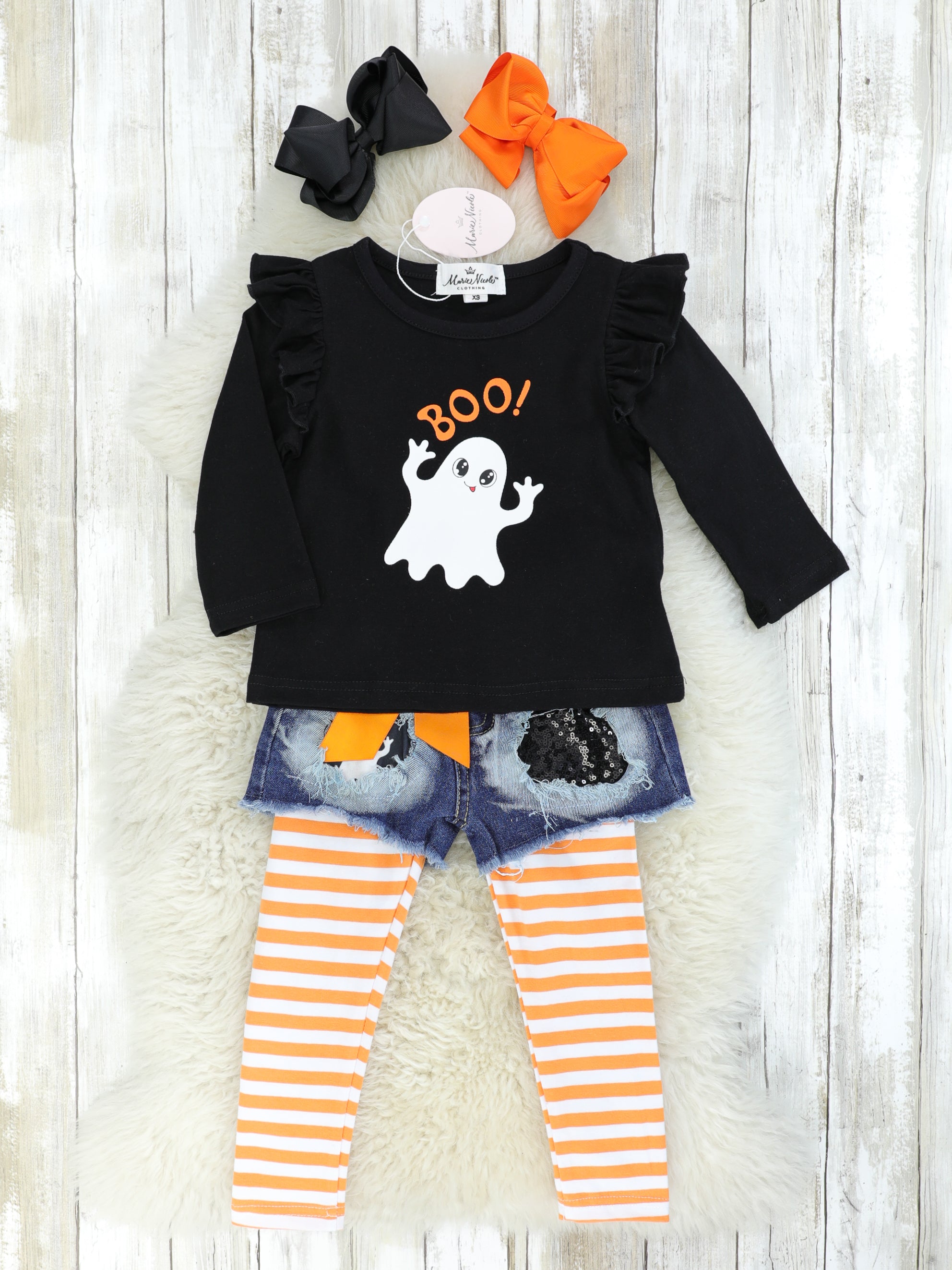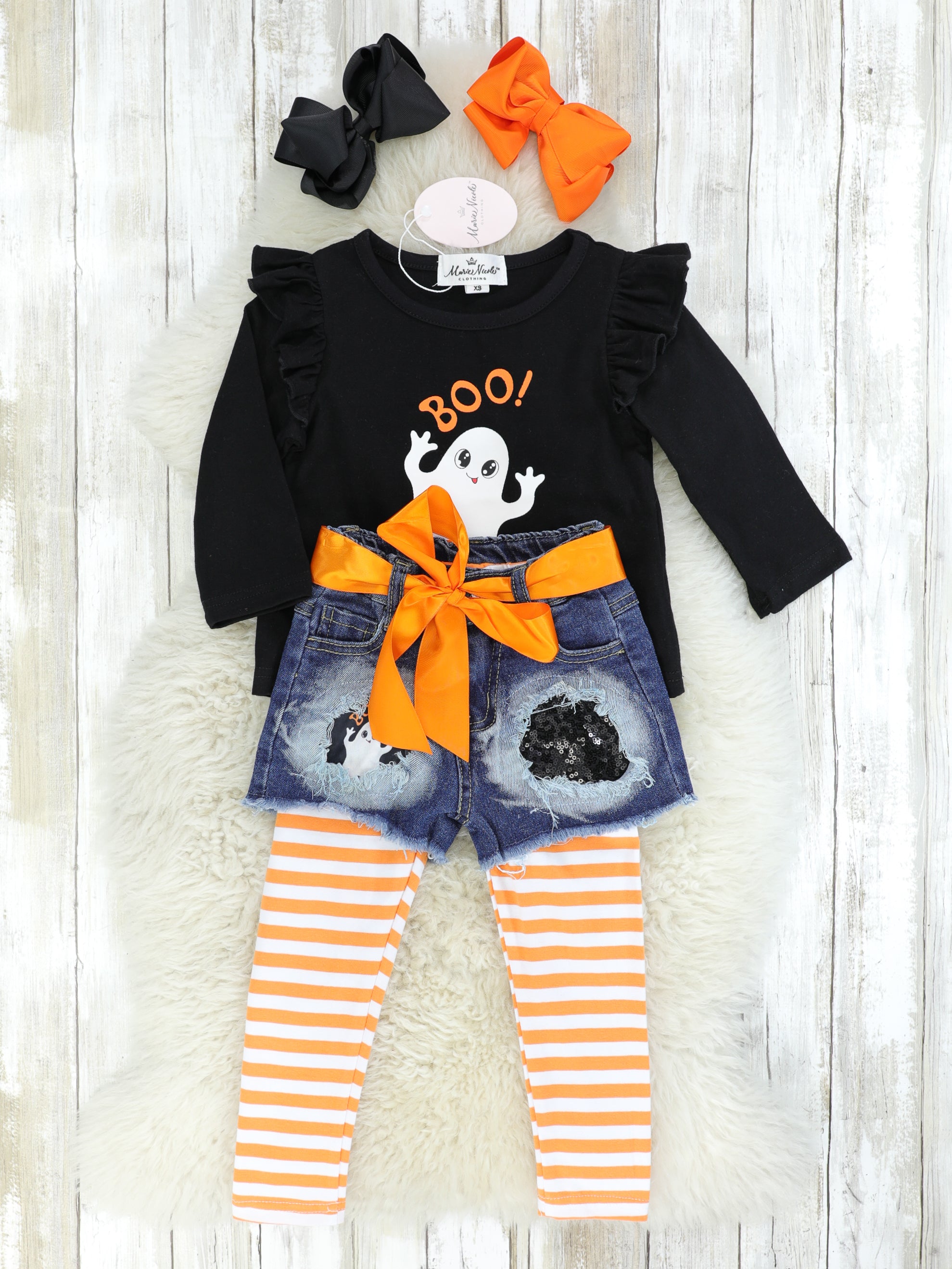 Dress your BOO up in layers this fall! This outfit features a black top with a ghost detail & flutter trim. The distressed denim shorts have a sequin patch & layer on top of orange striped leggings. The orange ribbon belt makes this outfit an absolute show stopper!