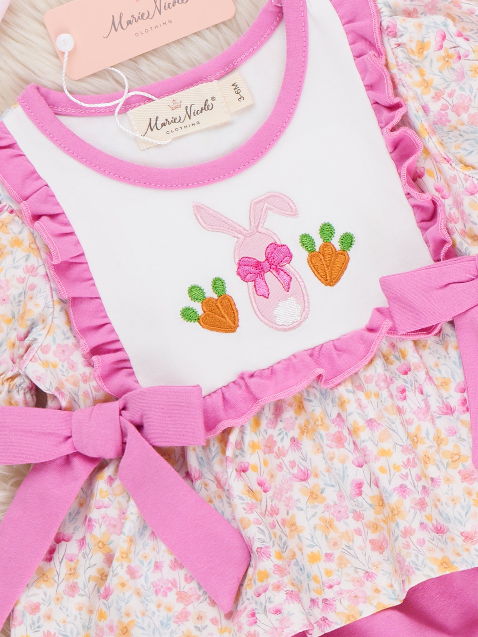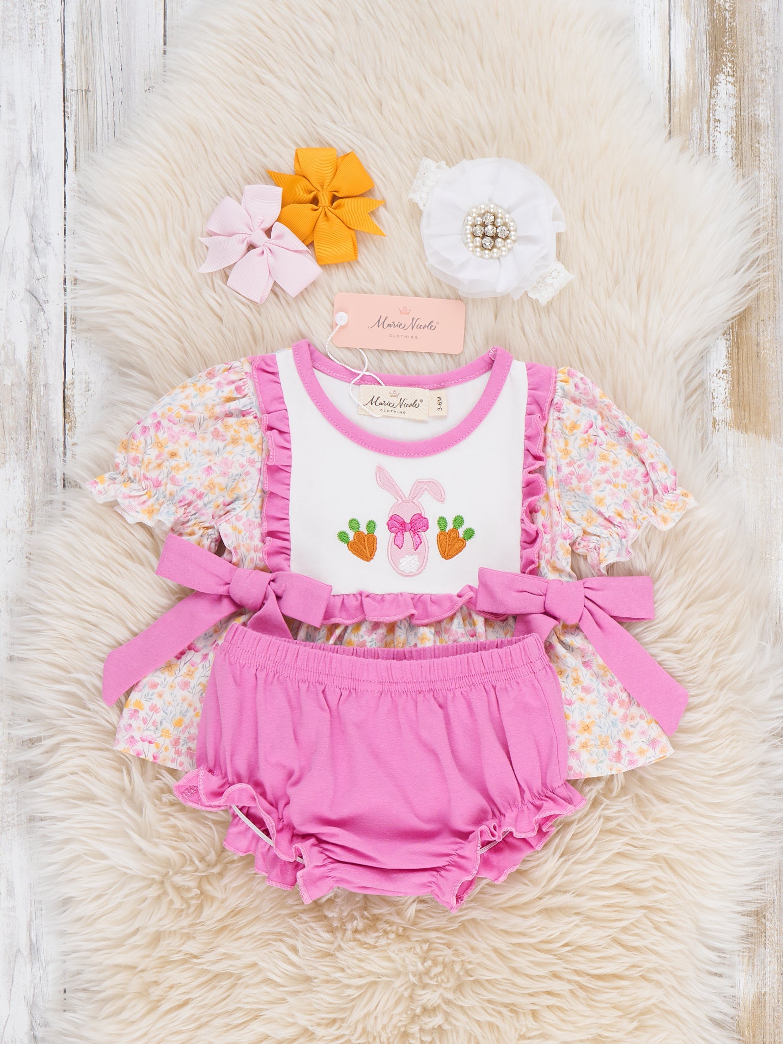 Bow Bunny Blossom Embroidered Bloomers Outfit by Marie Nicole Clothing includes a floral top with puff sleeves and beautiful bodice featuring a bunny and flower embroidery, coordinated with soft bloomers. Side sash bows add girly charm, while the stretchy fit ensures comfy springtime play, Easter photos, or seasonal outings for baby girls