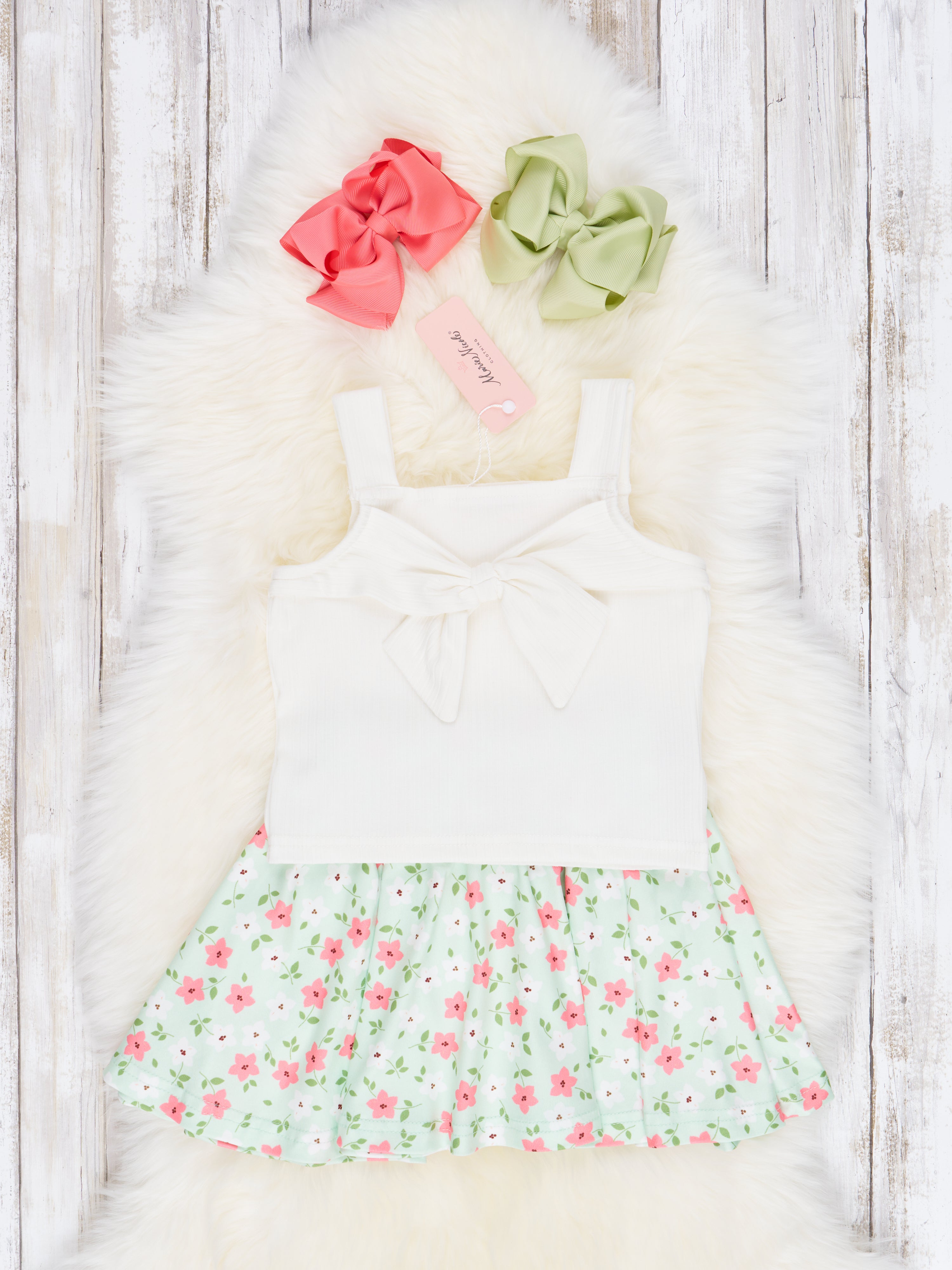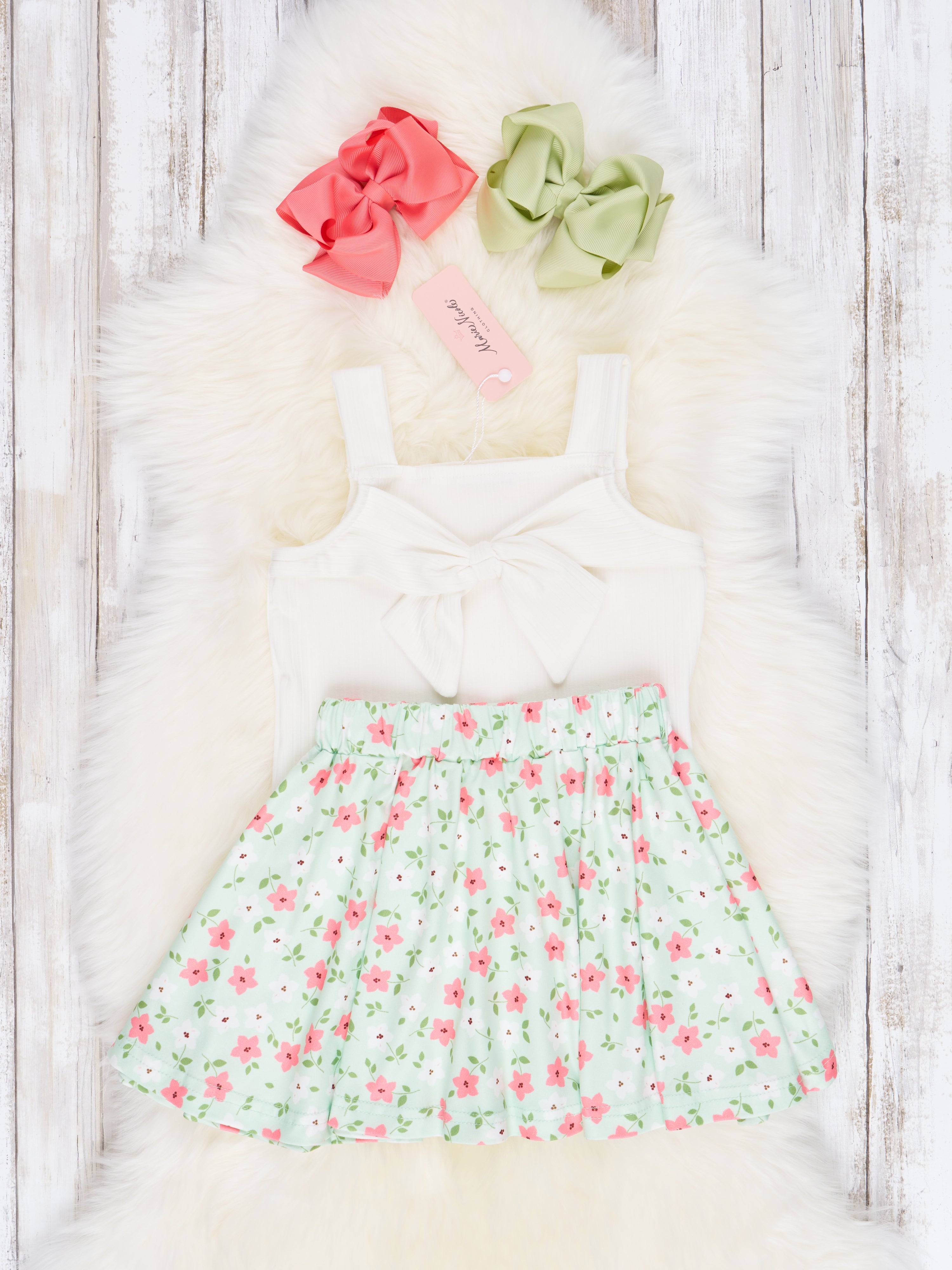 This adorable outfit set is perfect for the little fashionista in your life! Featuring a ribbed tank with a sweet bow detail and a bright floral skirt with an elastic waistband, it's sure to make any child look and feel like a superstar! All the fun and none of the fuss!