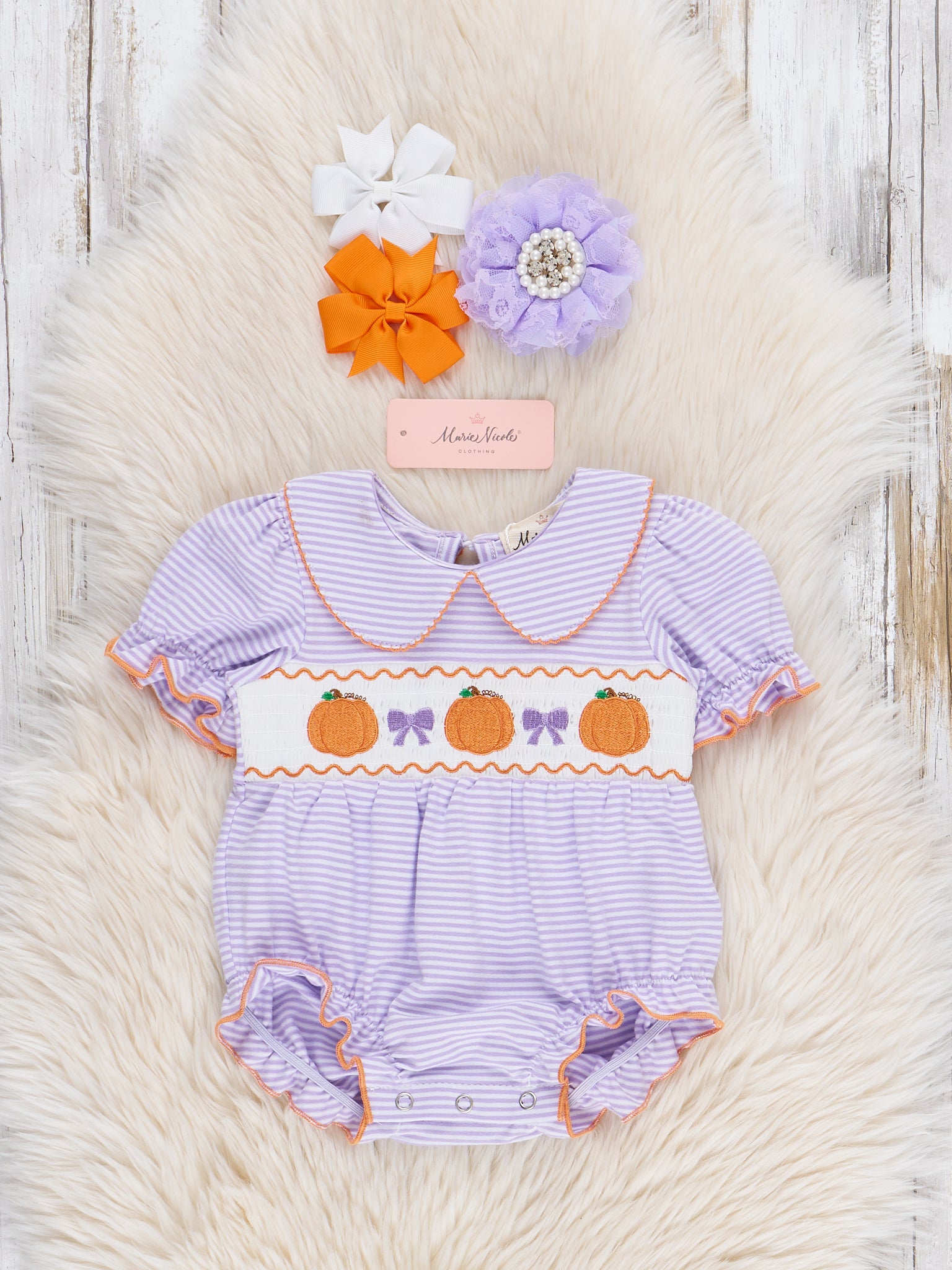 The Bow-tiful in the Patch Embroidered Bubble is an enchanting and adorable one-piece that captures both fall and Halloween cheer. With a smocked bodice, decorated with festive embroidered pumpkins and bows, this soft and comfy romper from Marie Nicole Clothing brings fun to any event, whether picking pumpkins or carving them!