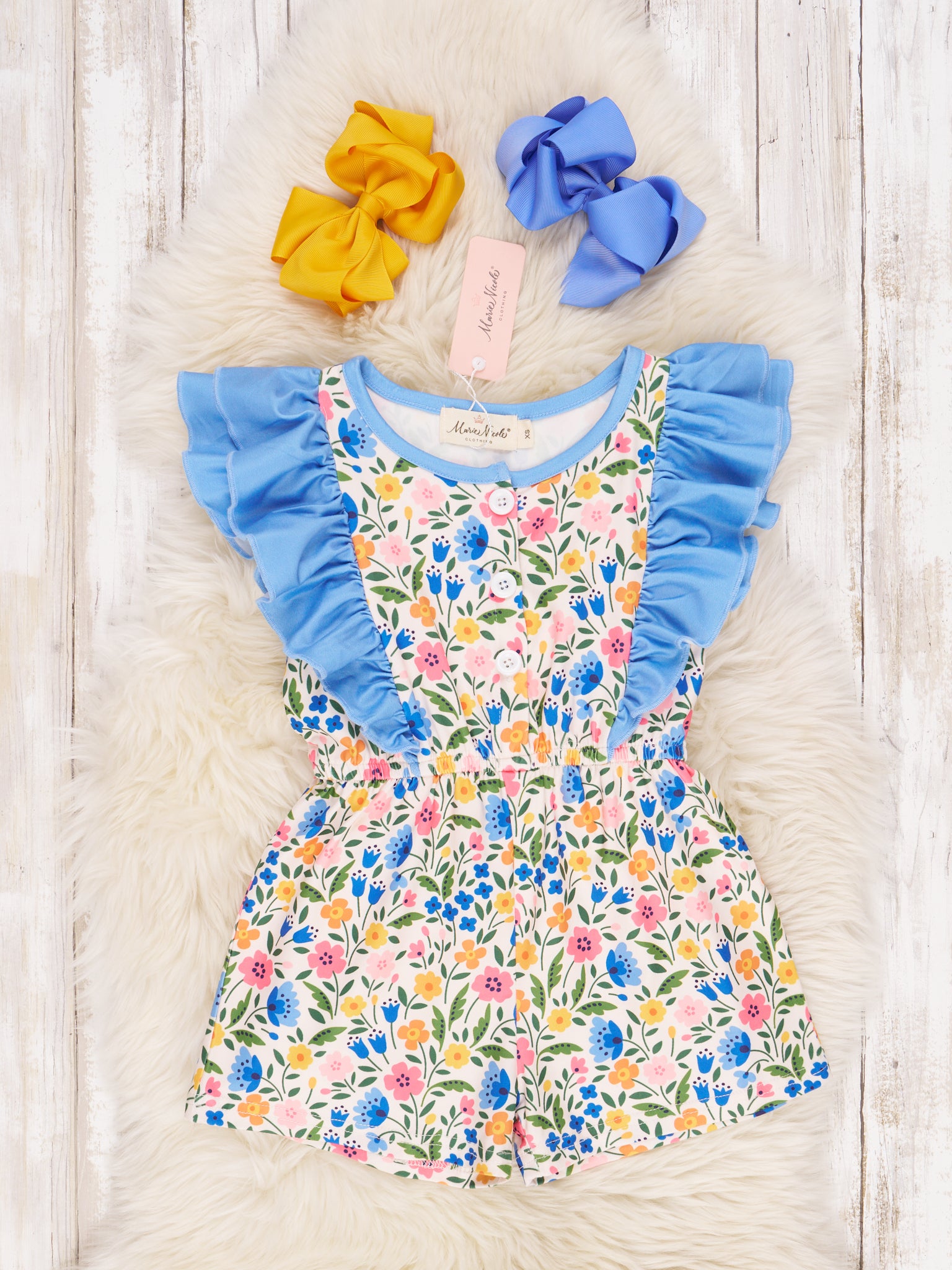 Cuteness alert! Your little one will rock this adorable Bright Cornflower Ruffle Jumpsuit! Featuring a cornflower print and plenty of girly ruffles, this jumpsuit is sure to put a smile on any kid's face. Let their inner fashionista shine!