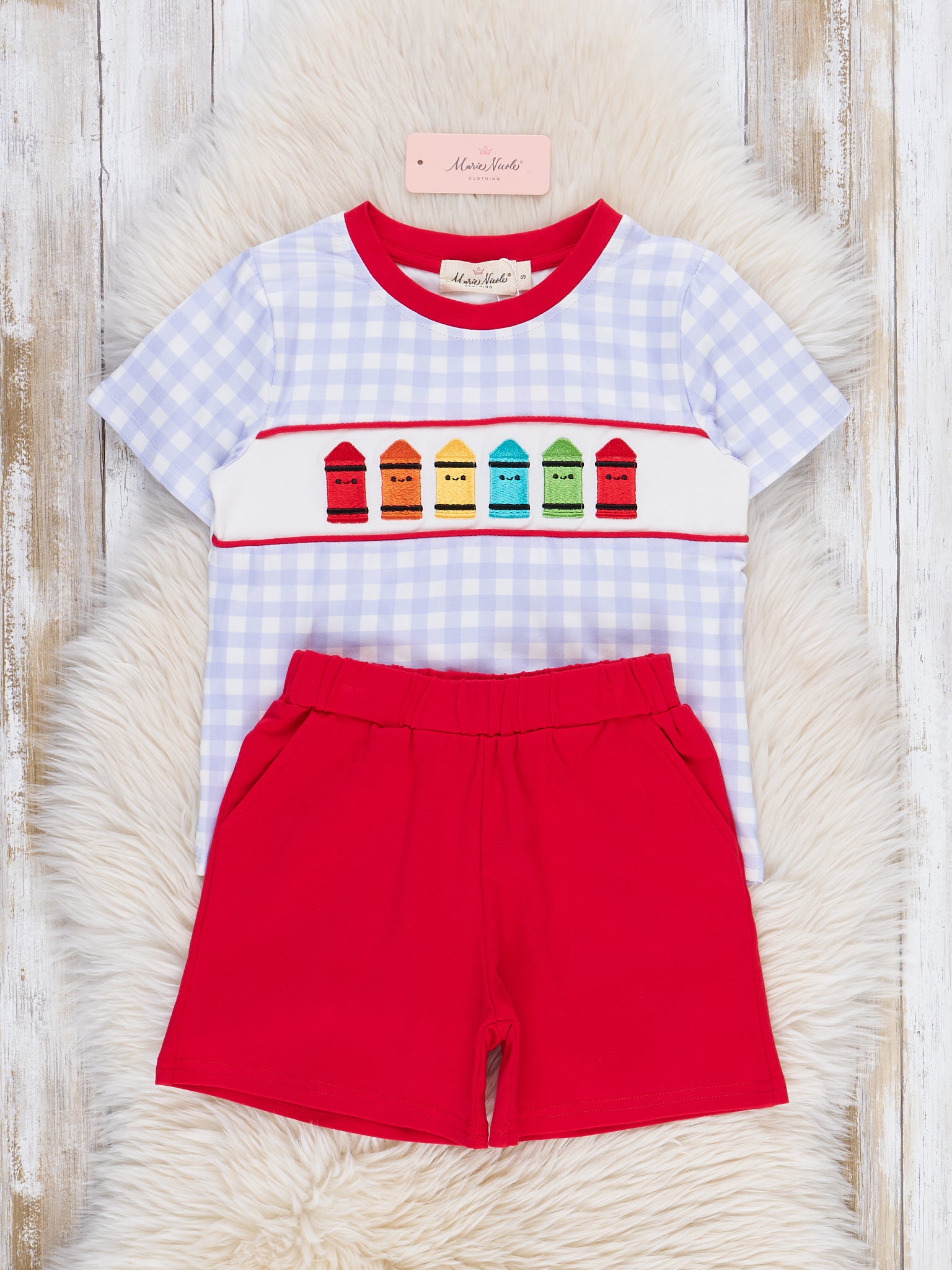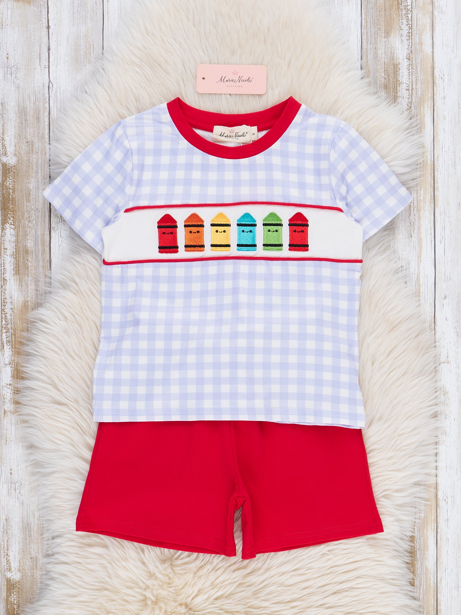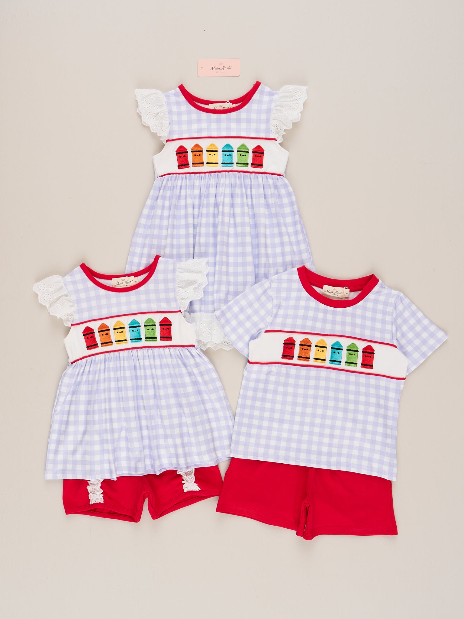Colorful and full of charm, the Bright Crayons Embroidered Gingham Outfit is a back-to-school favorite. Featuring embroidered detailing with bright crayons with a classic gingham fabric, this two-piece set from Marie Nicole Clothing is as playful as it is comfy. Perfect for classroom fun or picture day, it’s a cheerful outfit your little one will love to wear.