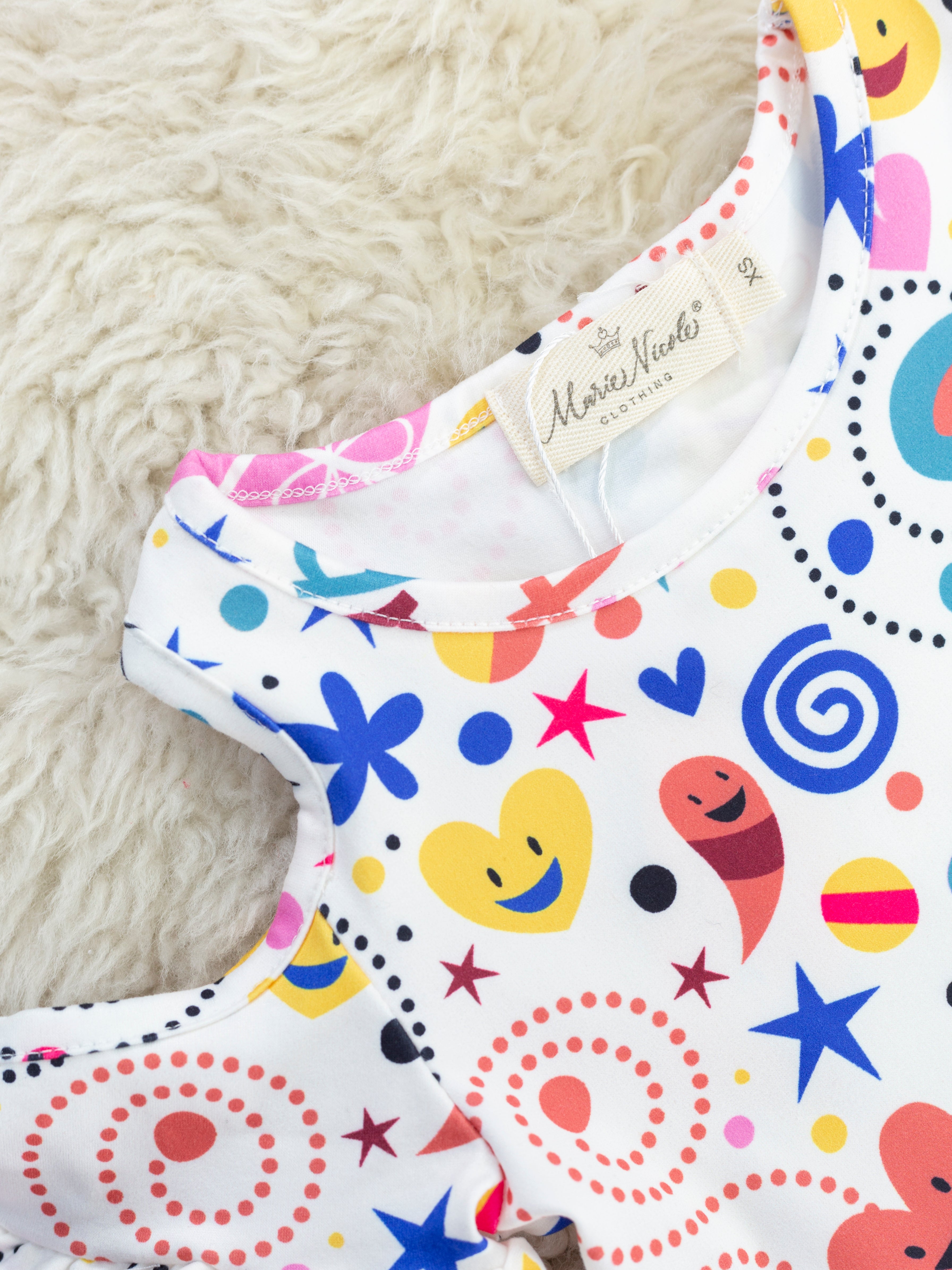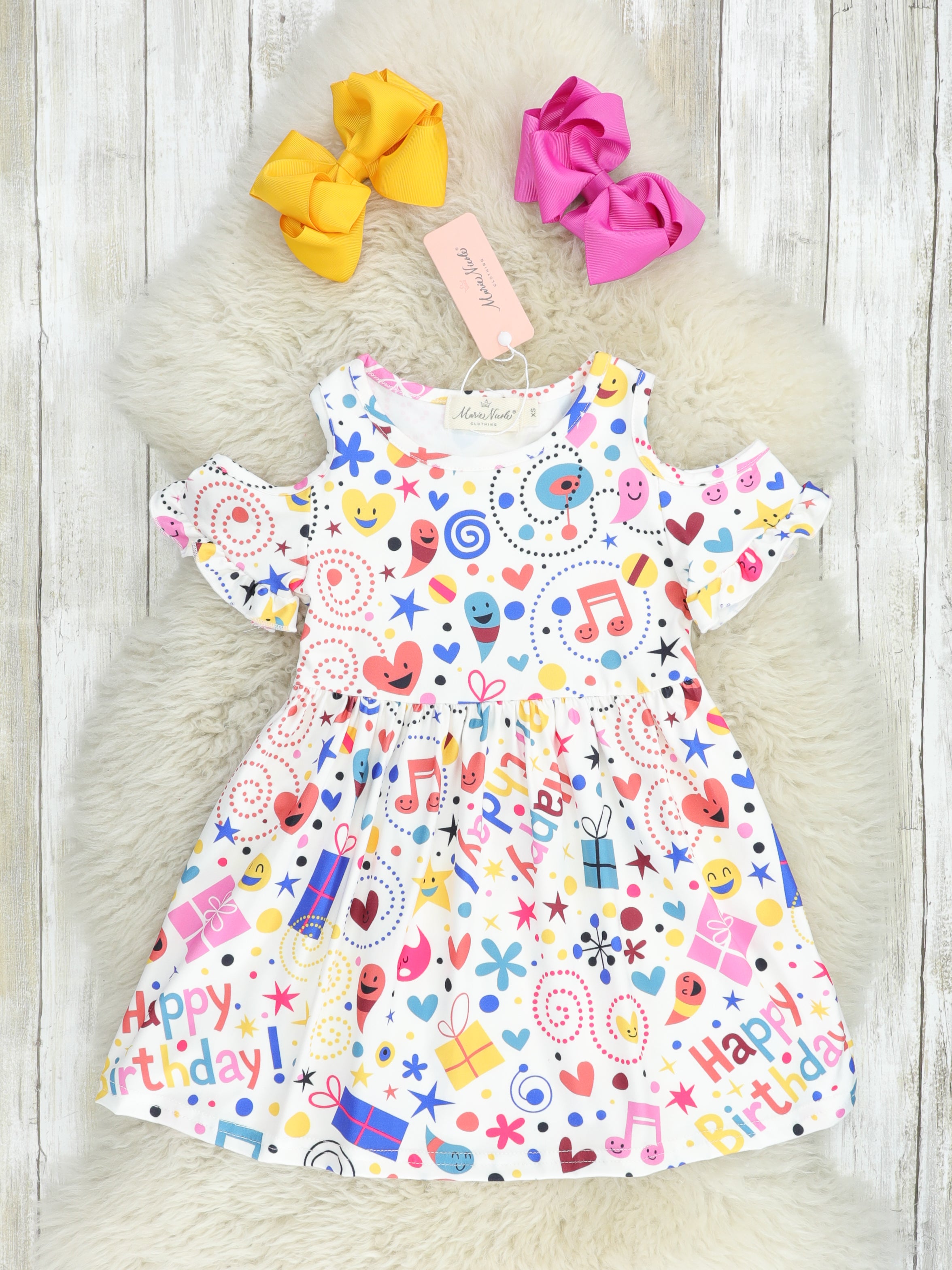 The perfect dress for your birthday girl! This dress features a darling happy birthday print with ruffle details & cold shoulder.