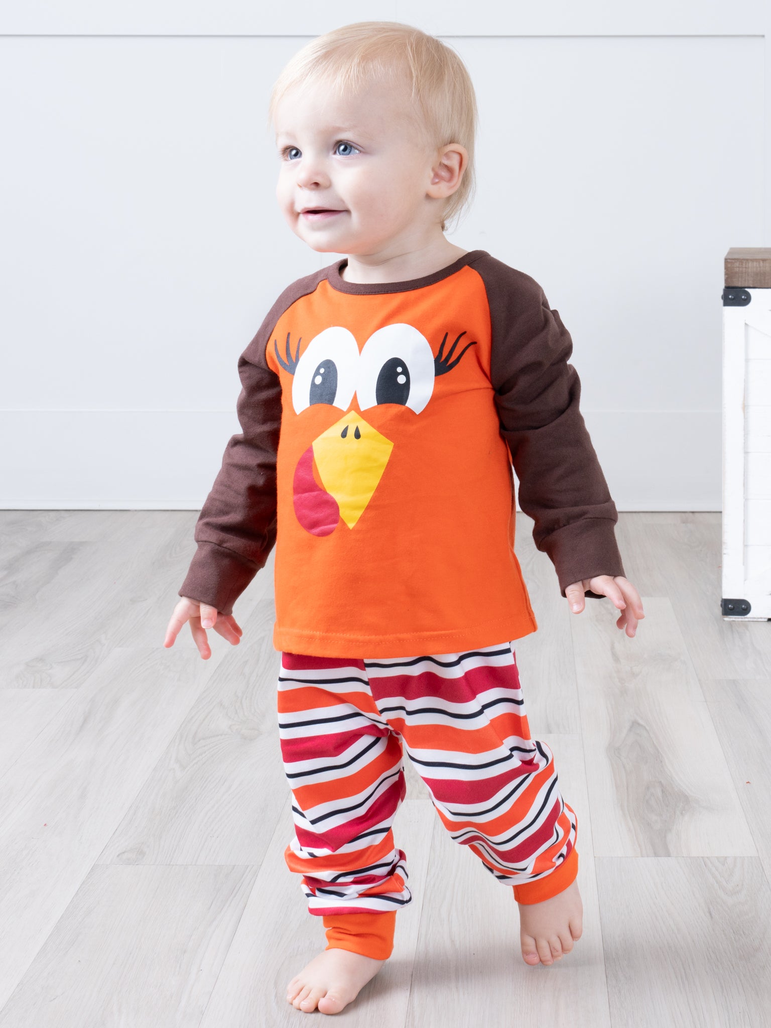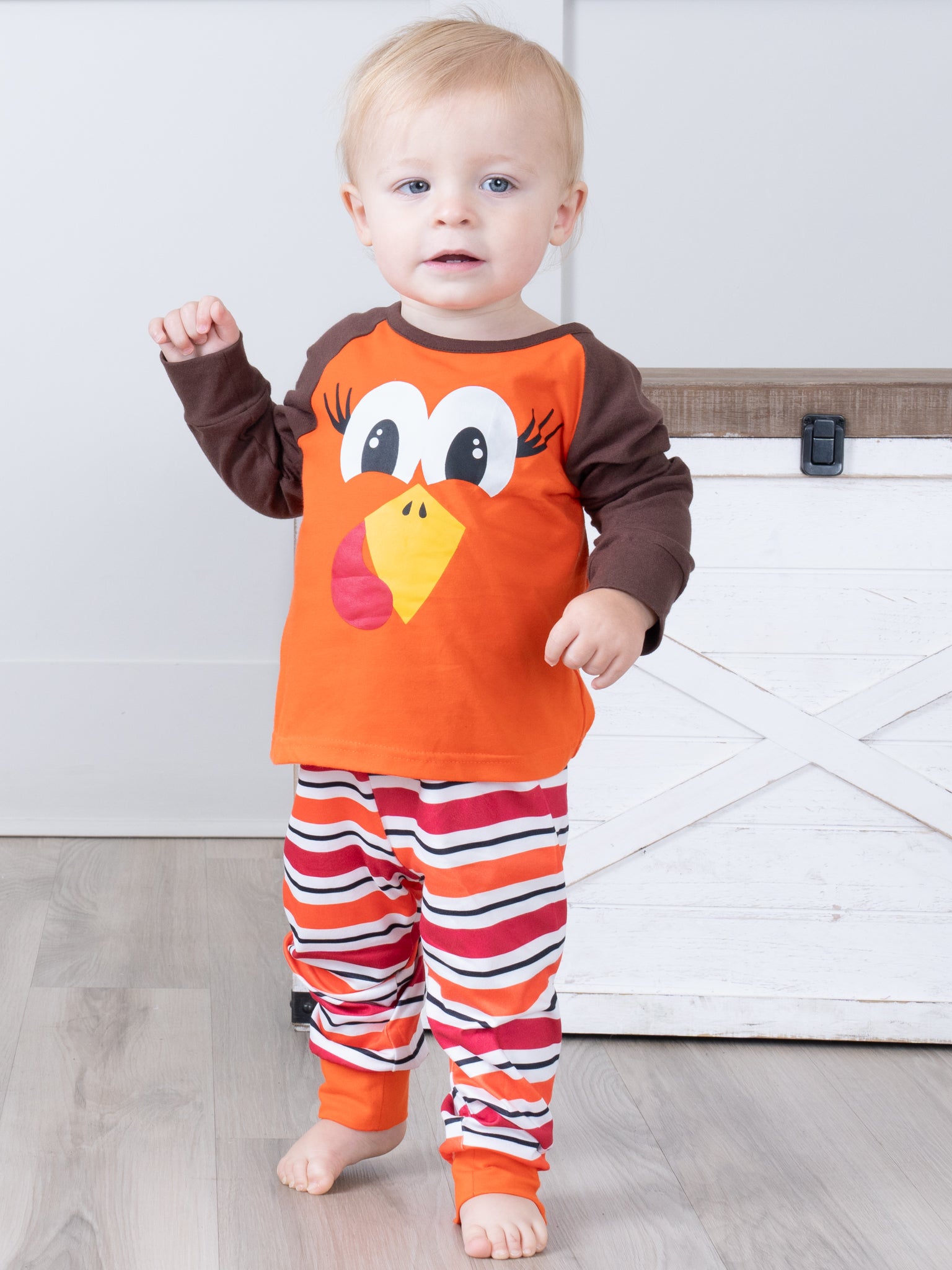 Bring a little holiday cheer to your sleepwear with these Bright Orange Stripes Turkey Pajamas! This festive outfit features a comfy turkey face on the shirt and stretchy striped pants that will make even the grumpiest of birds smile. Stuff yourself with comfort this holiday season!