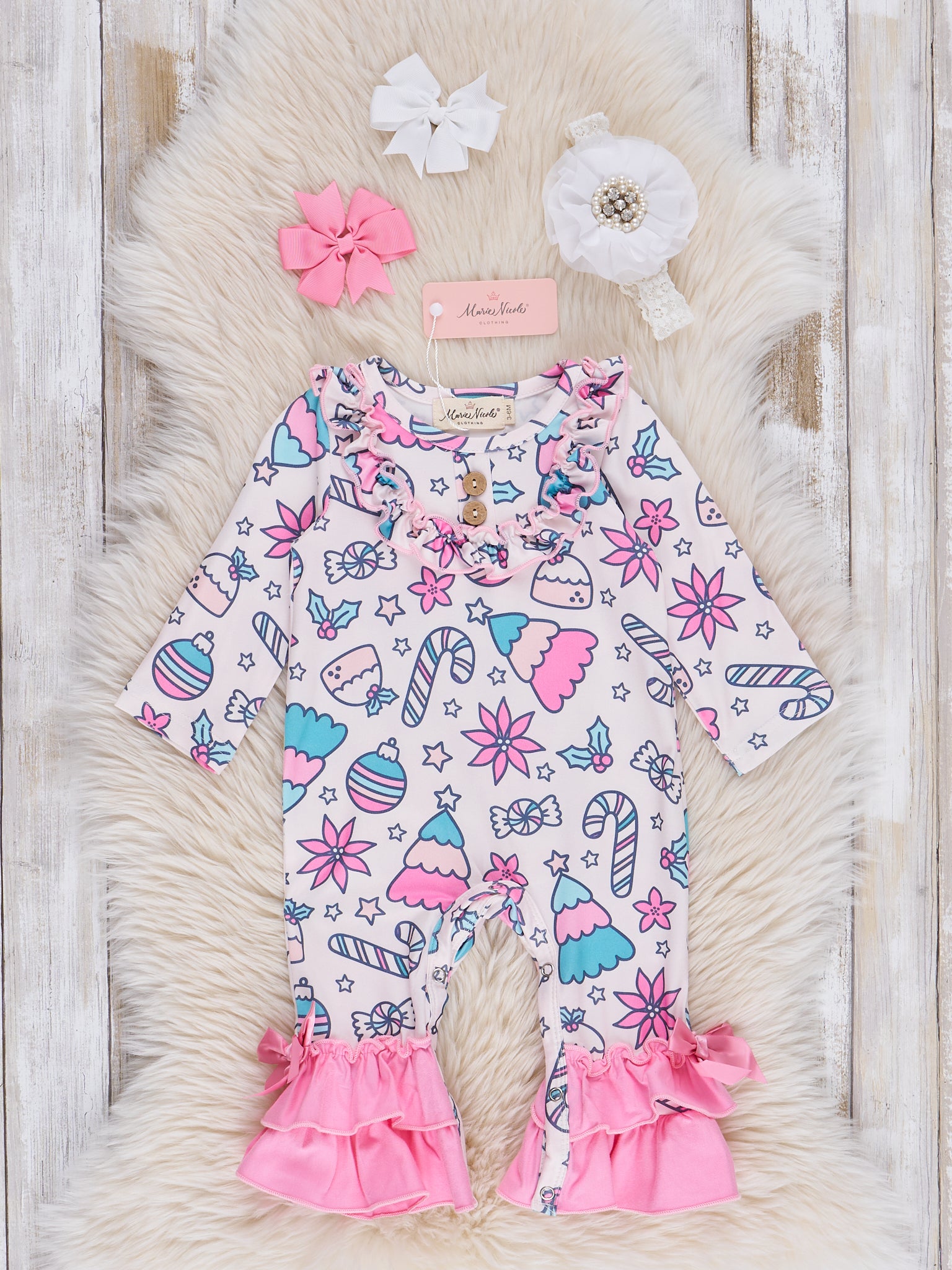 This sister set is all about Christmas with the sweetest pink twist! This romper features holiday doodles of trees, sweets, and stars with ruffle detail at the collar and ankles.