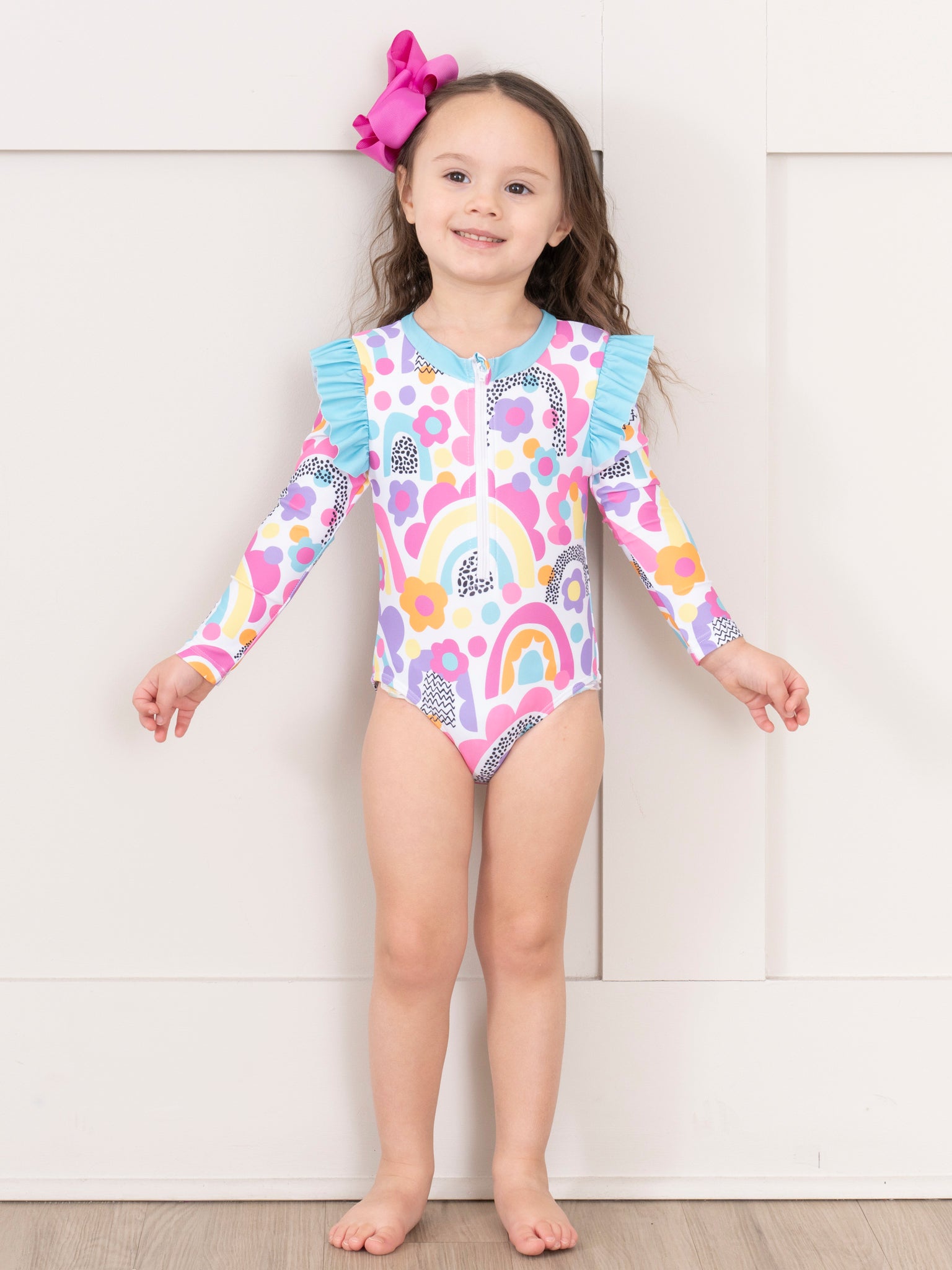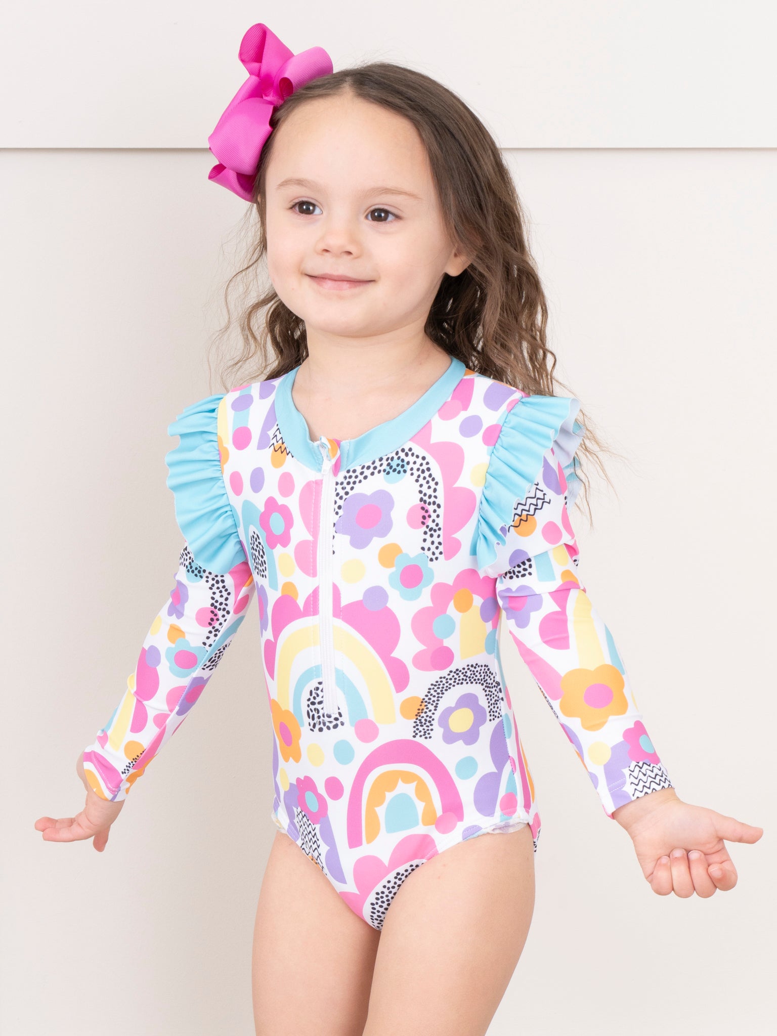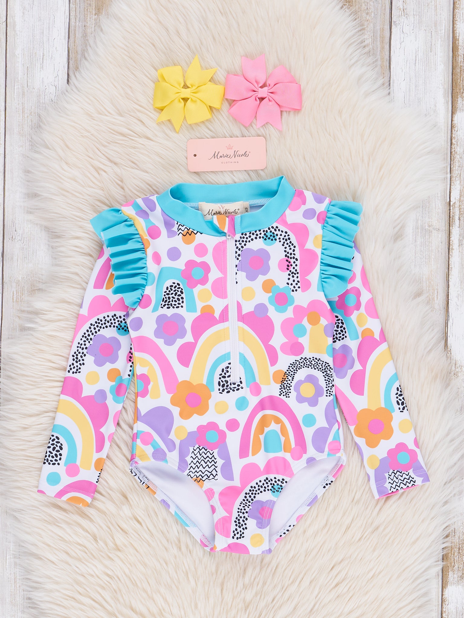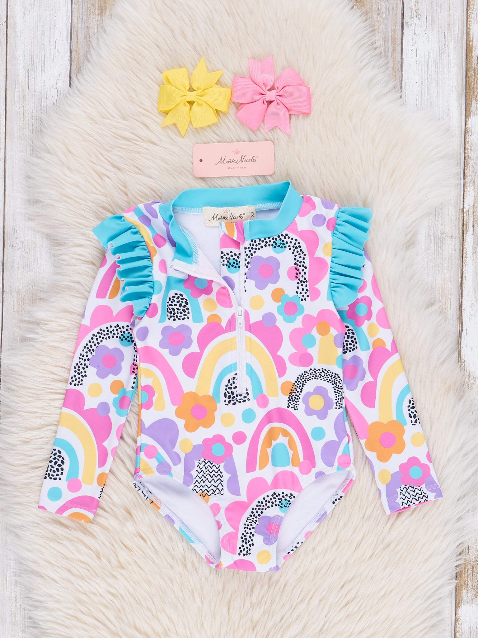 Bright Rainbows Ruffle One-Piece Rashguard Swimsuit