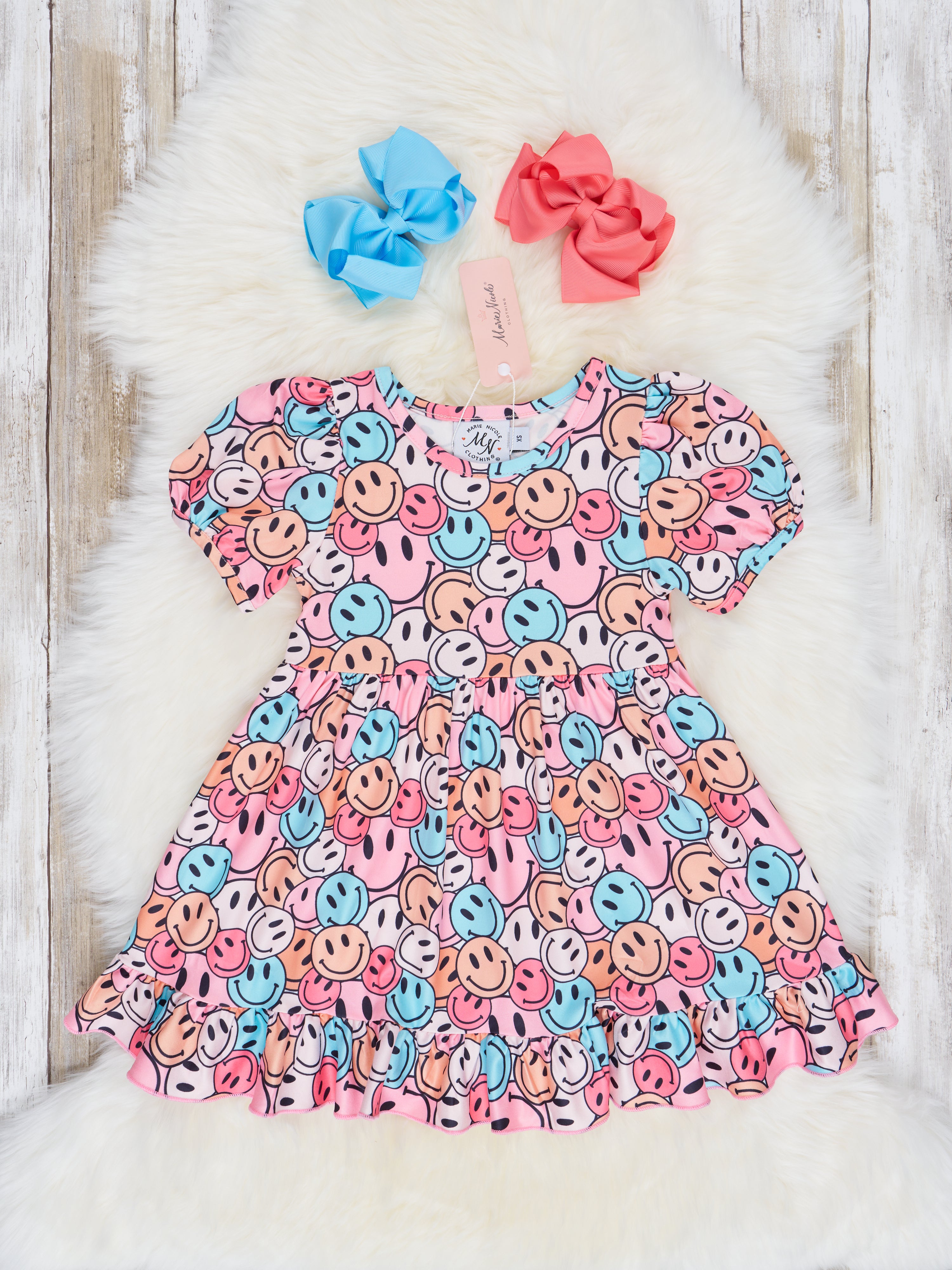 Bring your sisterly love to life with this fun and fresh Bright Smiley Sister Set! Perfect for playdates and special occasions, it will make your kids jump for joy with its bright colors, smiley face print, and ruffles. Twinning never looked so cute!