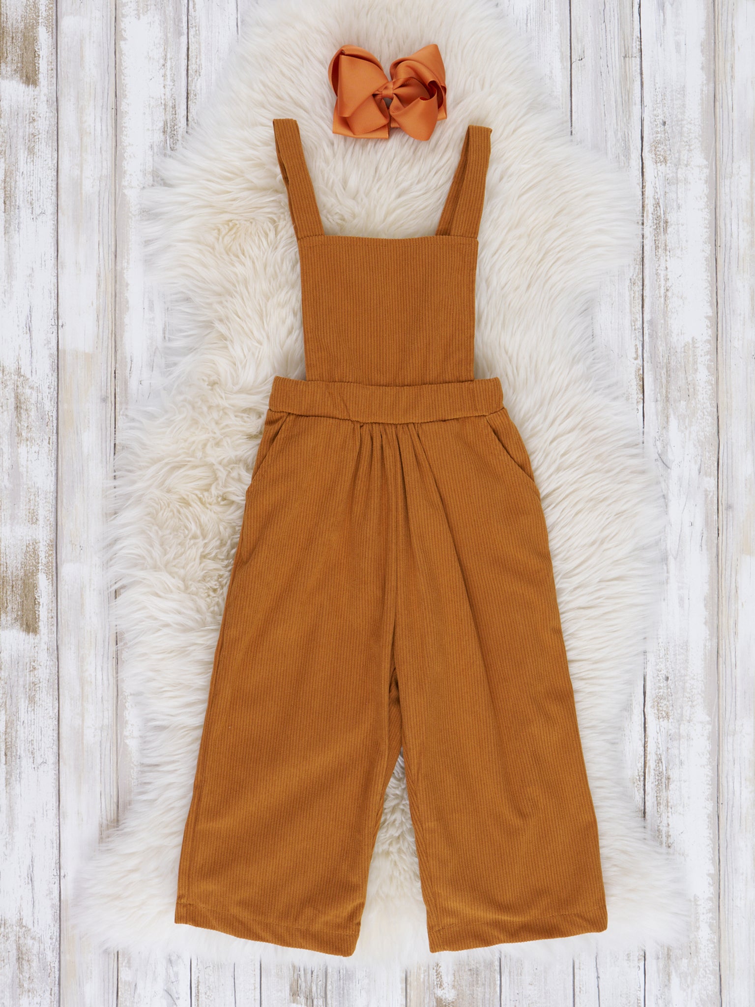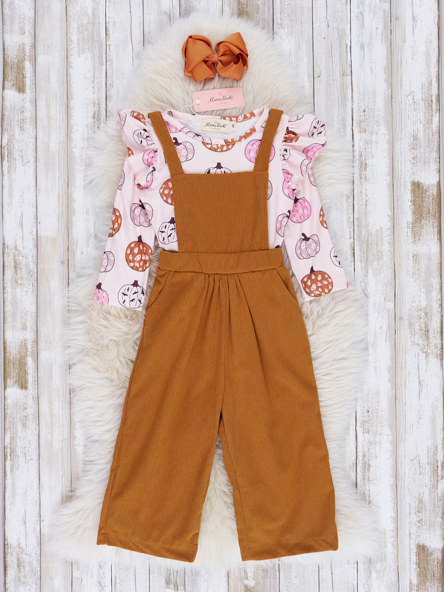 Bronze Doodle Pumpkin Suede Overalls Outfit