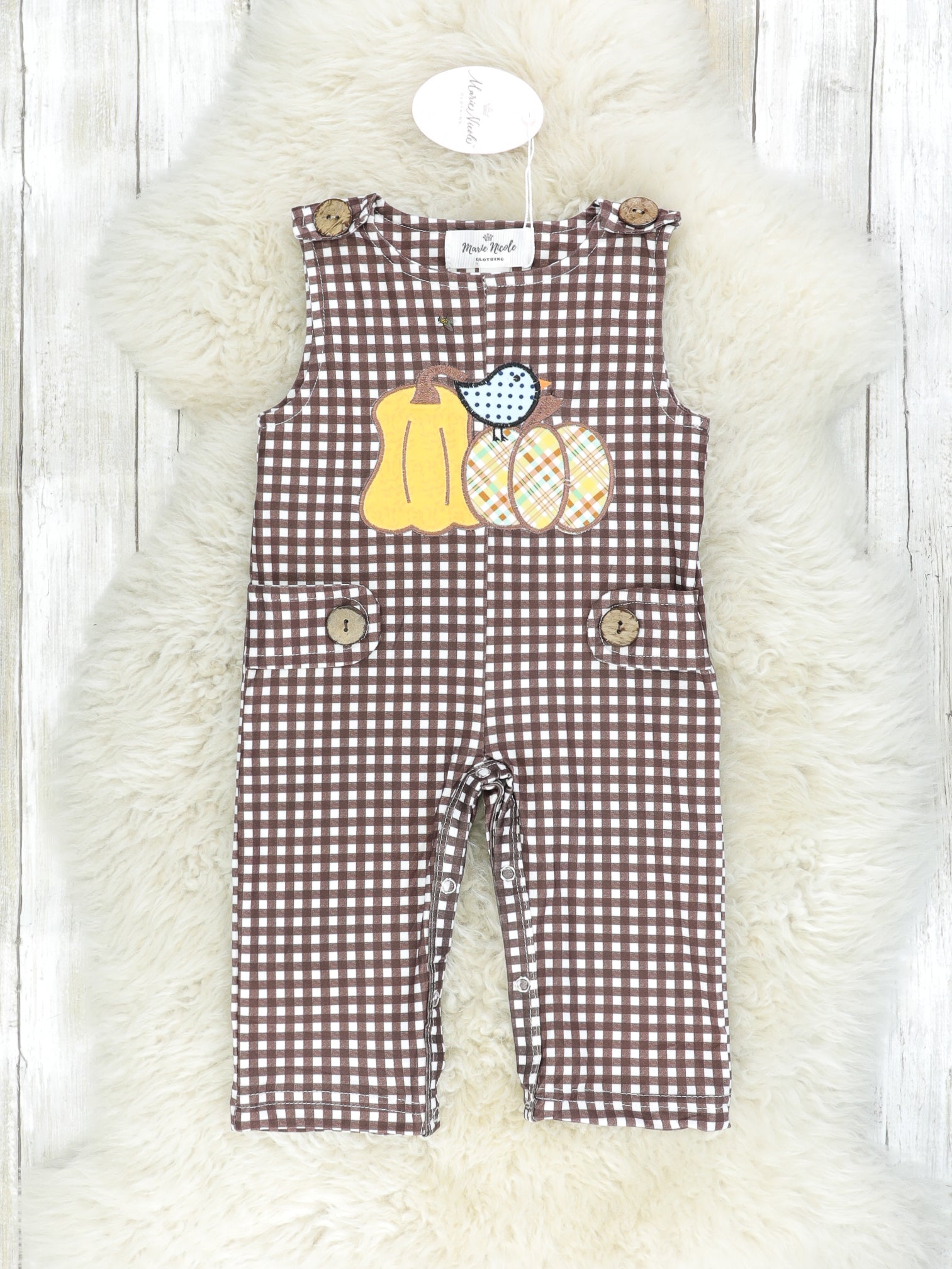 This adorable romper is perfect for the pumpkin patch! This romper features a the cutest pumpkin appliqué with decorative buttons at the sides & functioning buttons on the straps for easy changing.
