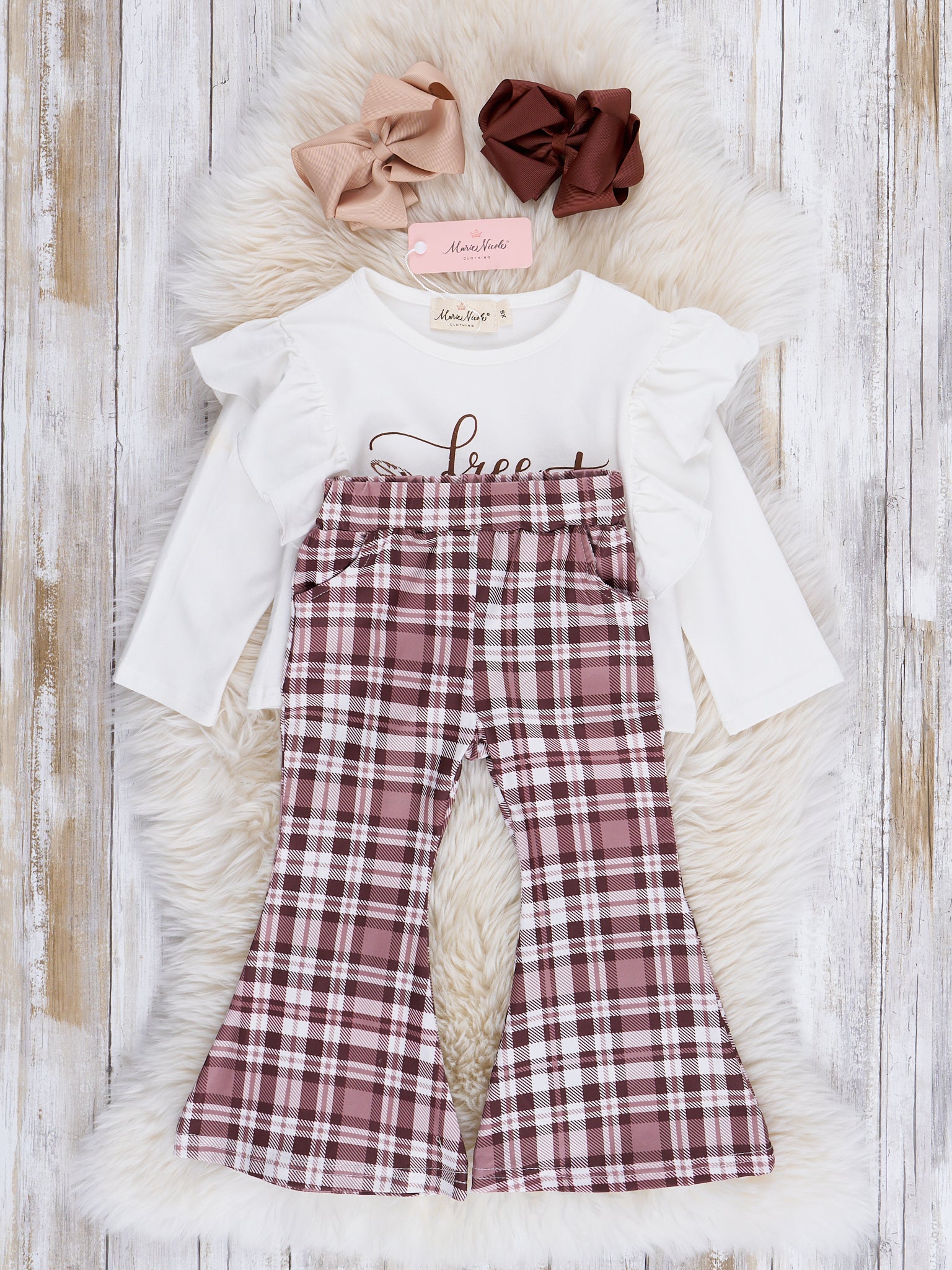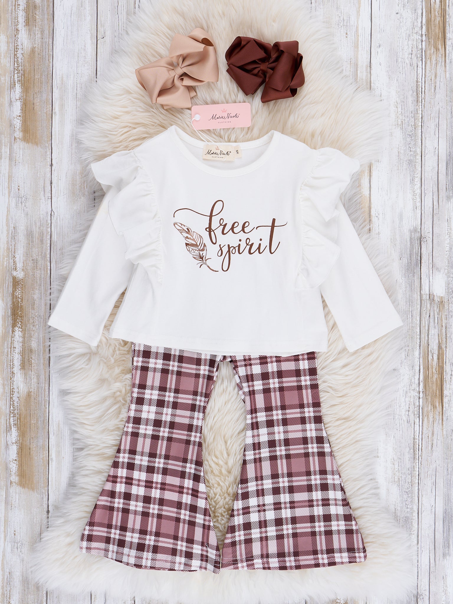 Let your girl's spirit roam free in this trendy outfit! The white ruffle long sleeve top perfectly complements the statement-making brown plaid bell bottoms, perfect for the fall season. Bring some playful spirit to your wardrobe with this quirky ensemble.