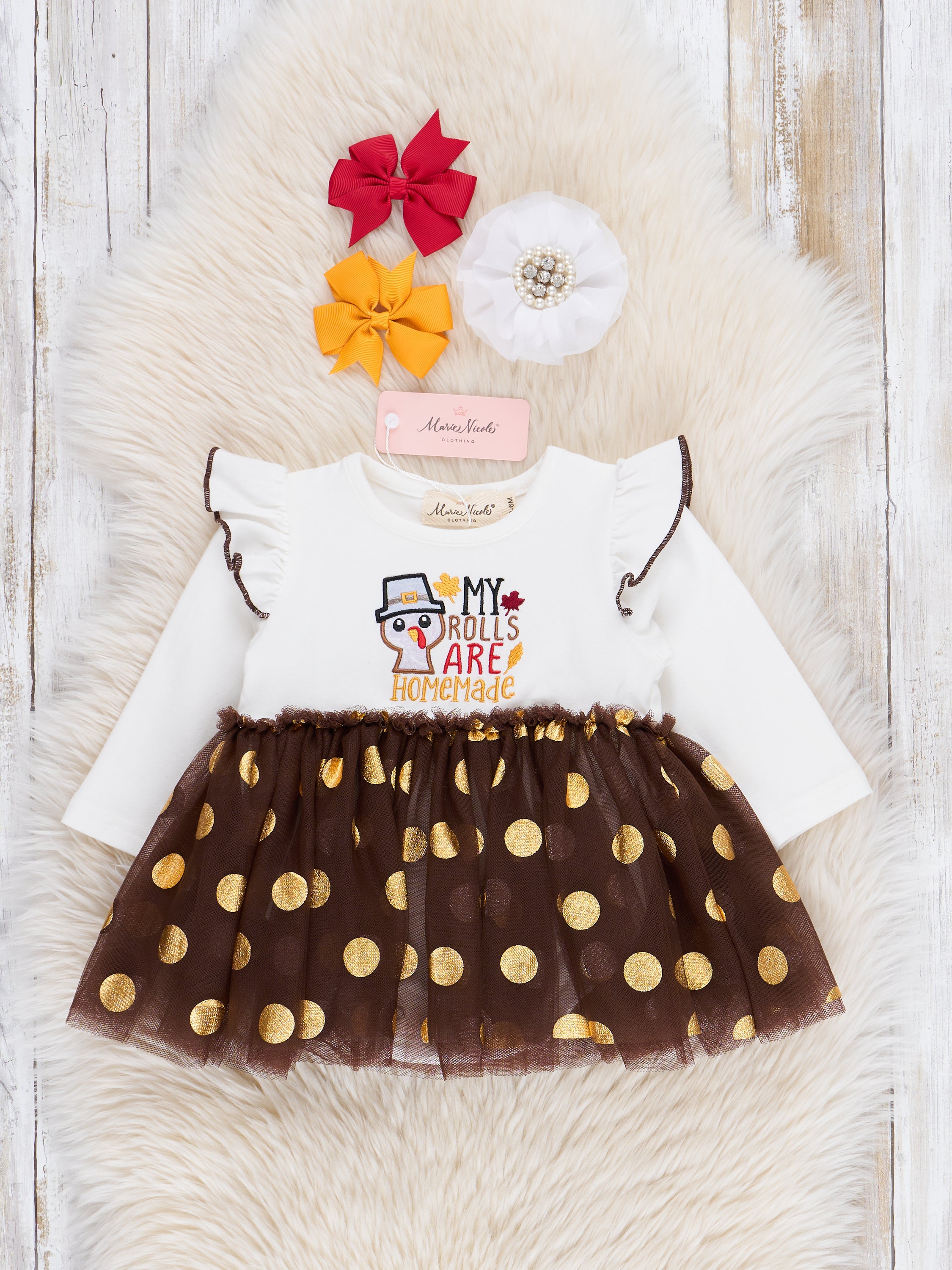 Roll up some fun with our Brown & Gold Dots "Homemade Rolls" Tulle Bubble! This playful sister set features a girls bubble with a trendy brown tulle overlay adorned with gold polka dots. Perfect for your little one to twirl and play in. Get them while they're hot!