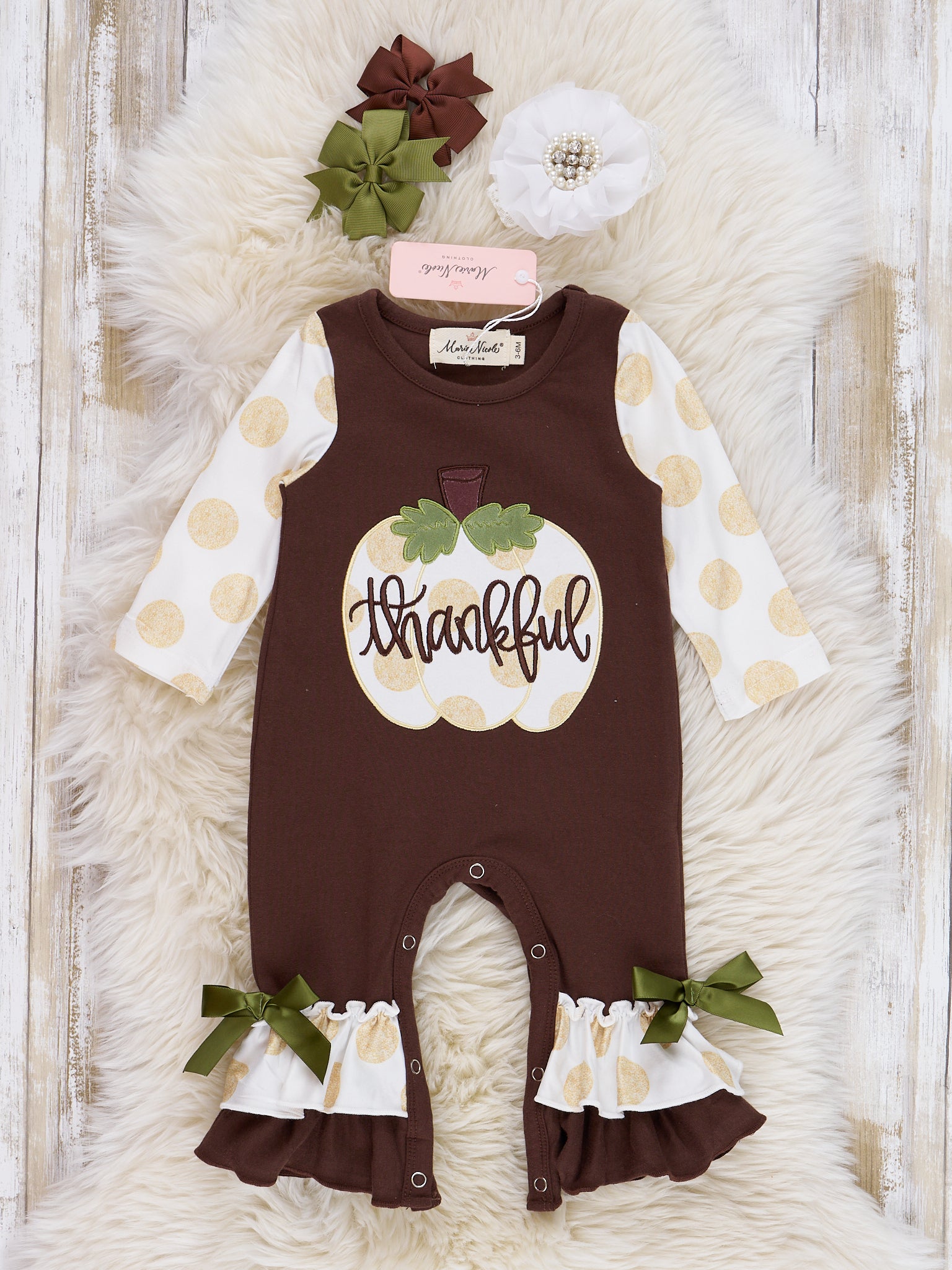 Make your little ones stand out from the crowd this fall in this sassy yet sweet Brown & Gold Dots sister set! Featuring eye-catching gold pumpkin bell bottoms, raglan sleeves & detailed with an adorable thankful pumpkin, this #ootd is sure to be Insta-worthy!
