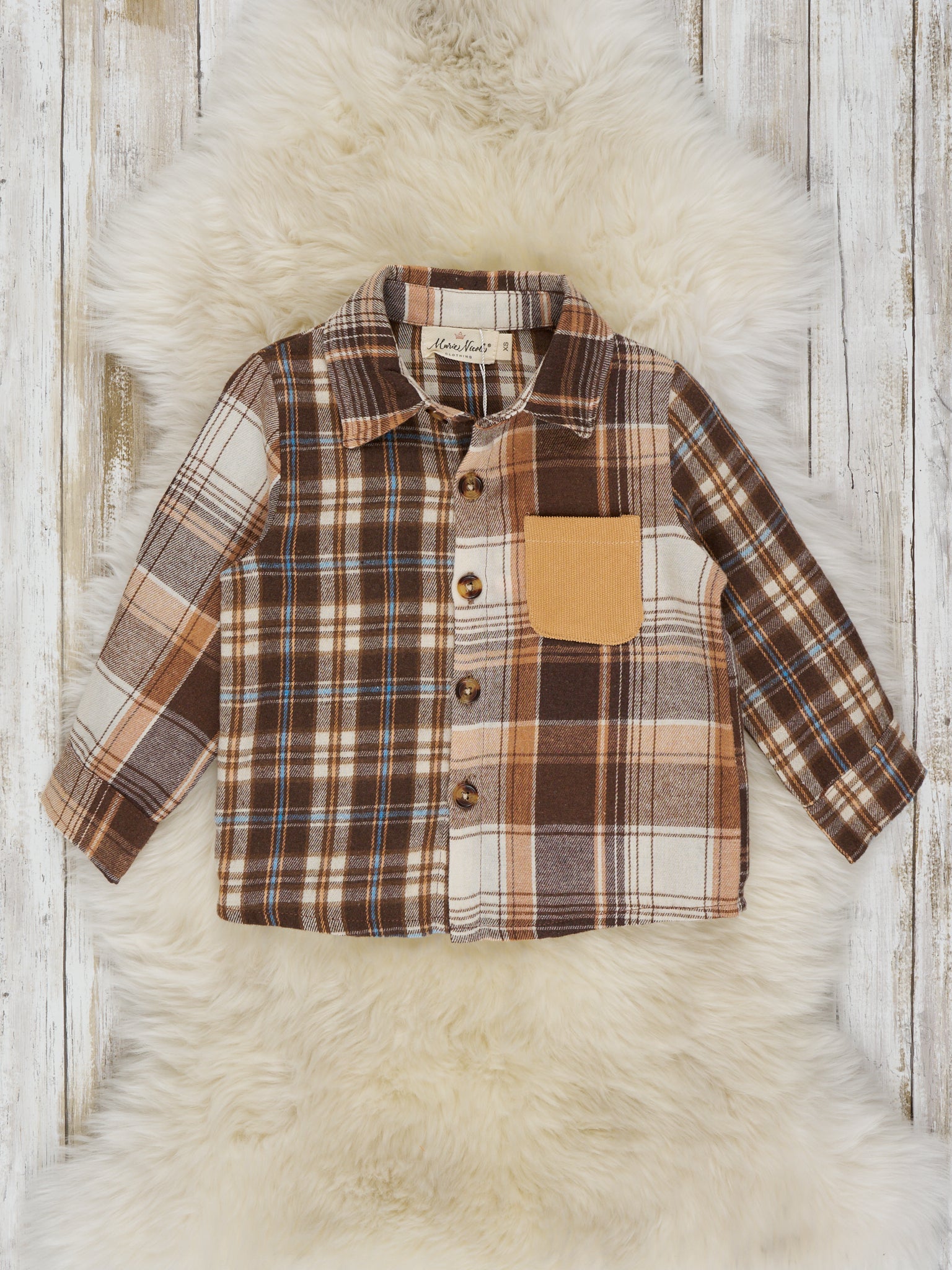 This button-up is perfect for kicking up fall leaves or sipping warm cider. Featuring a fun mix of brown plaid prints, light brown pocket, and functional buttons, this will be your little's fave the whole season!