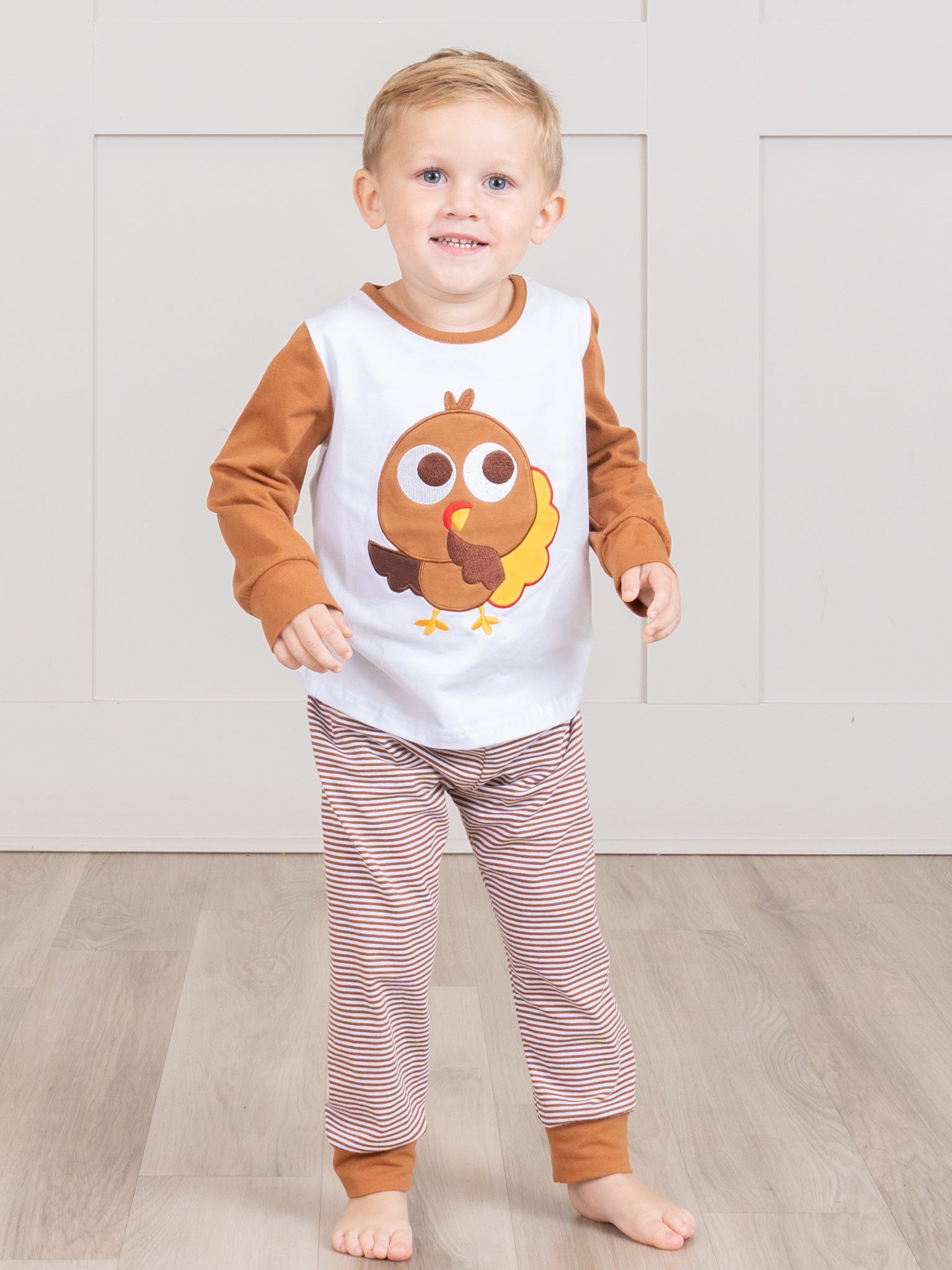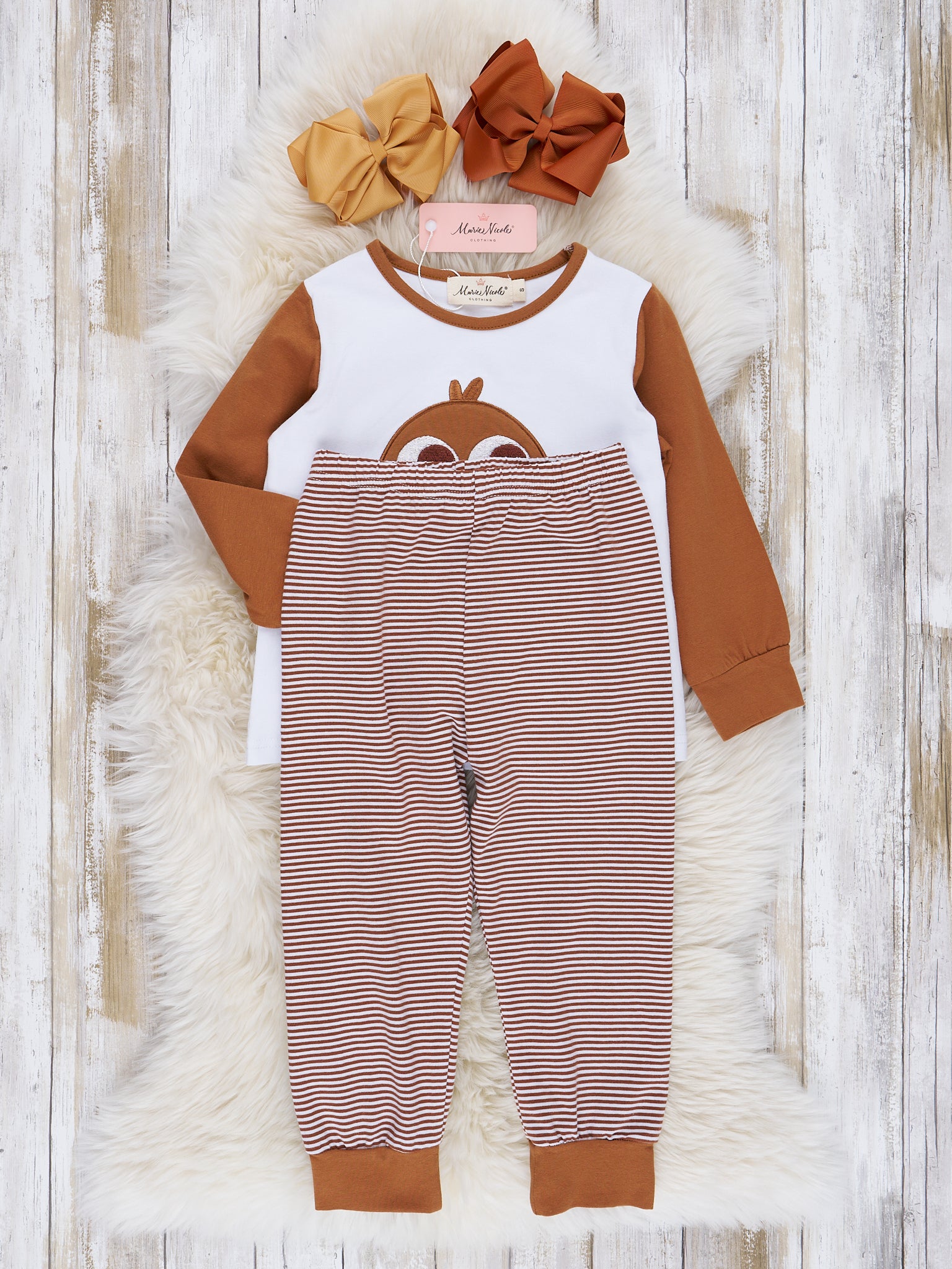 Be the envy of all your friends in these stylish Brown & White Turkey Pajamas! You'll be the top (hen?) of the pecking order wearing this cozy set featuring a cute turkey face and raglan sleeves. Who needs feathers when you can strut around in these pajamas? Gobble, gobble!