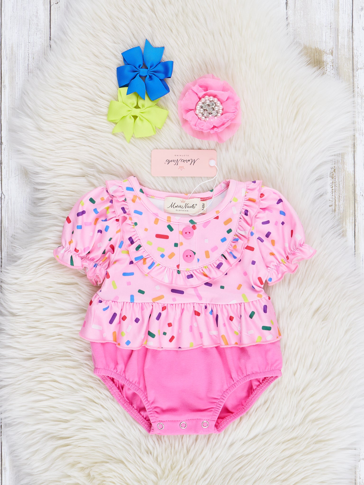 Satisfy your little one's sweet tooth with our Bubblegum Sprinkles sister set! This adorable bubble is perfect for summer with its playful ruffles and colorful sprinkles. Get ready for some cute and fun in the sun!
