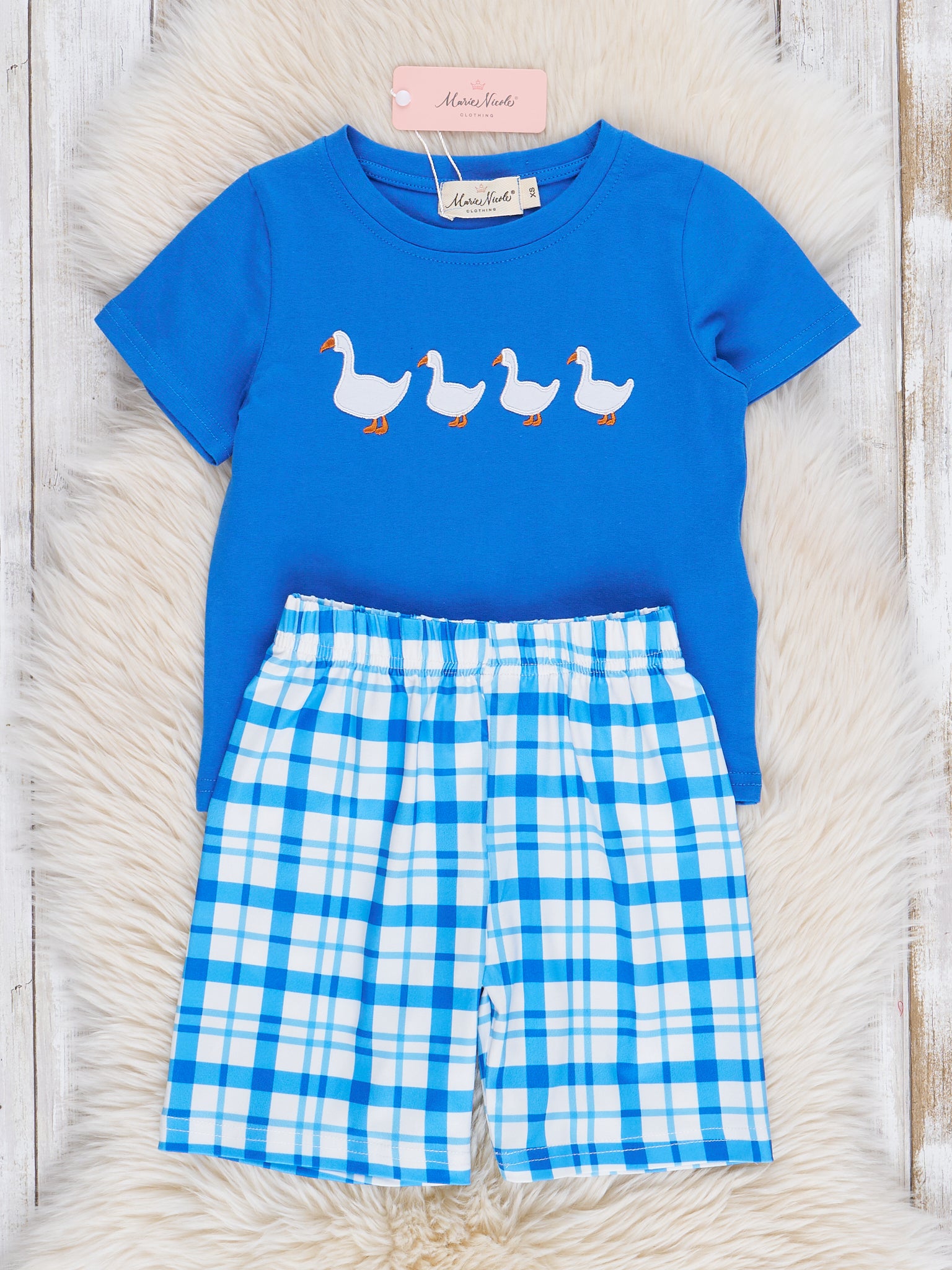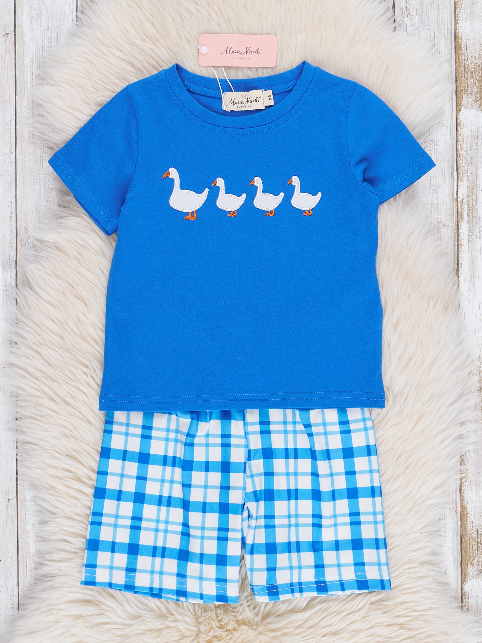 Dress your little duckling in this blue embroidered duckies outfit! The top features adorable embroidered ducks, while the plaid elastic waist shorts provide comfort and style. Perfect for any playful occasion, your little one will quack up in this cute outfit. Shop the full sibling set!