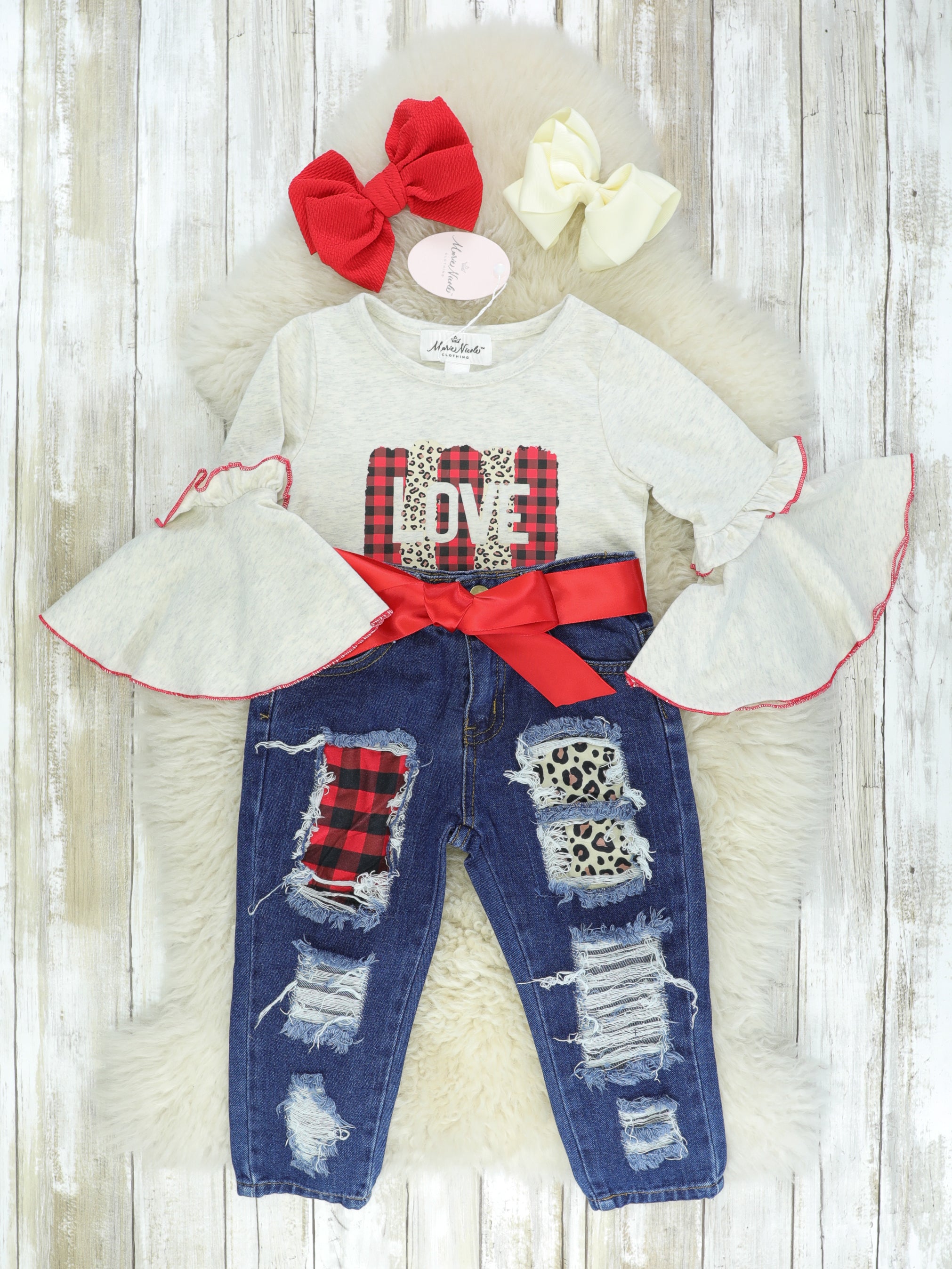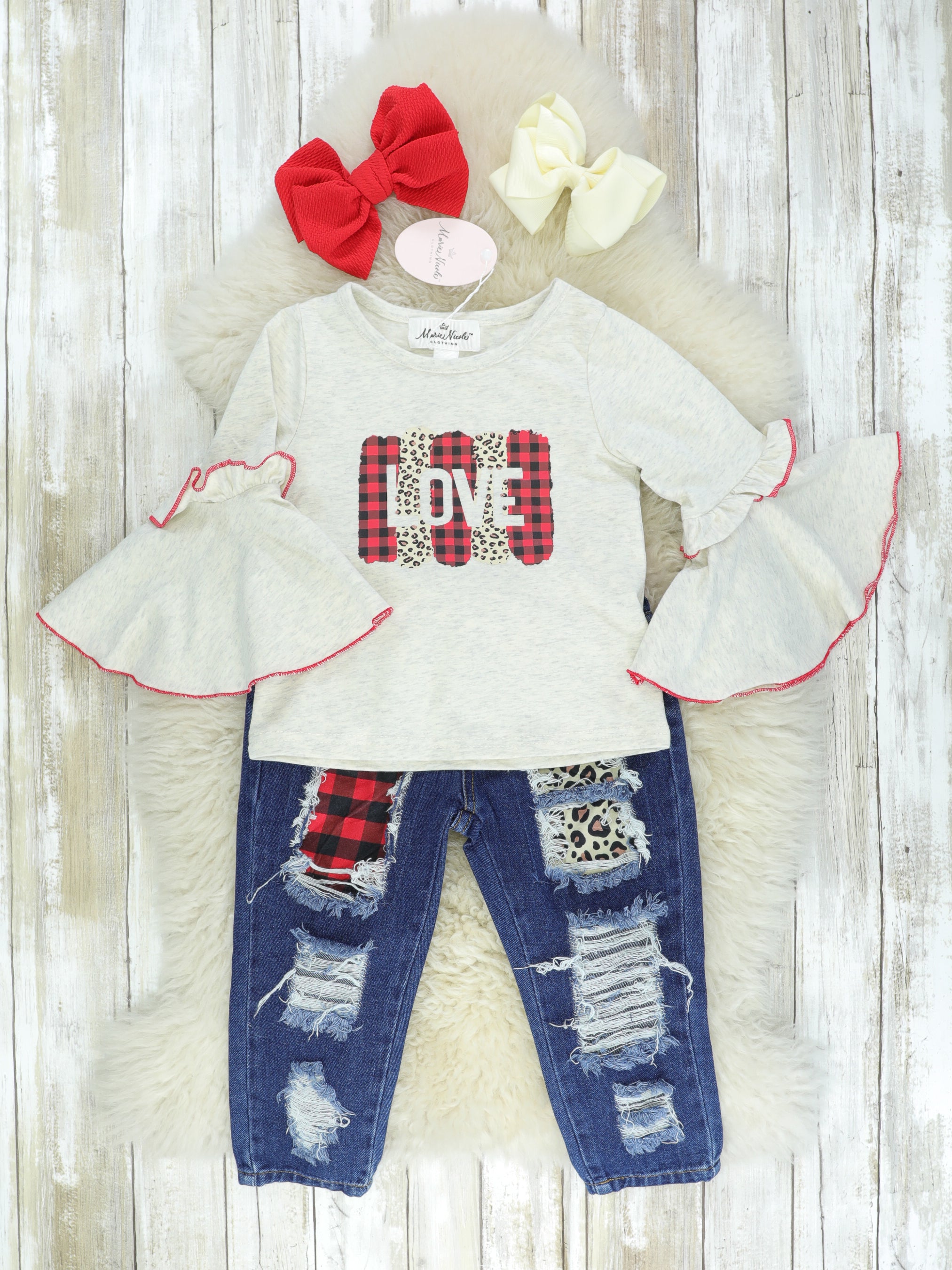 Buffalo Plaid Love Ruffle Top & Distressed Denim Pants Outfit
