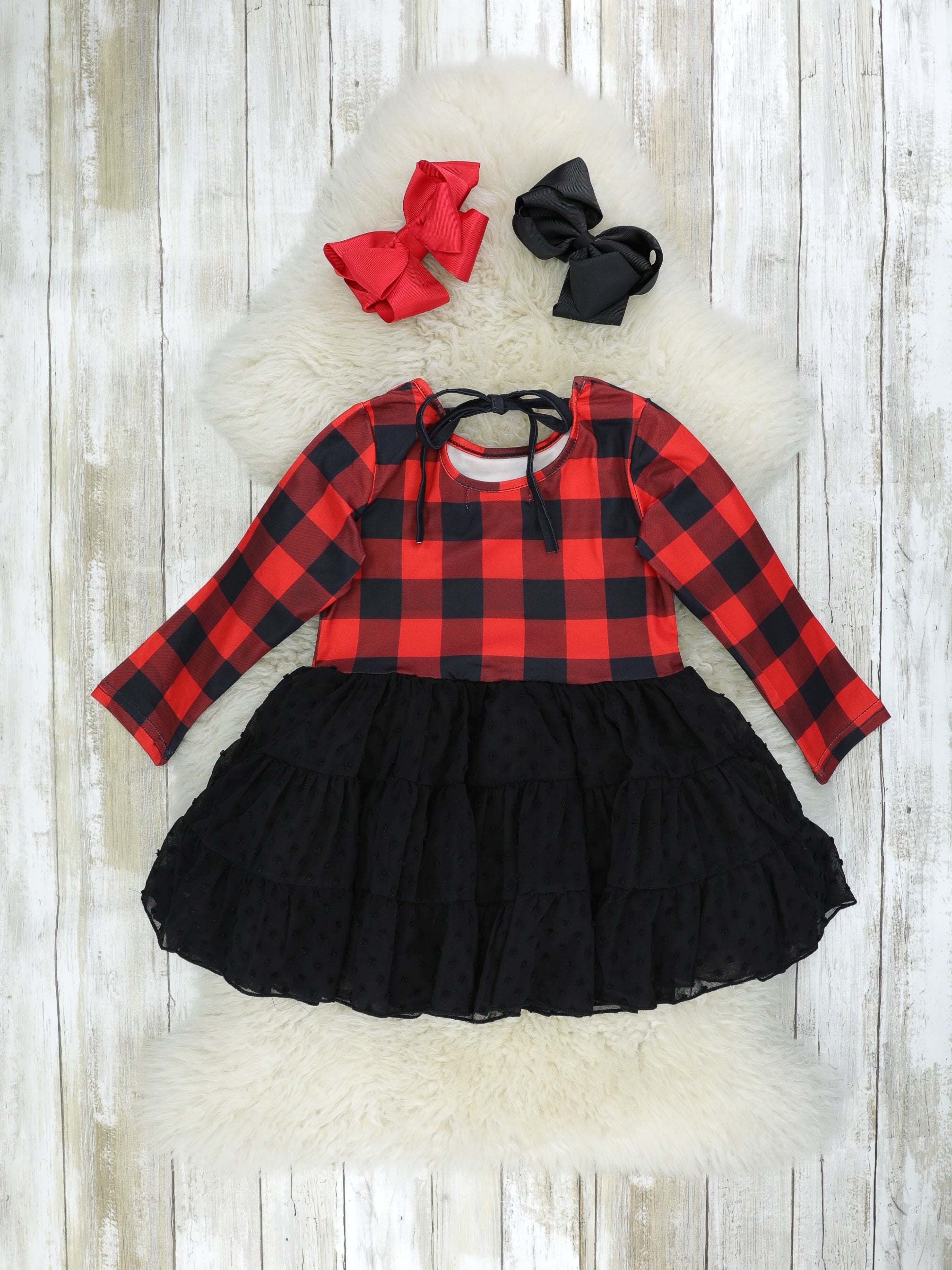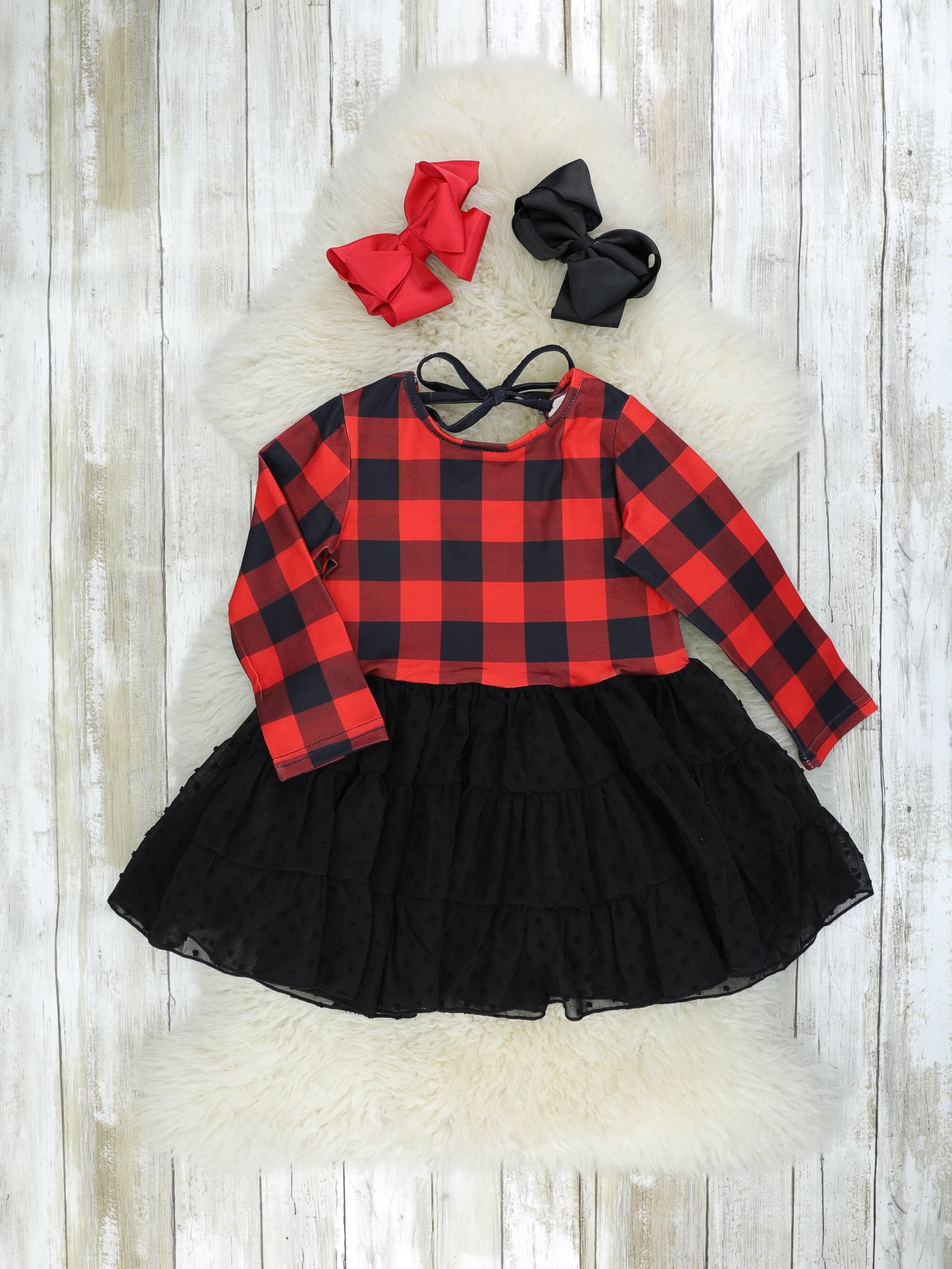 This darling dress is perfect for your swiss dot lovers! This dress features buffalo plaid, a lined swiss dot dress skirt, & a tie at the nape of the neck.