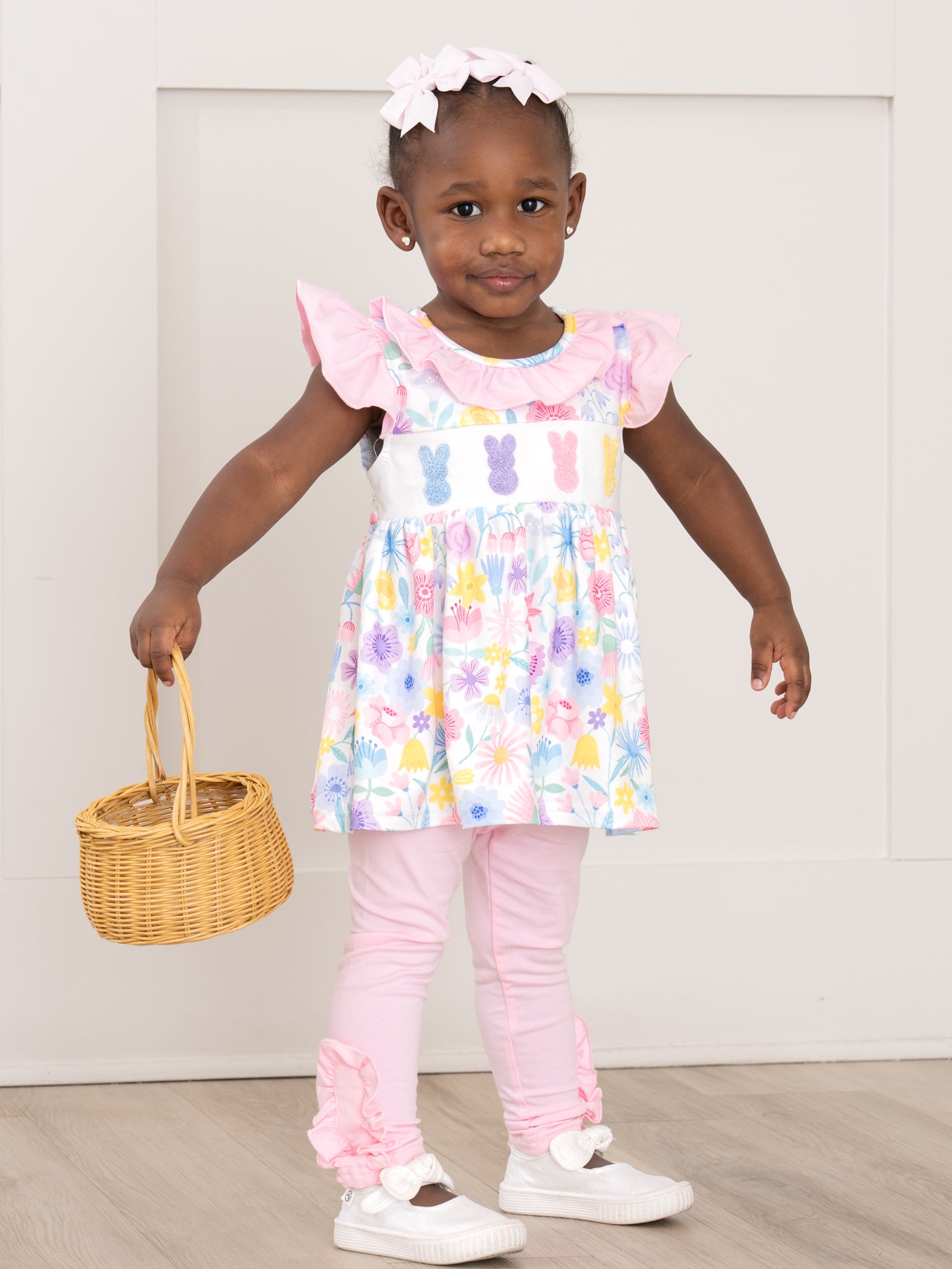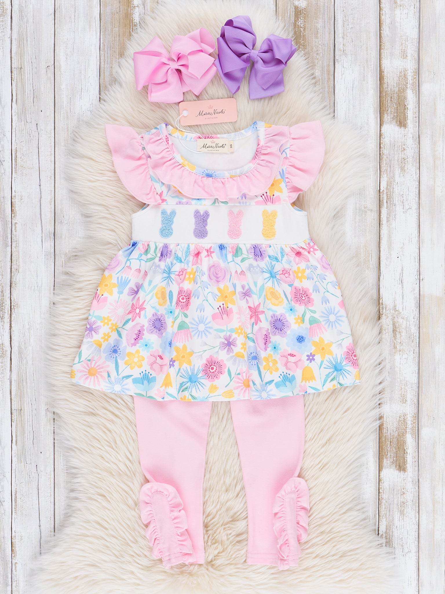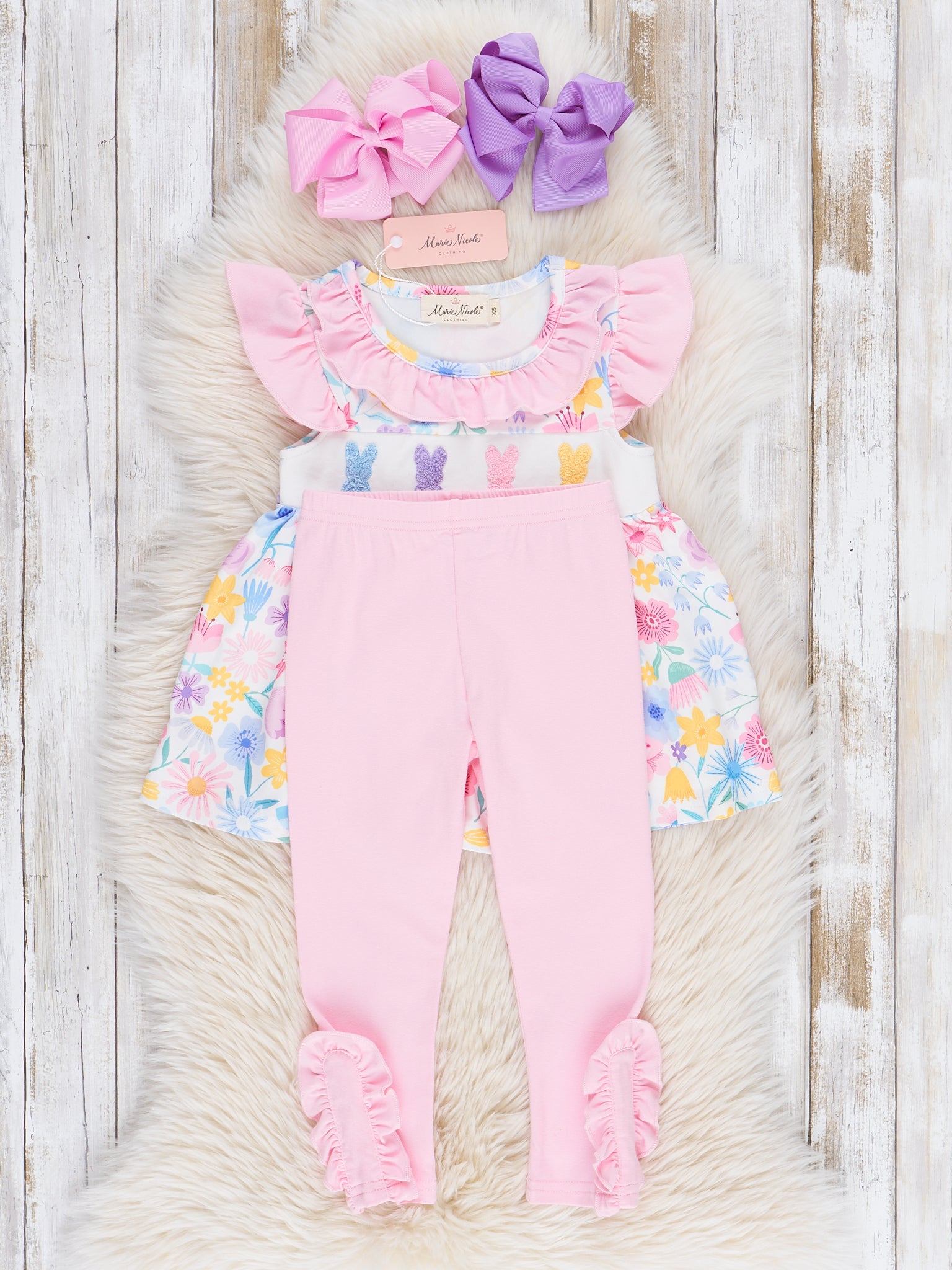 Hop into spring with this adorable Bunny Garden Embroidered Ruffle Outfit! This outfit boasts a top with a whimsical watercolor garden print and cute embroidered chenille bunnies. The matching ruffle leggings make it perfect for Easter or any springtime occasion.