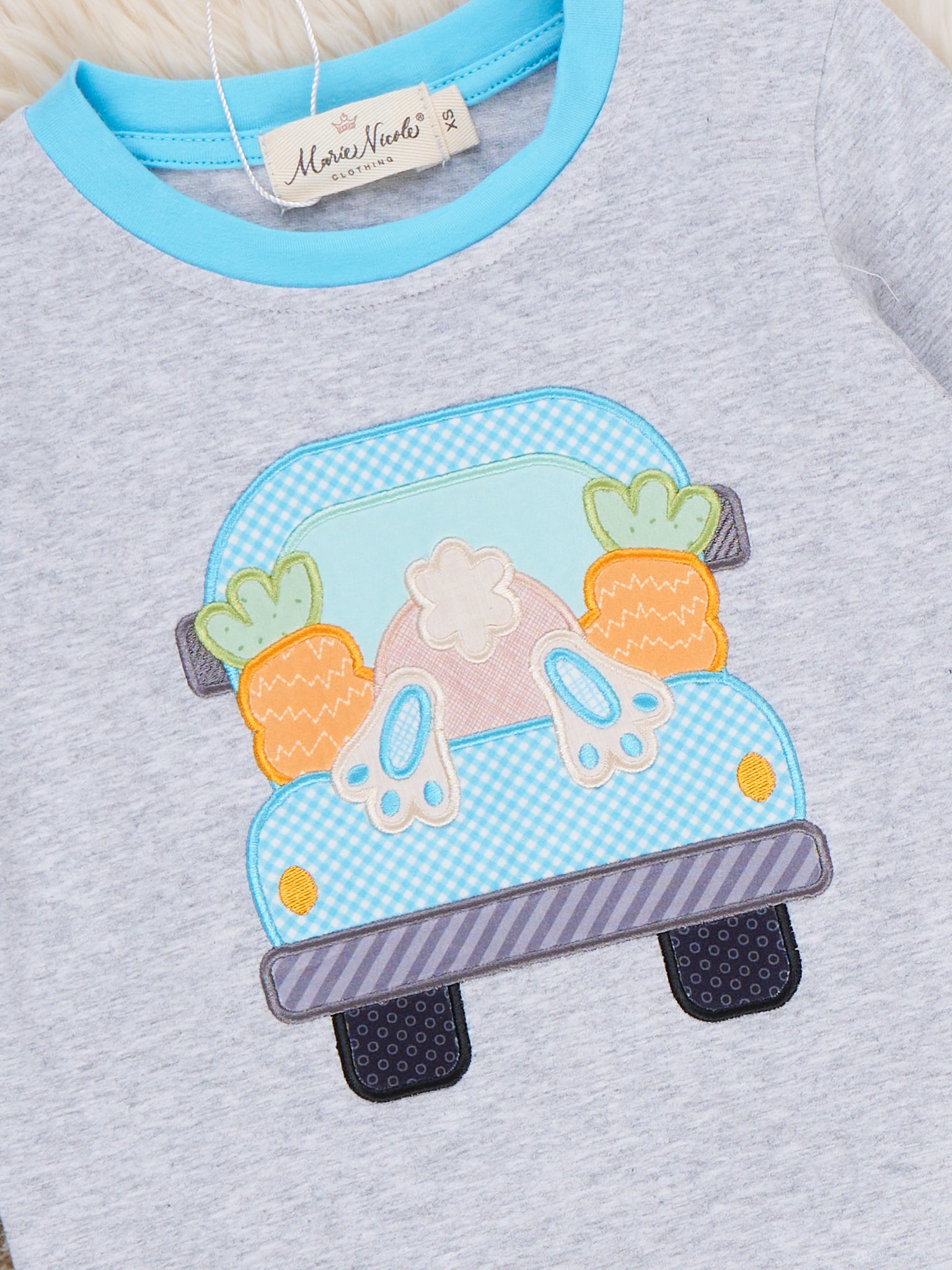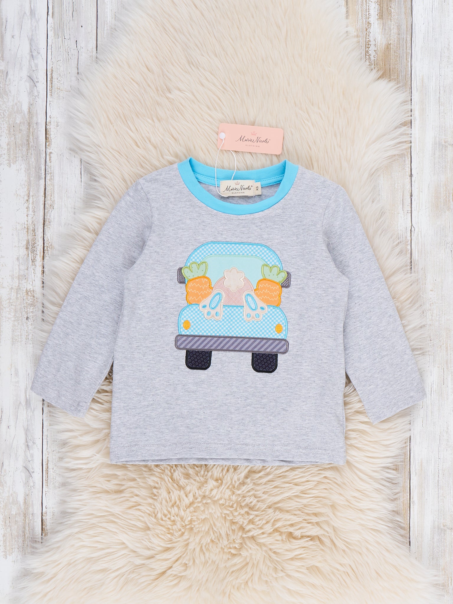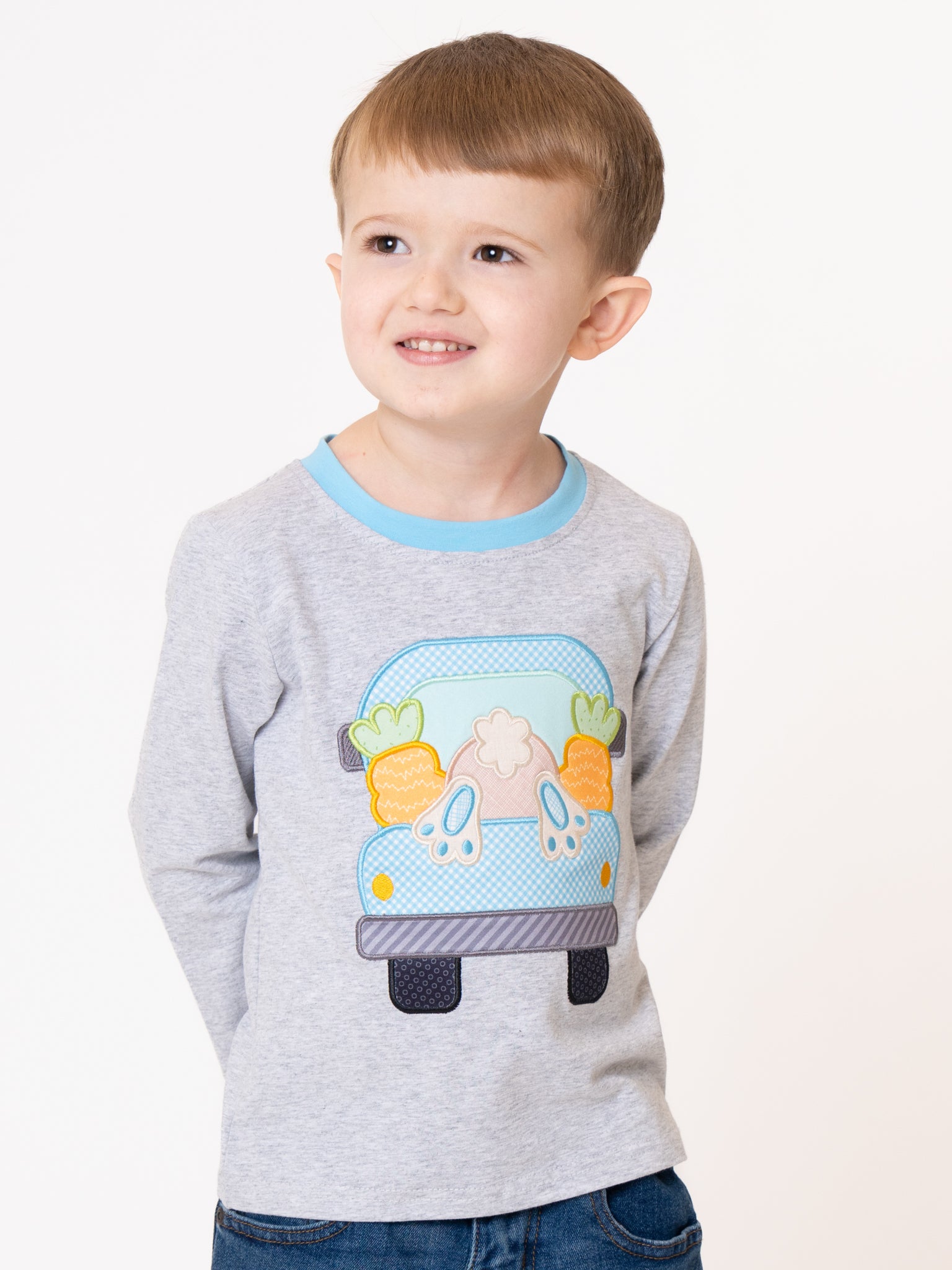 The Bunny Joyride Embroidered Cotton Shirt by Marie Nicole Clothing showcases a cheerful car-and-bunny applique on a soft long-sleeve tee, bringing playful charm to everyday outfits. The relaxed fit and smooth knit fabric keep little ones comfy for play, errands, and family outings. Pair it with joggers, jeans, or shorts for an easy, festive look during spring and Easter fun.