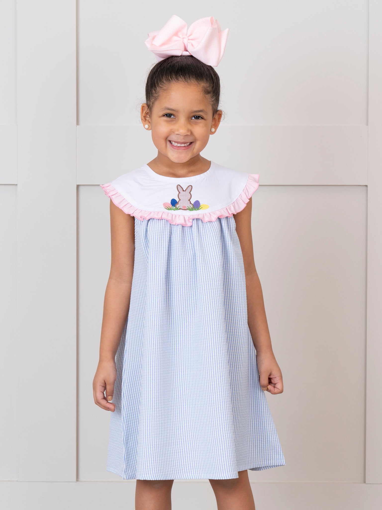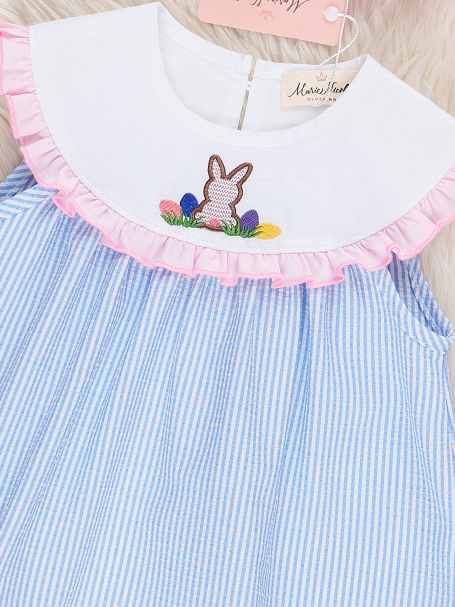 This Bunny Vintage Embroidered Poplin Ruffle Dress is perfect for your dainty girls! This dress by Marie Nicole Clothing features stripes, a white round neckline, an embroidered bunny, & ruffle trim.