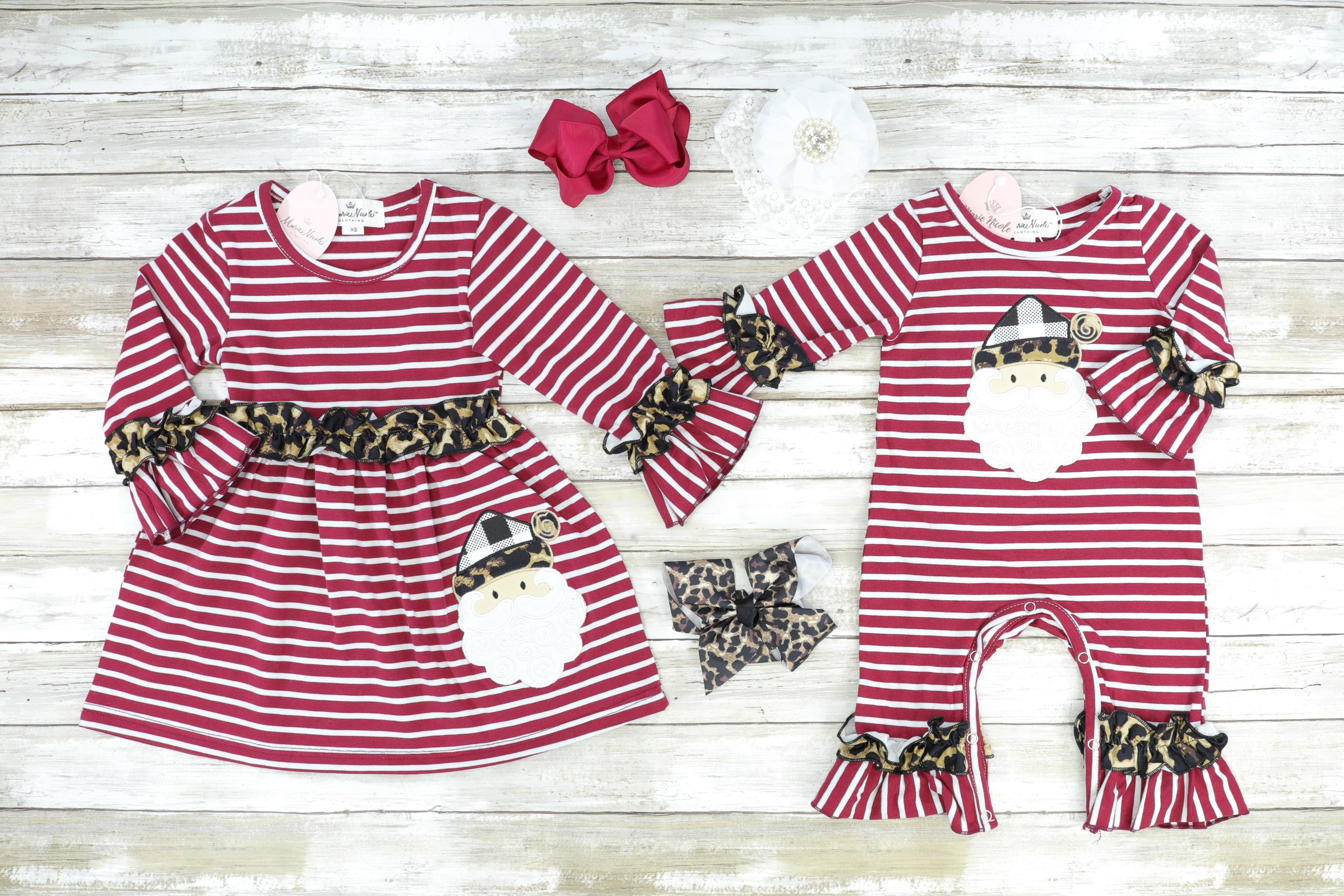 The perfect holiday dress for your trendy little one! This long sleeve ruffle dress has a burgundy and white striped pattern, leopard print ruffles, and a Santa design. Shop the romper here!