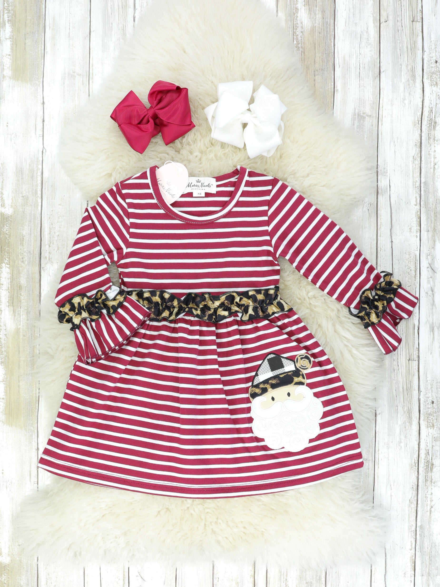 Burgundy Striped Leopard Santa Ruffle Dress