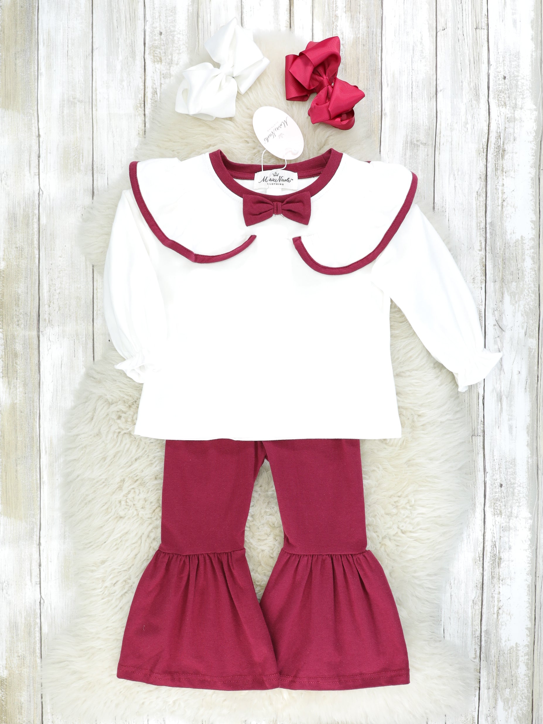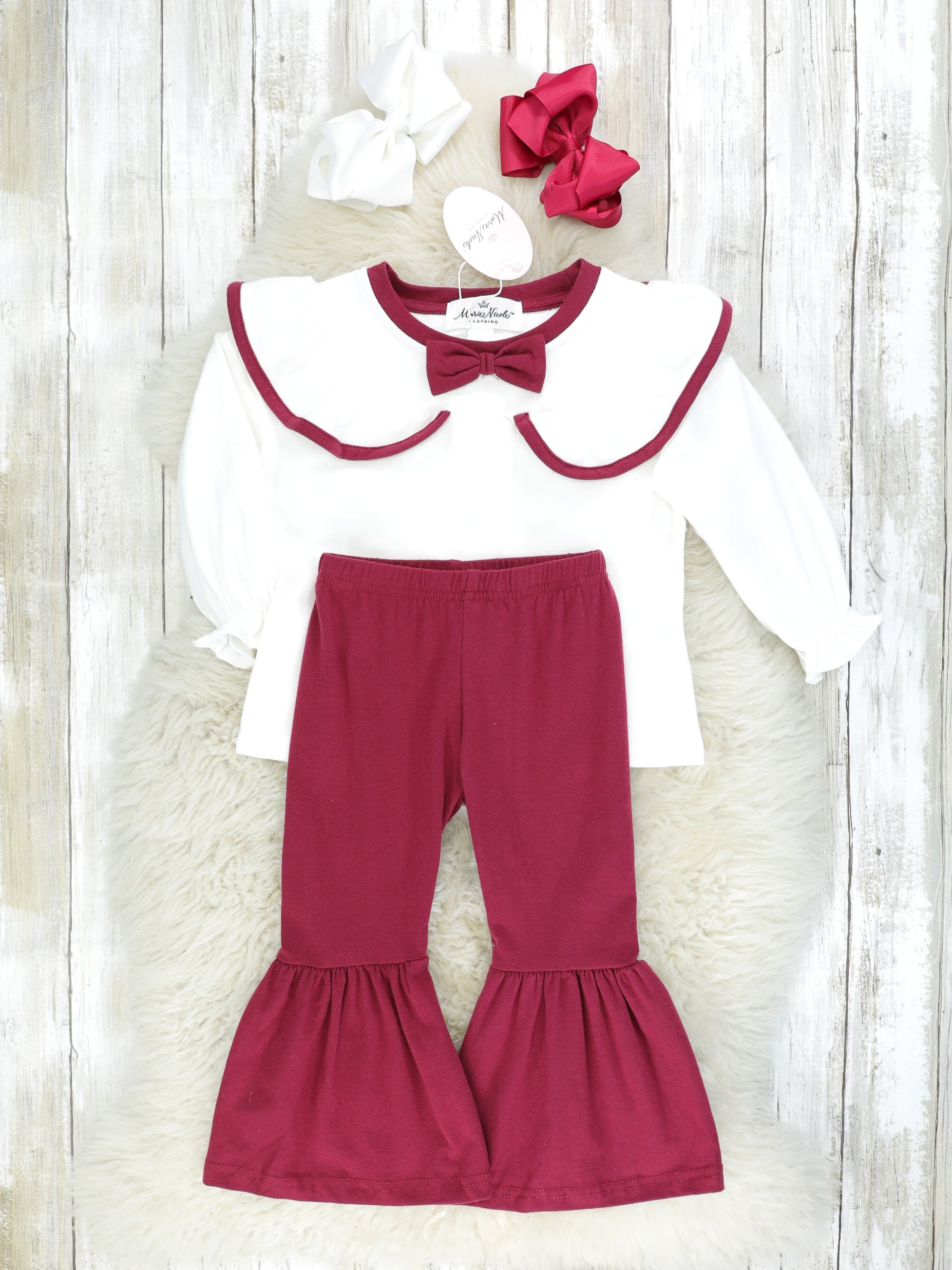 This darling outfit is perfect for fall days! This outfit features a white top with flutter trim, cinched sleeves, a bow detail, & maroon bell bottoms.
