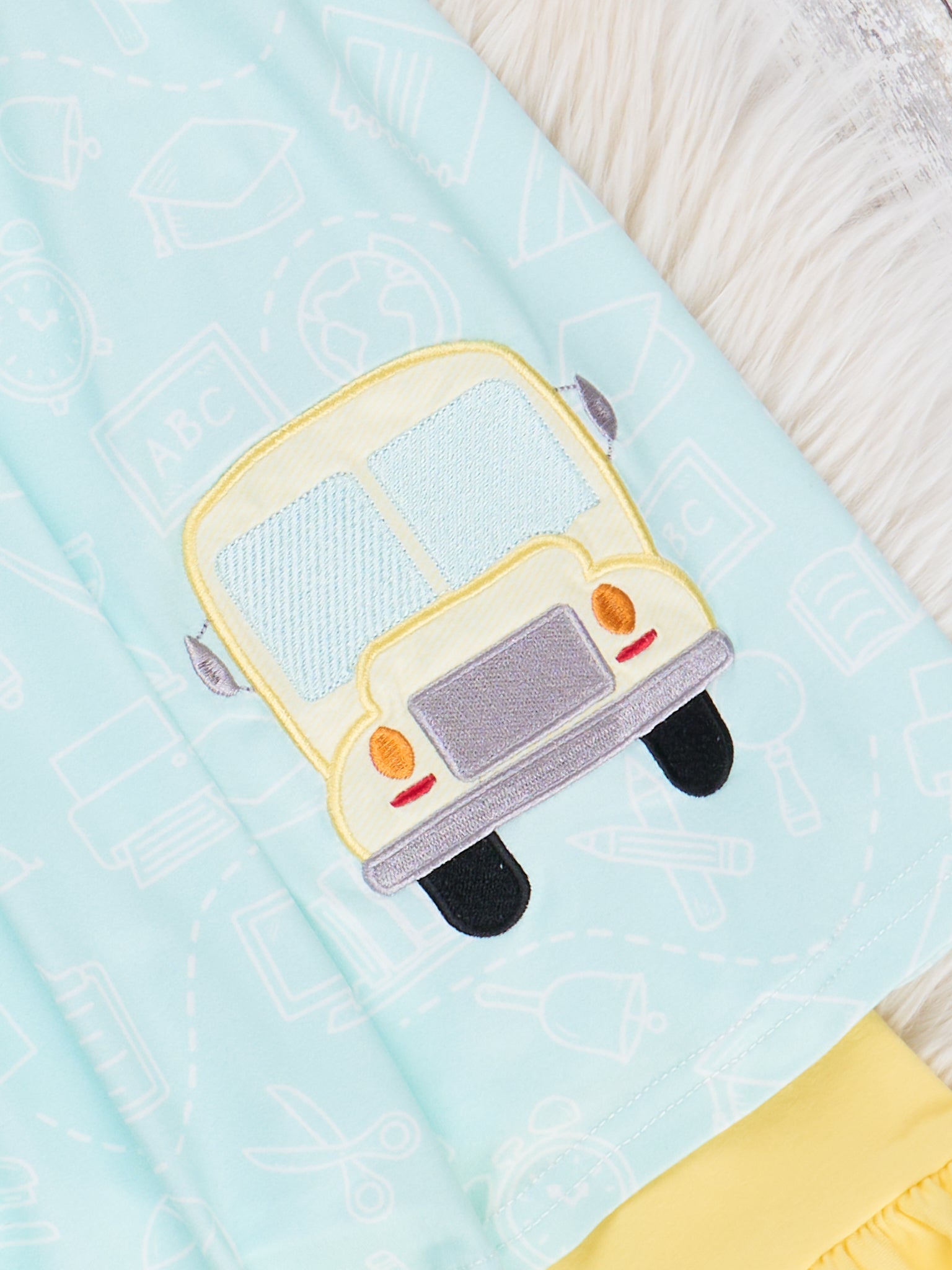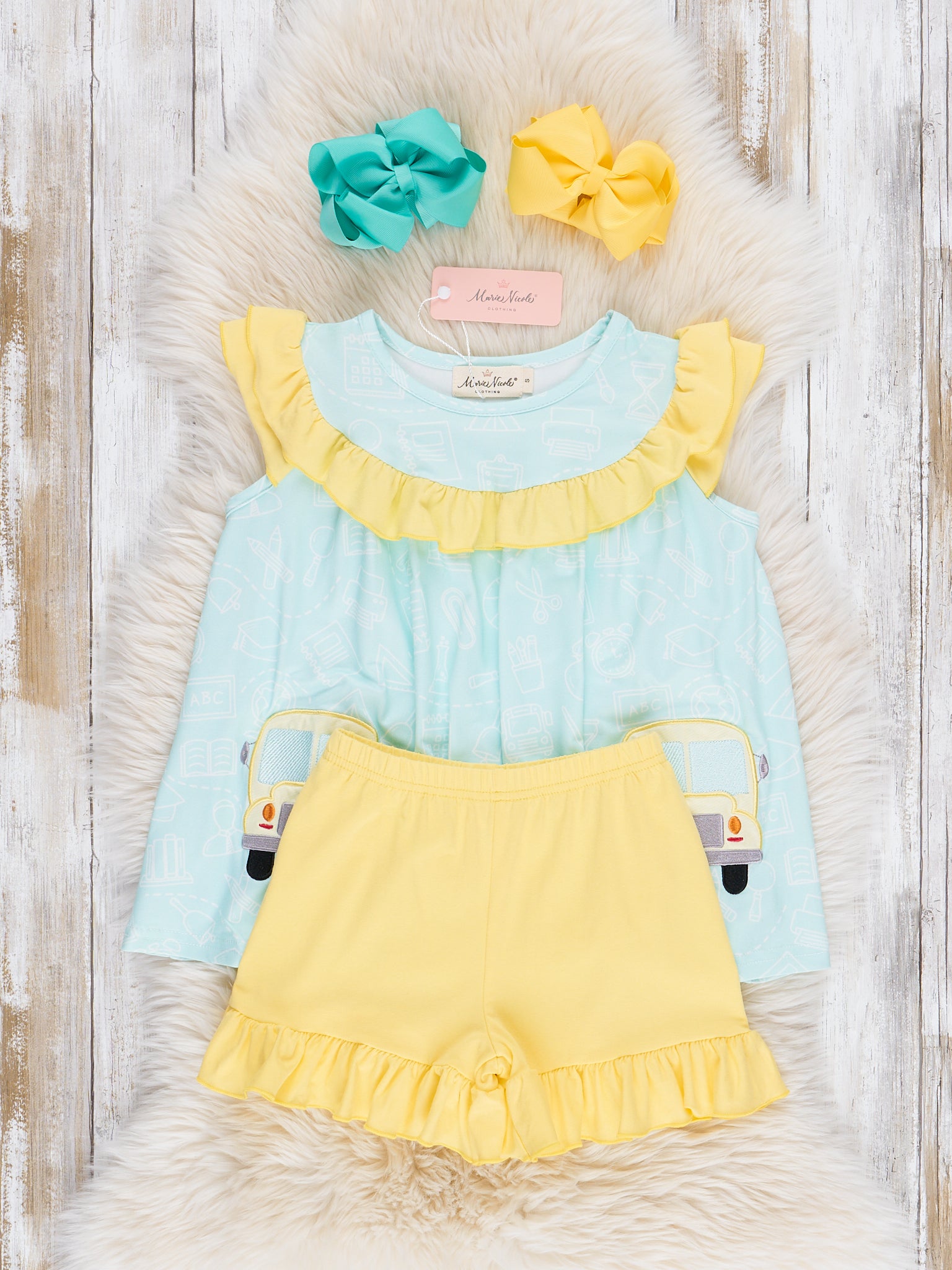 The Bus Rider Embroidered Ruffle Outfit is a bright and cheerful choice for your little one's big school adventures. Featuring adorable school bus embroidery and finished with sweet ruffle details, this outfit from Marie Nicole Clothing adds a fun, classic touch to any back-to-school wardrobe. Soft, breathable, and easy to move in, it’s perfect for classroom days, morning routines, and first-ride photo ops.