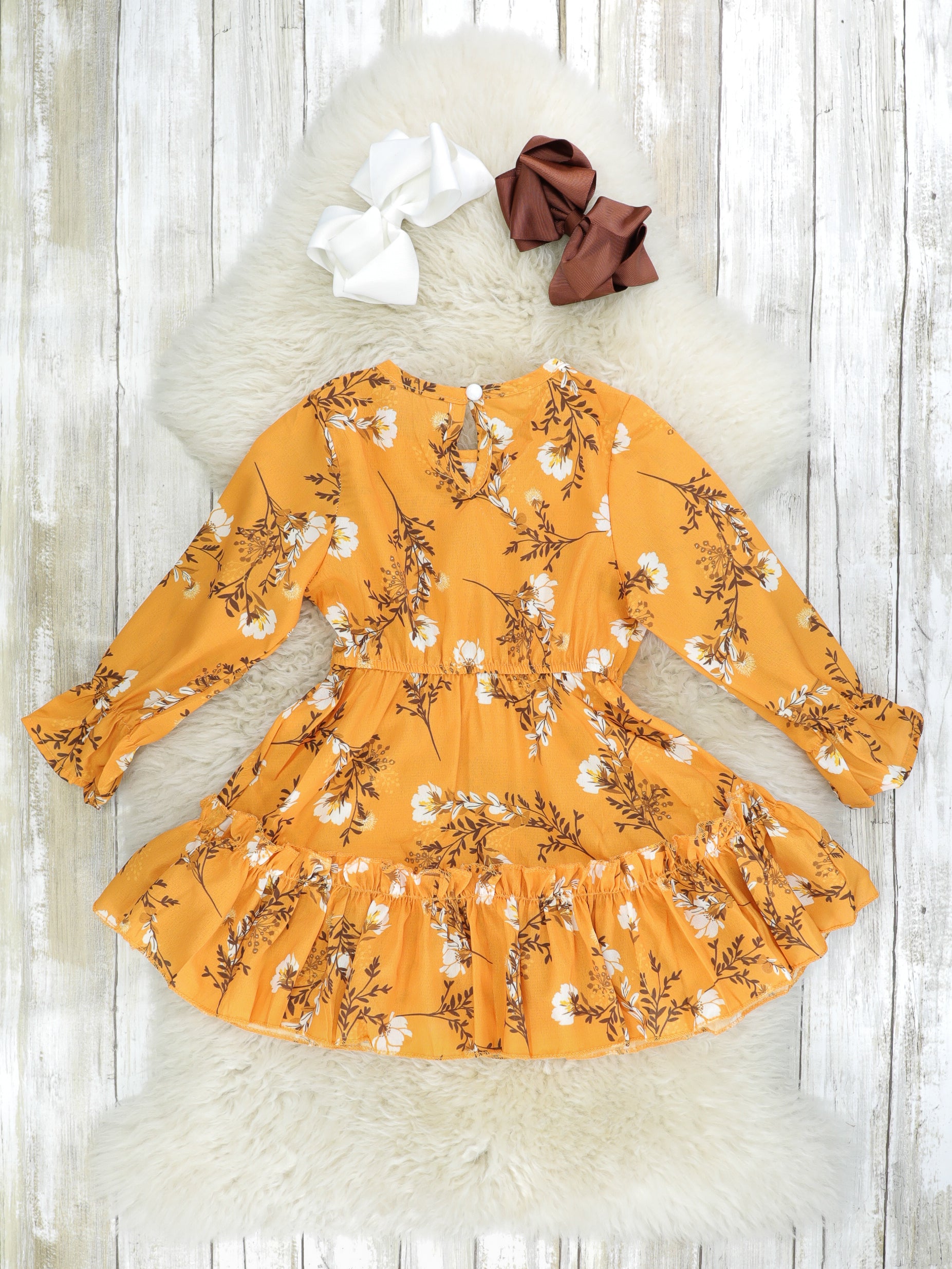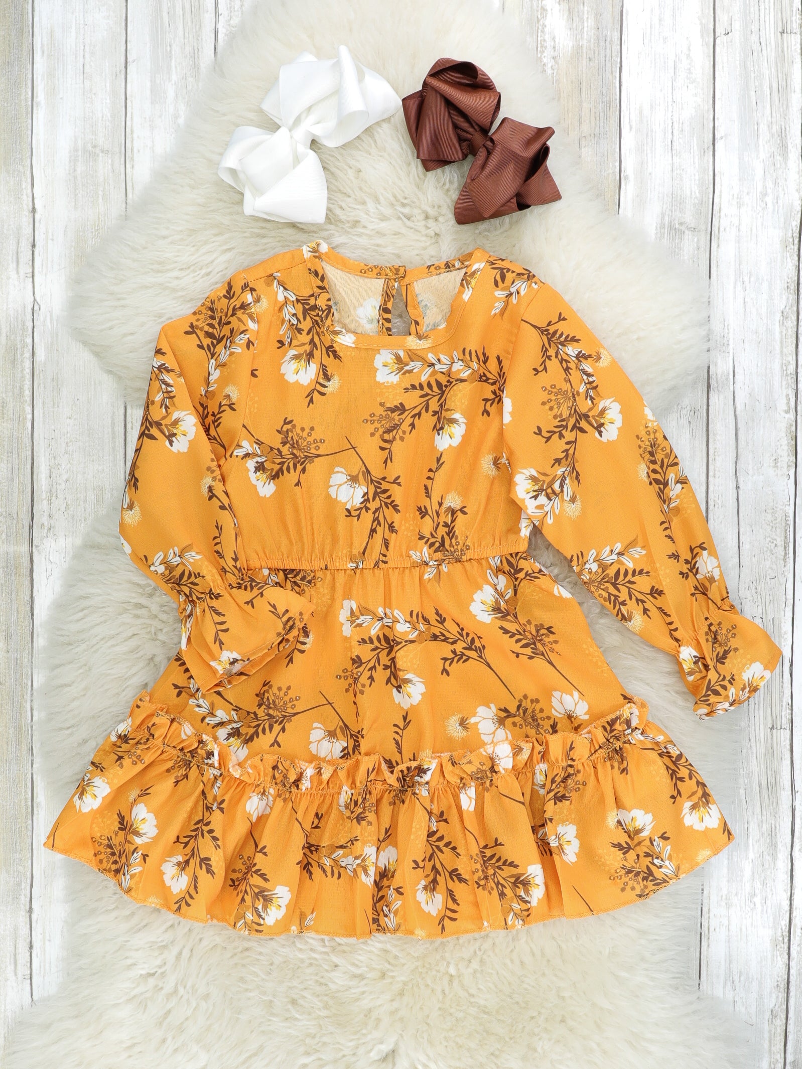 This darling dress is a fall favorite! This camel dress features sweet florals, cinches at the wrists, ruffle details, & a keyhole at the nape of the neck for easy changing.