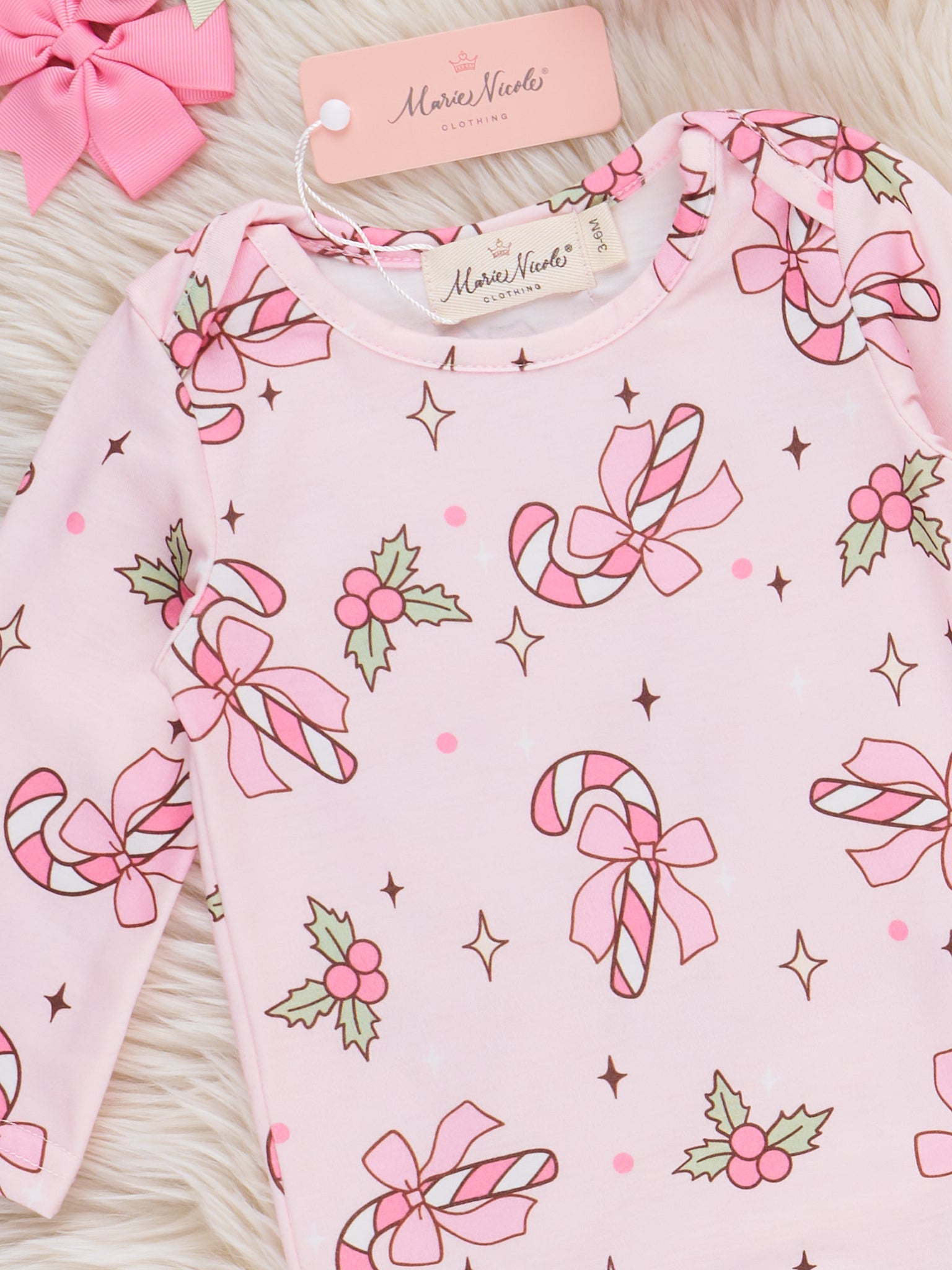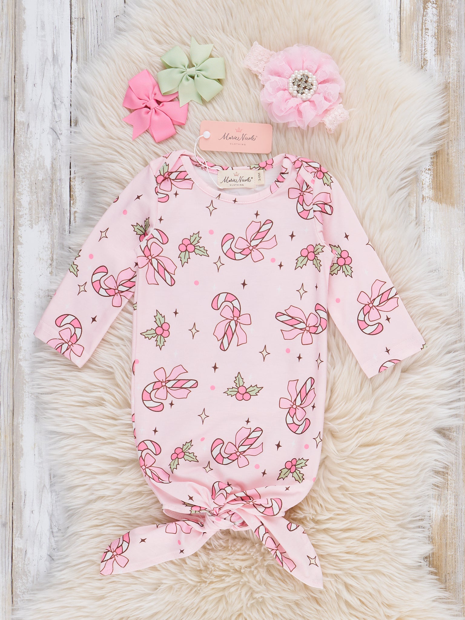 The Candy Cane Snuggle Knot Gown by Marie Nicole Clothing is a cozy sleep gown featuring a sweet candy cane print on soft, stretchy fabric, designed for easy changing and all-night comfort. This gown’s gentle construction provides warmth and flexibility, making it an ideal choice for holiday nights or everyday snuggling for infants.