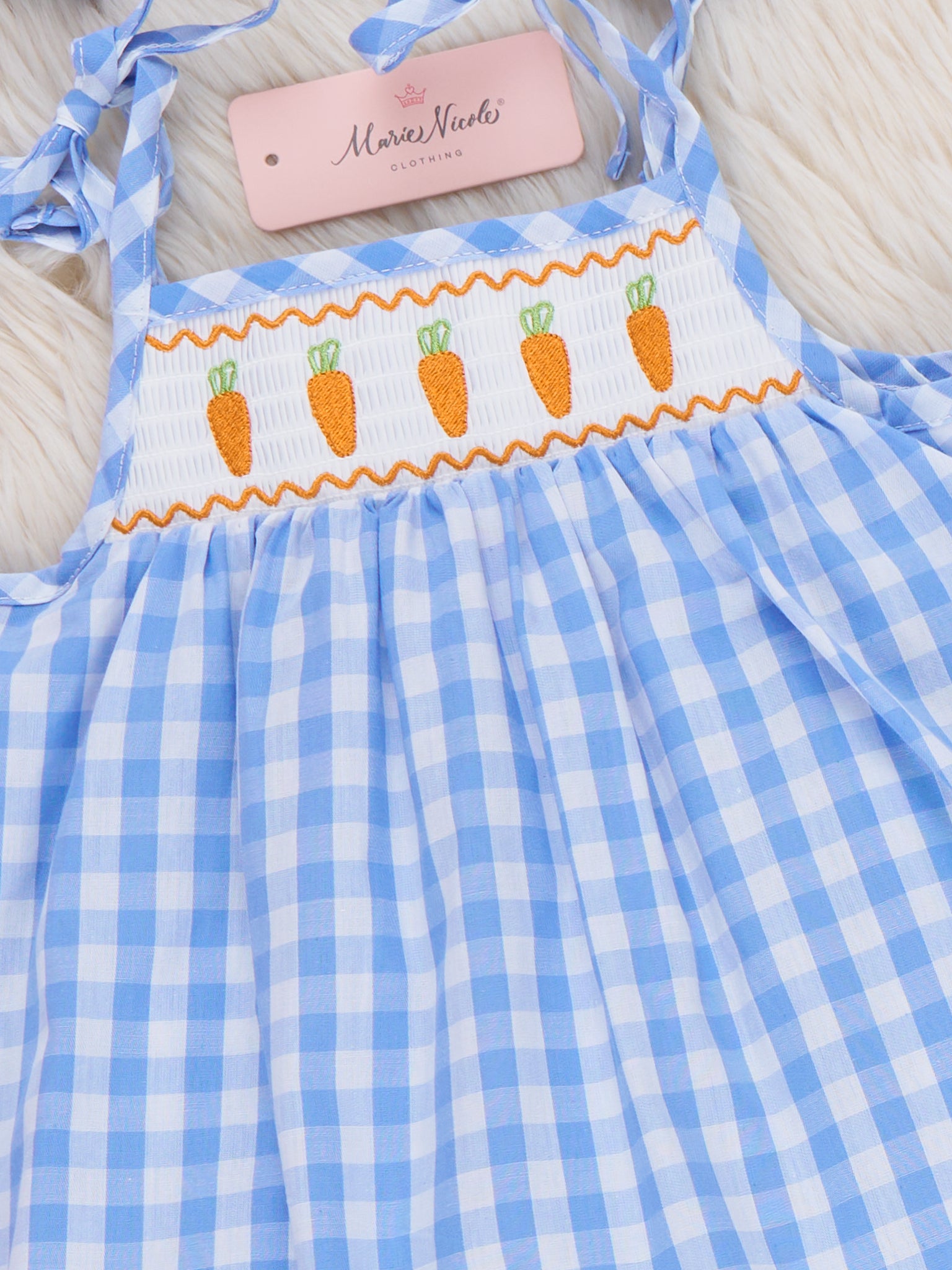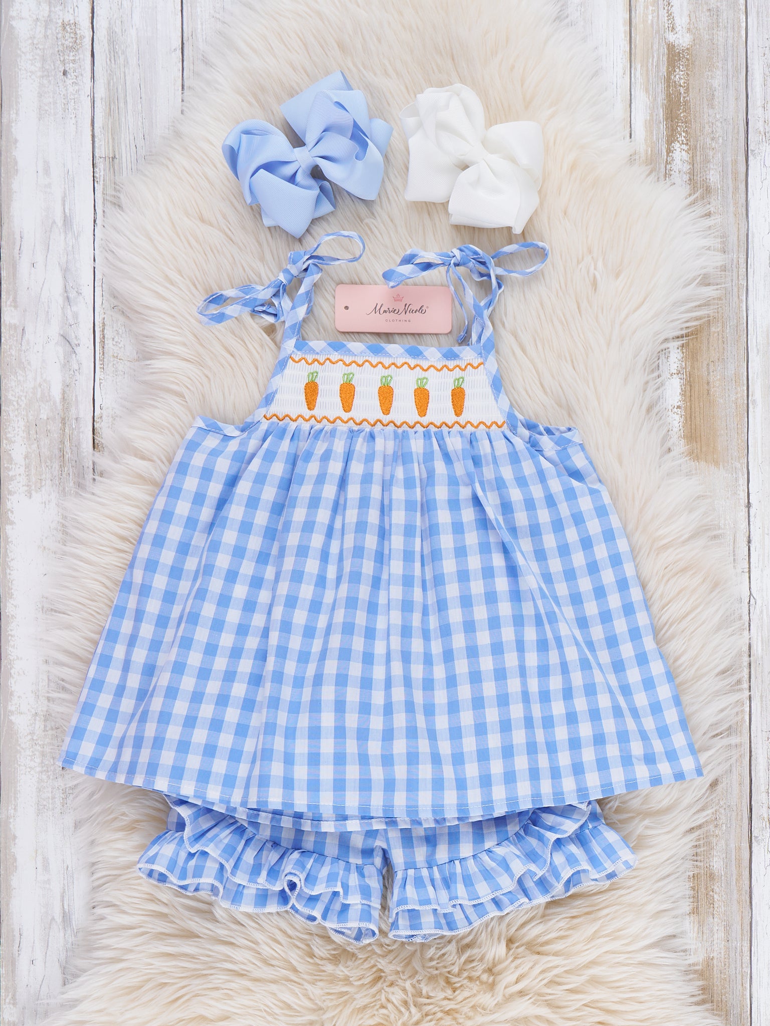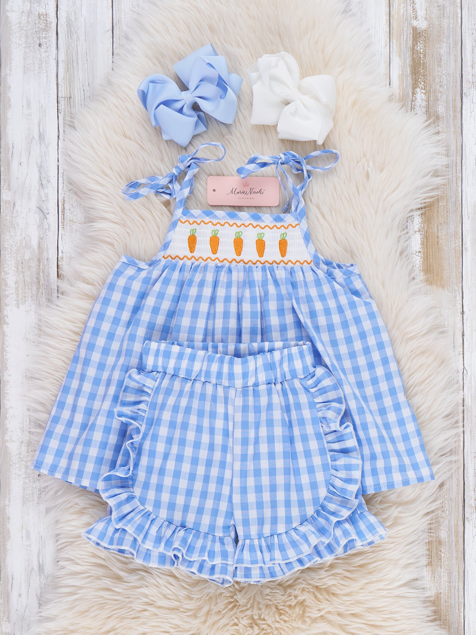 Carrot Parade Plaid Smocked 100% Cotton Outfit by Marie Nicole Clothing pairs a swingy gingham top with tie straps and a smocked carrot border with coordinating ruffle-hem shorts for a playful spring set. The soft, breathable fabric and elastic waist keep little ones comfy for egg hunts, park days, and picture-perfect Easter fun.