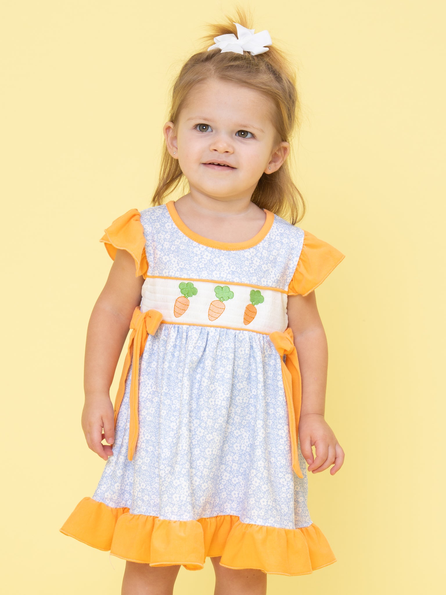 Carrots Trio Smocked Ruffle Dress by Marie Nicole Clothing features a smocked bodice with embroidered carrot accents, flutter ruffle sleeves, and playful side ties for a twirl-ready silhouette. The gathered skirt and comfortable fit make it ideal for spring festivities, family gatherings, or sweet everyday moments. Soft, easy-care fabric ensures cheerful style and movement for all-day wear.
