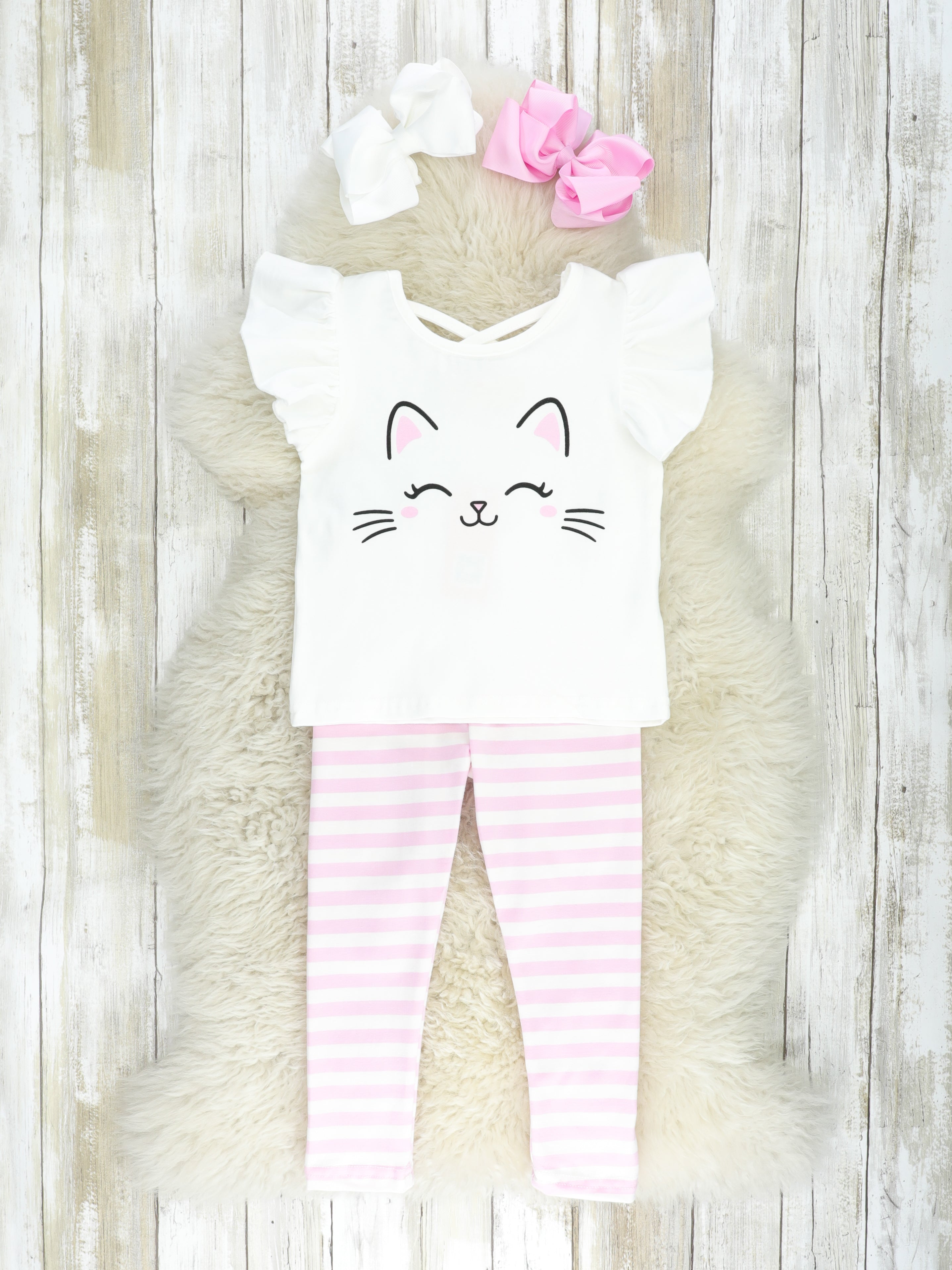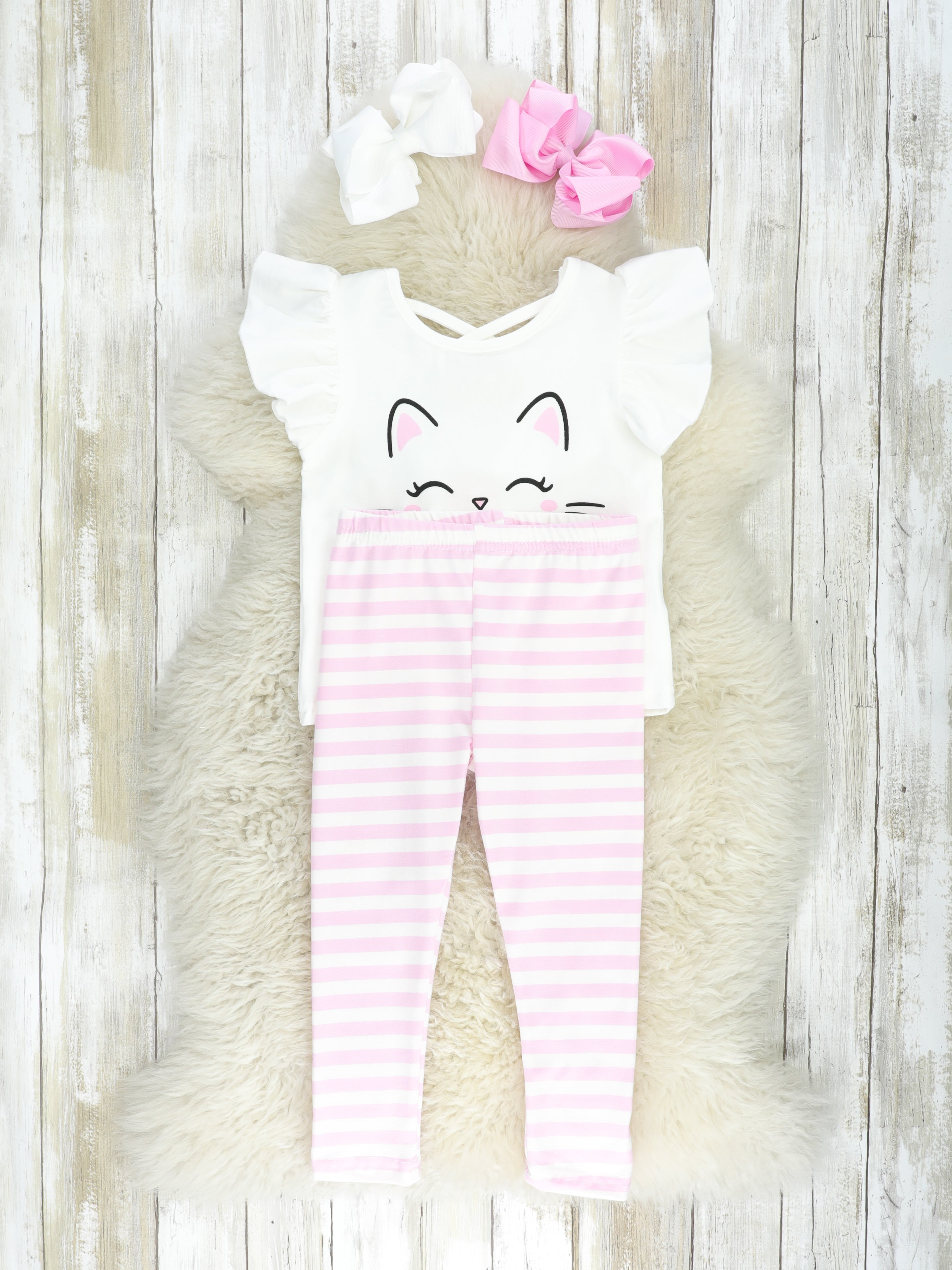 Let your little one feel purr-fectly stylish in this Cat Outfit! With its adorbs cat detail, and flouncy ruffles, you'll have your kiddo looking - and feeling - like the cat's meow! The included striped leggings give your cutie pie a dapper final touch. Meow!