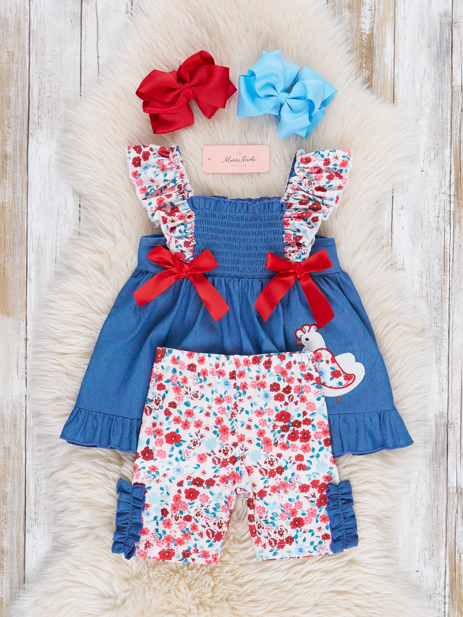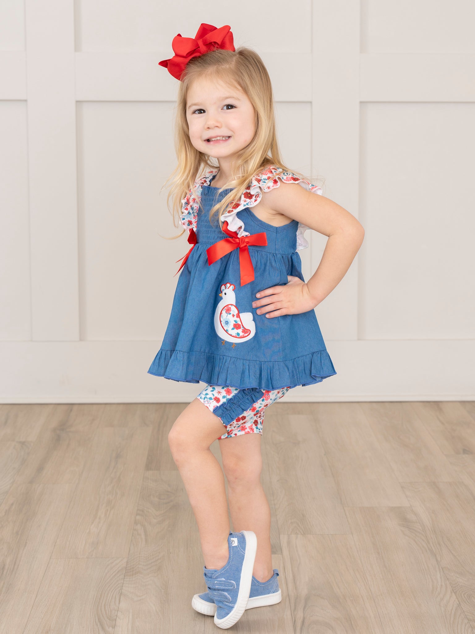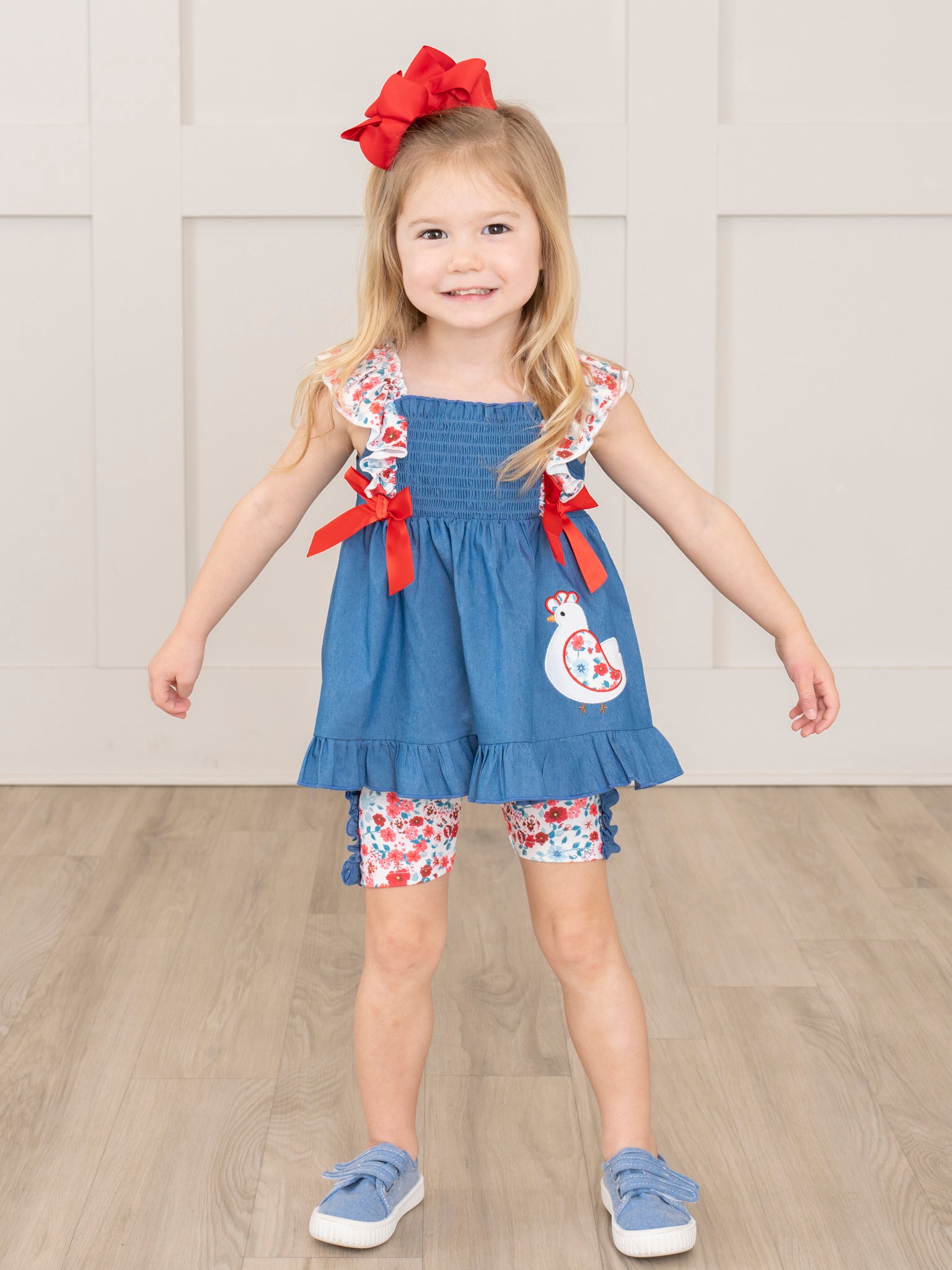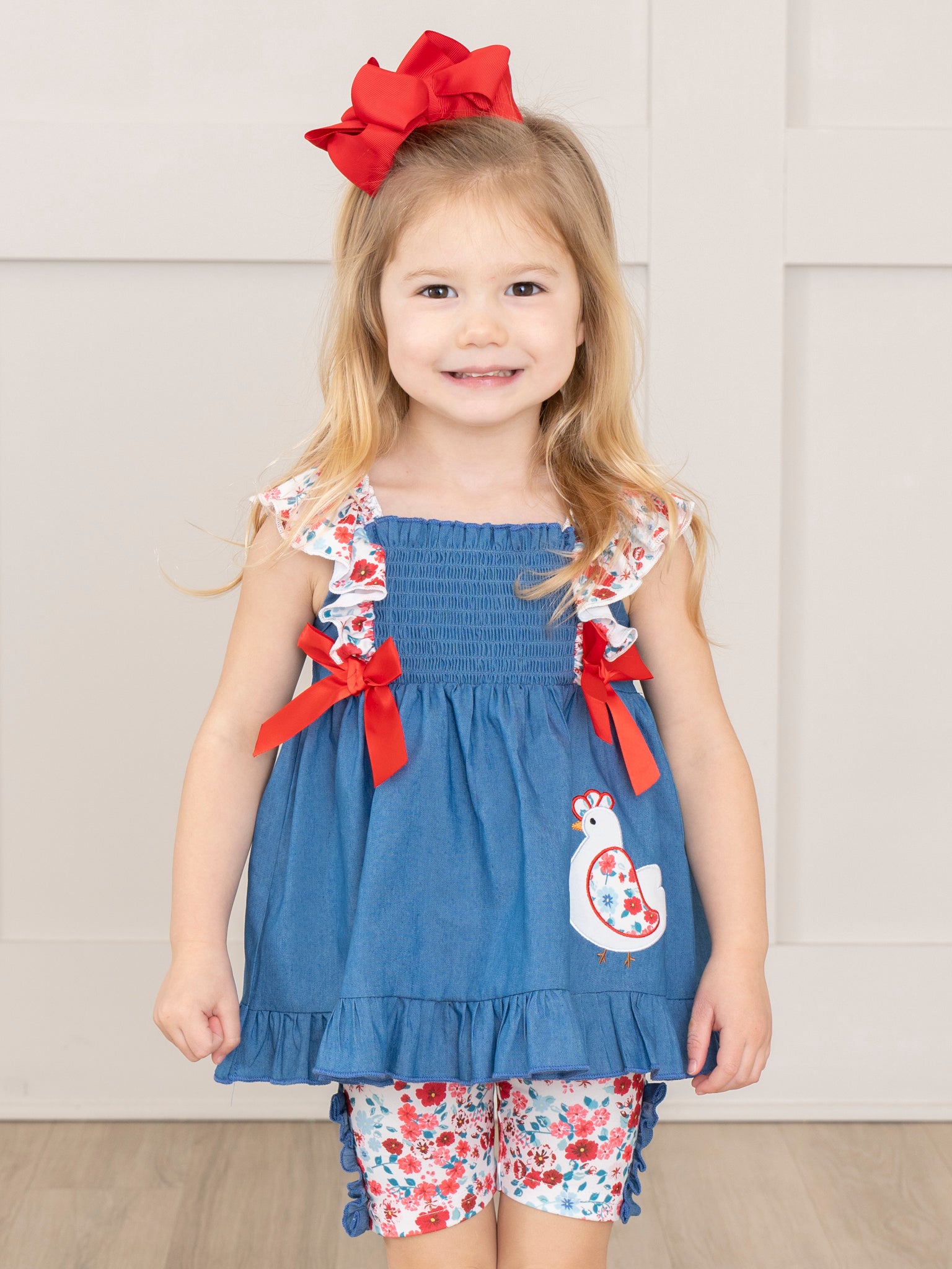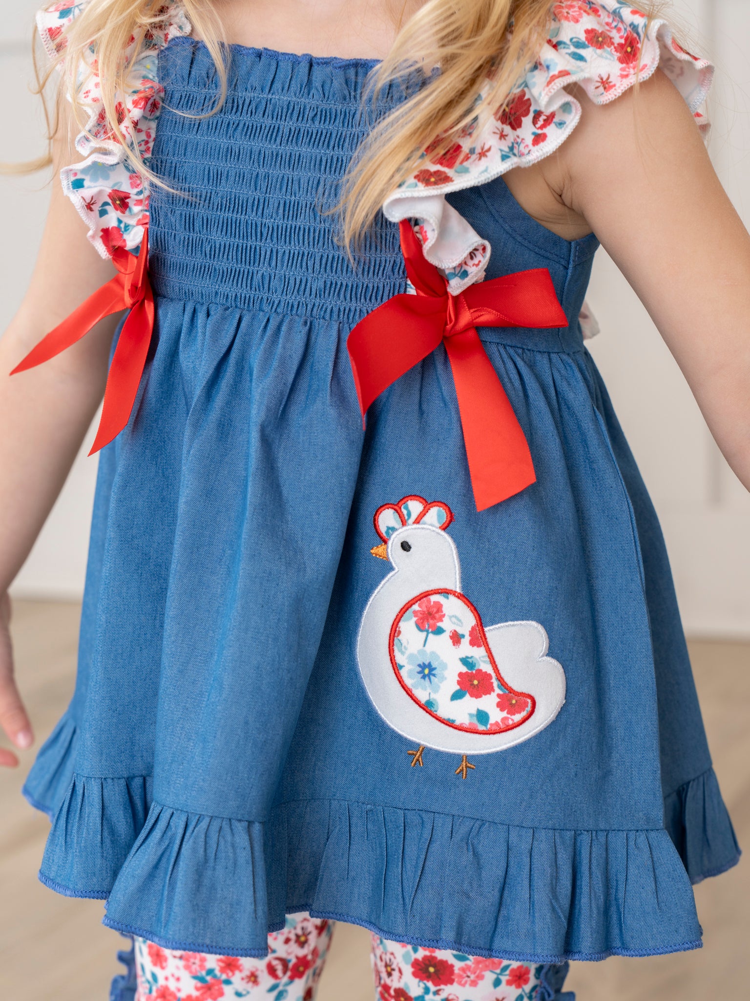 Unleash your little one's inner chick with this adorable Chambray Embroidered Floral Chicken Ruffle Outfit. Featuring a playful floral embroidered chicken, charming floral ruffles, and pretty red bows, this outfit is perfect for a sibling set. Made by Marie Nicole Clothing, it's a stylish and fun must-have for any girl's wardrobe!