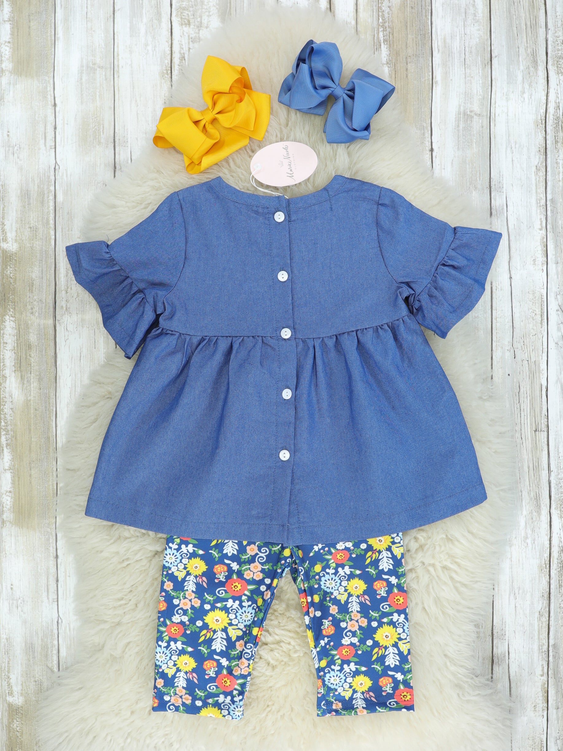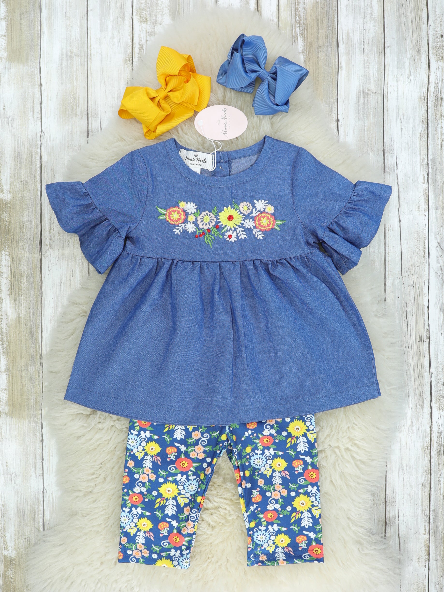 There is nothing more classic than an embroidered chambray top and matching floral capris! The buttons all down the back are the sweetest addition.