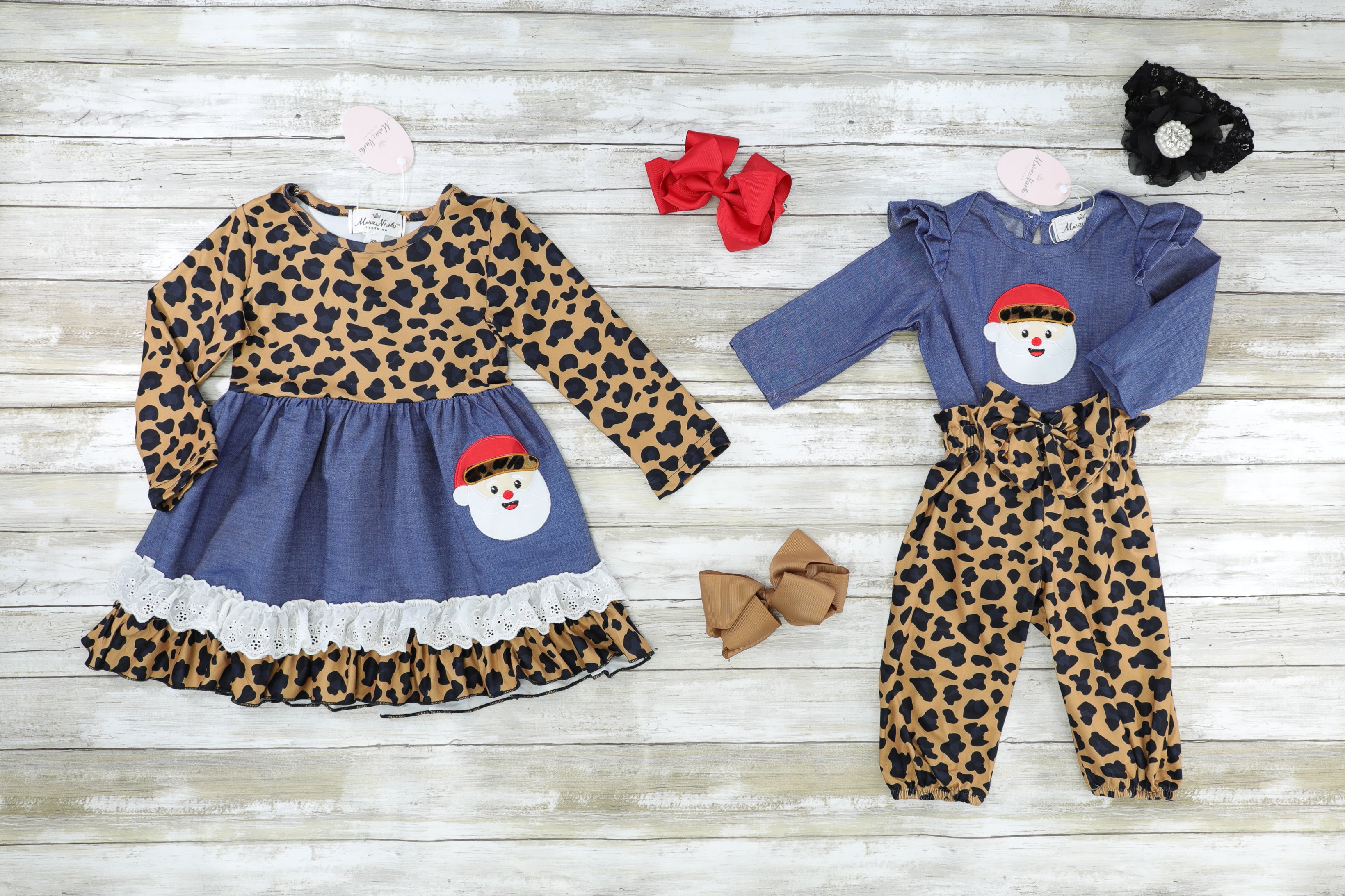 The best sister set for your sassy Santa lovers! This dress features leopard print, lace details, a Santa appliqué, & chambray.