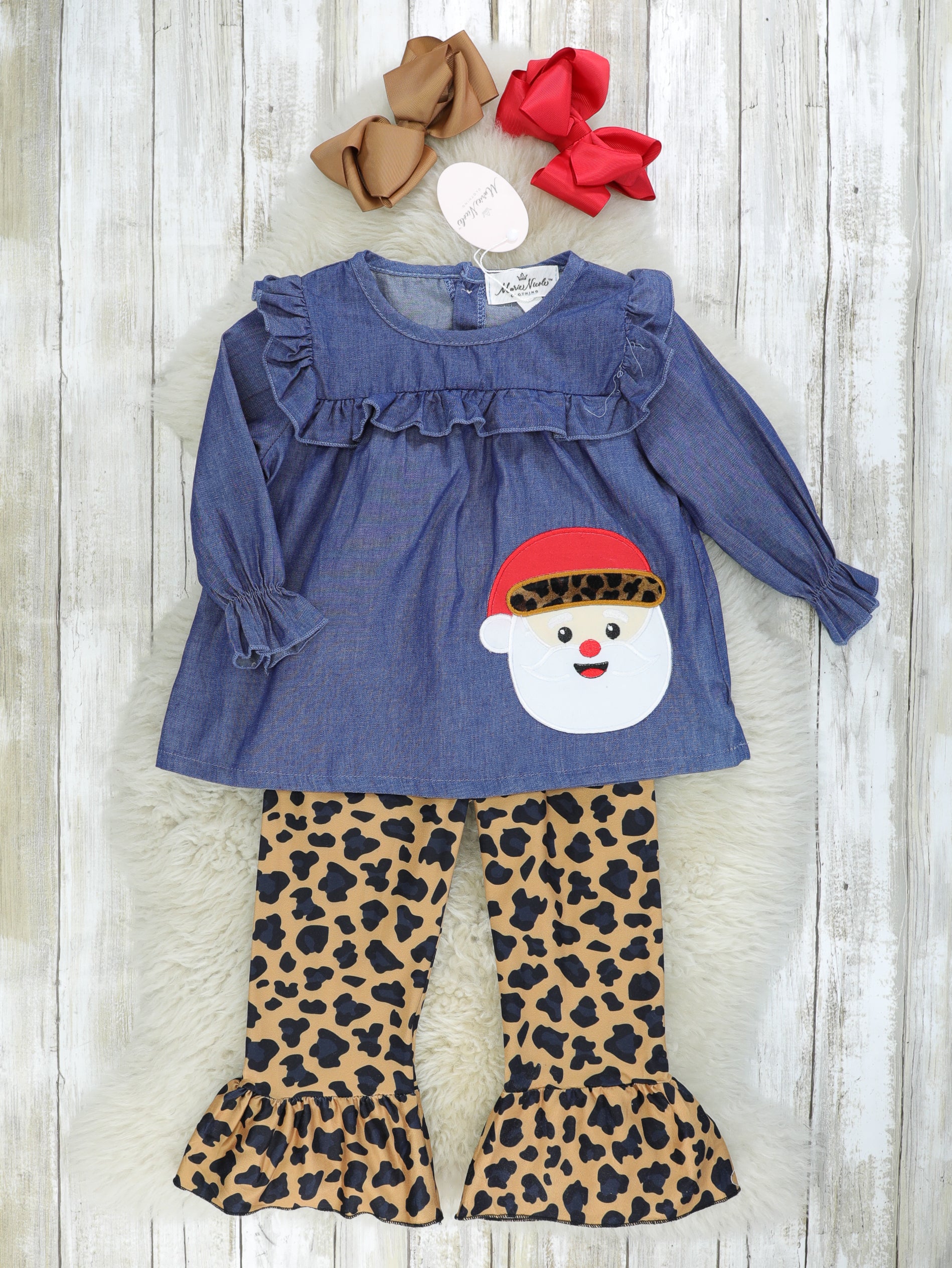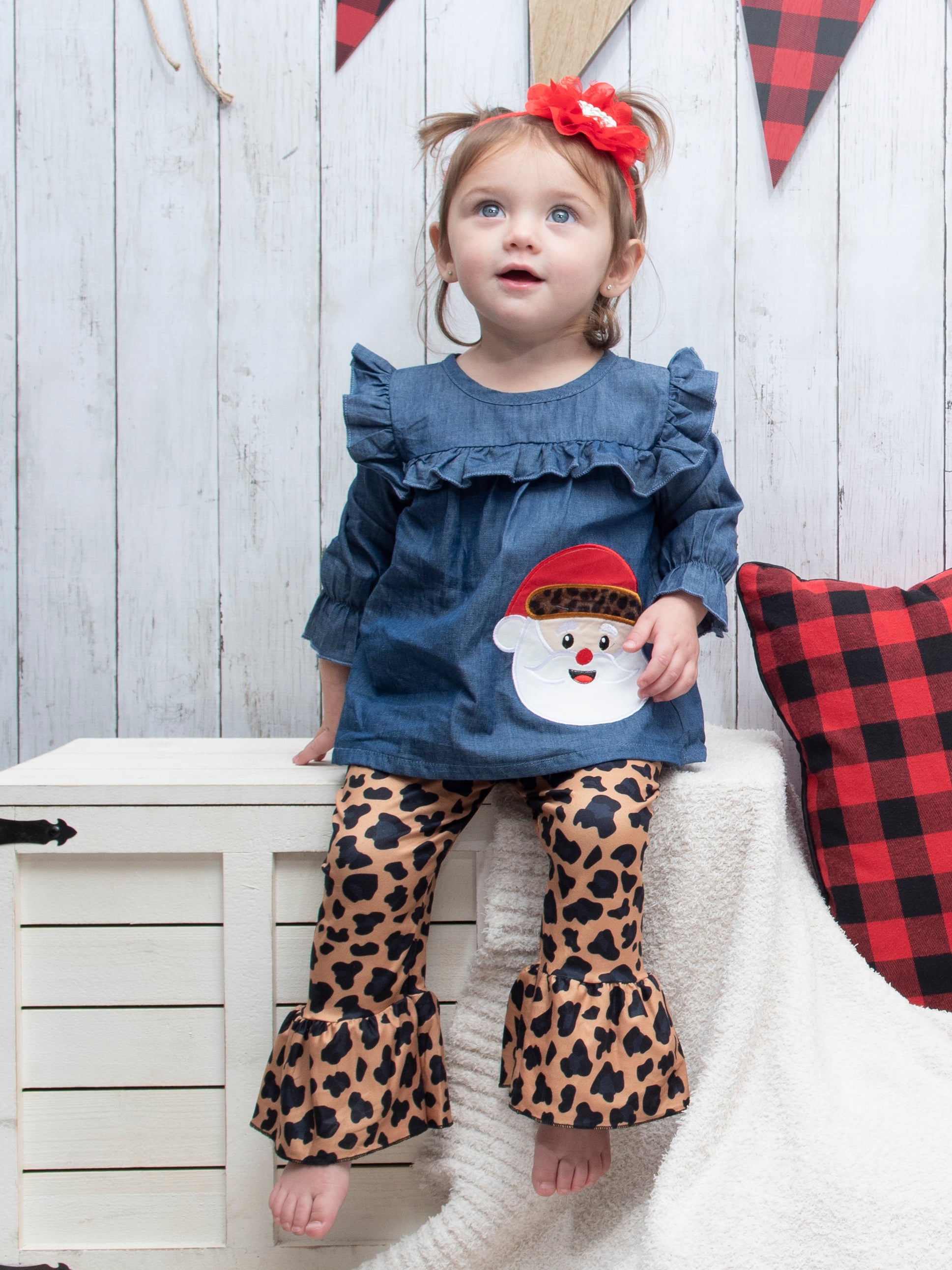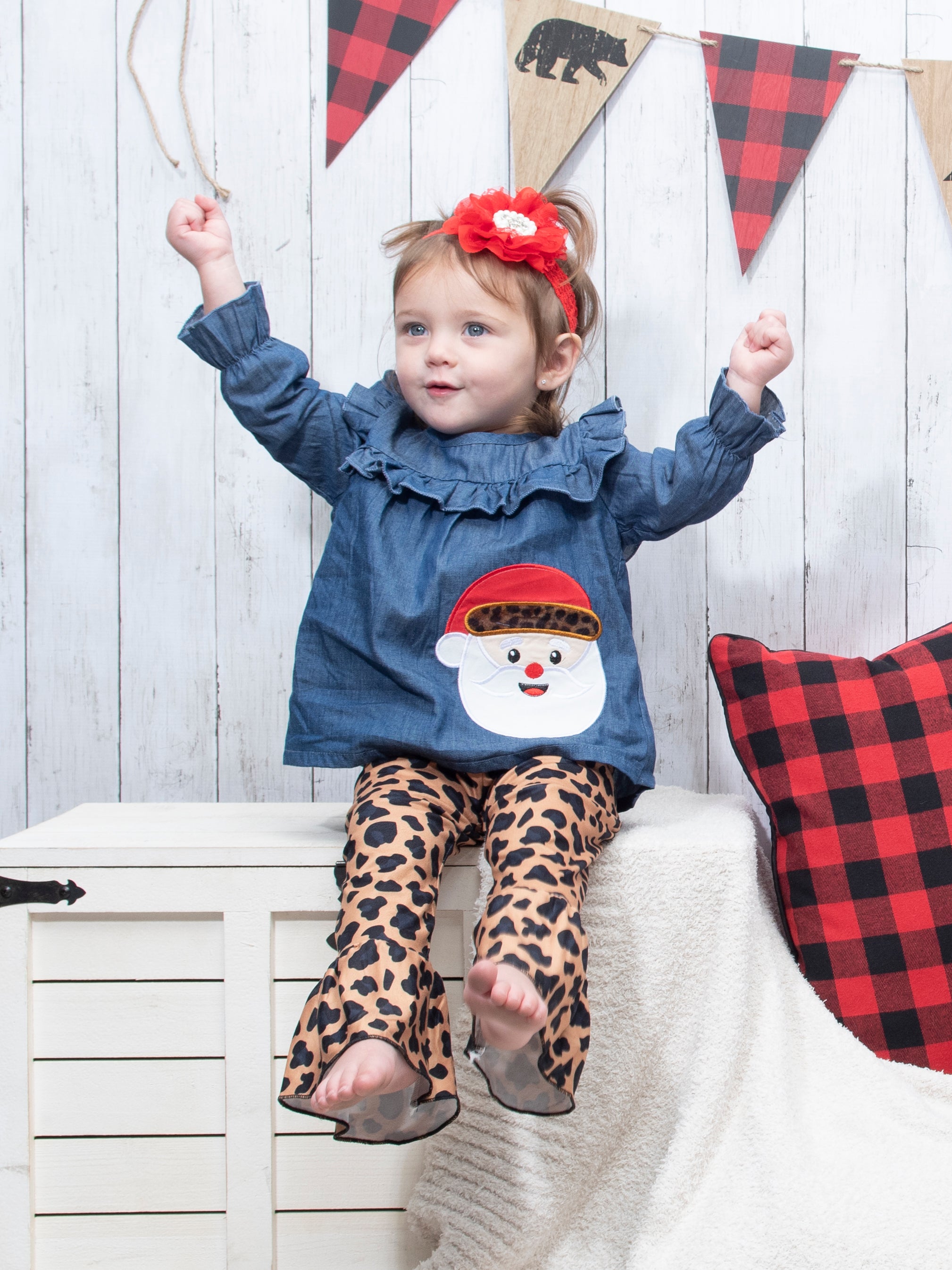 The best sister set for your sassy Santa lovers! This outfit features a chambray top with a Santa appliqué, ruffle trim, & leopard ruffle pants.