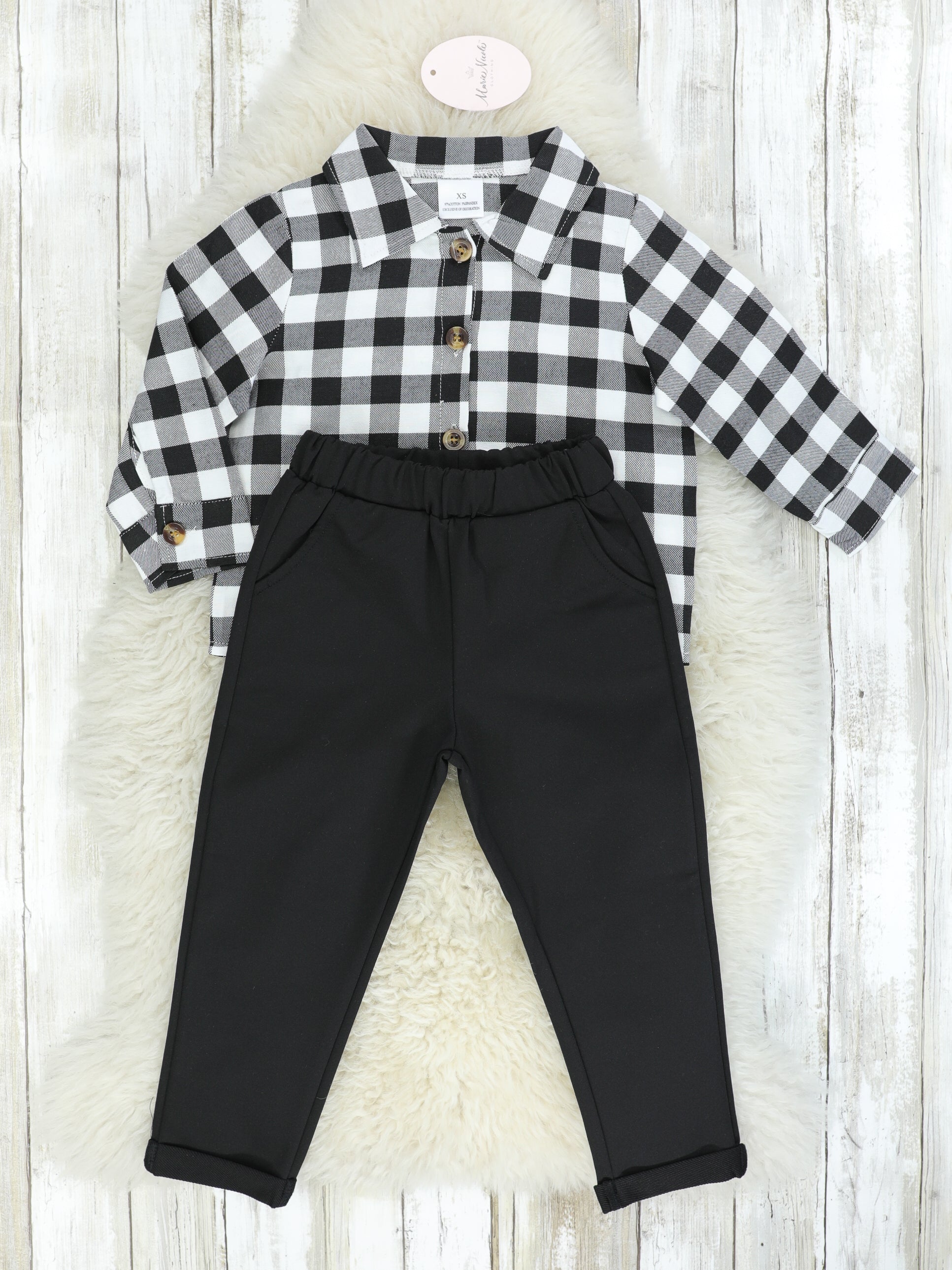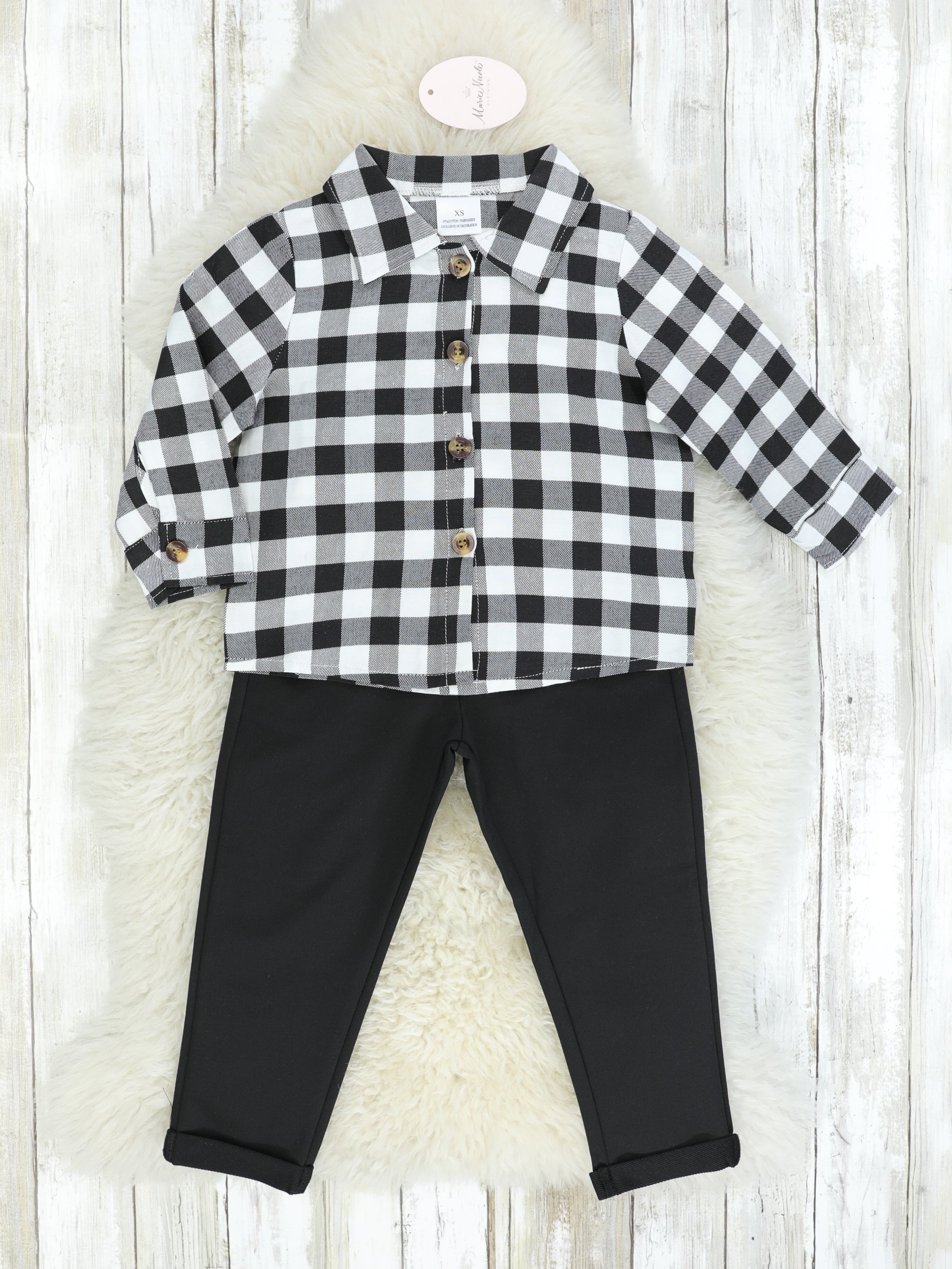 Dress your boys up this fall in this button-up! This outfit features a checked polo long sleeve with functional buttons & black pants.