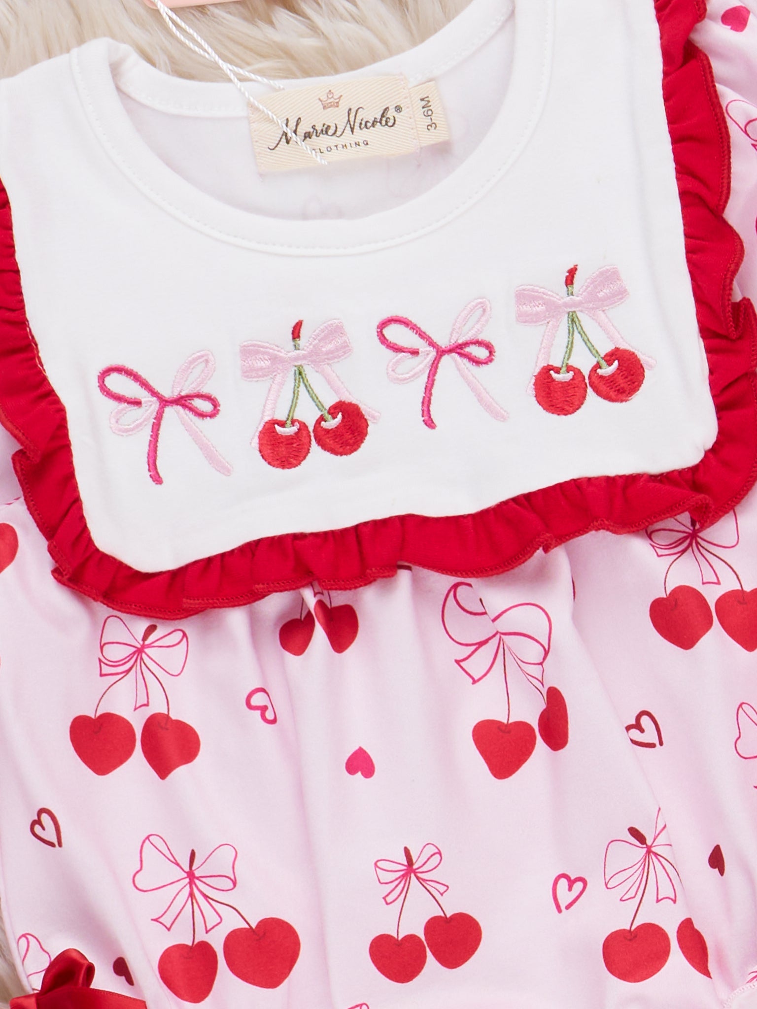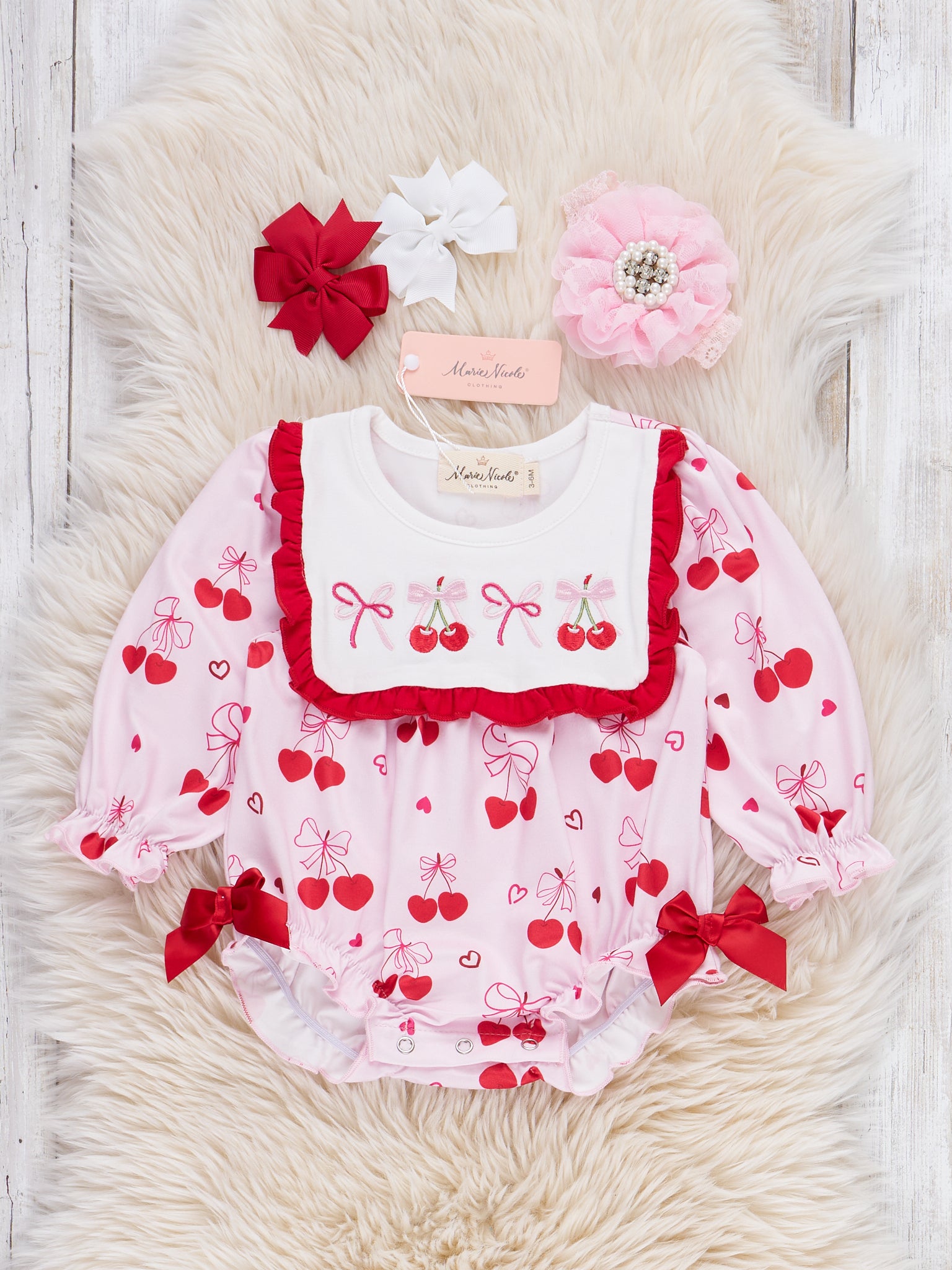 Cherry Bow Embroidered Bubble by Marie Nicole Clothing is a delightful one-piece with a playful cherry and bow print, framed by a scalloped trim and sweet side bows. Designed with gently gathered sleeves and a comfortable bubble silhouette, this outfit brings a touch of whimsy and charm to special days like Valentine's and other memorable occasions.