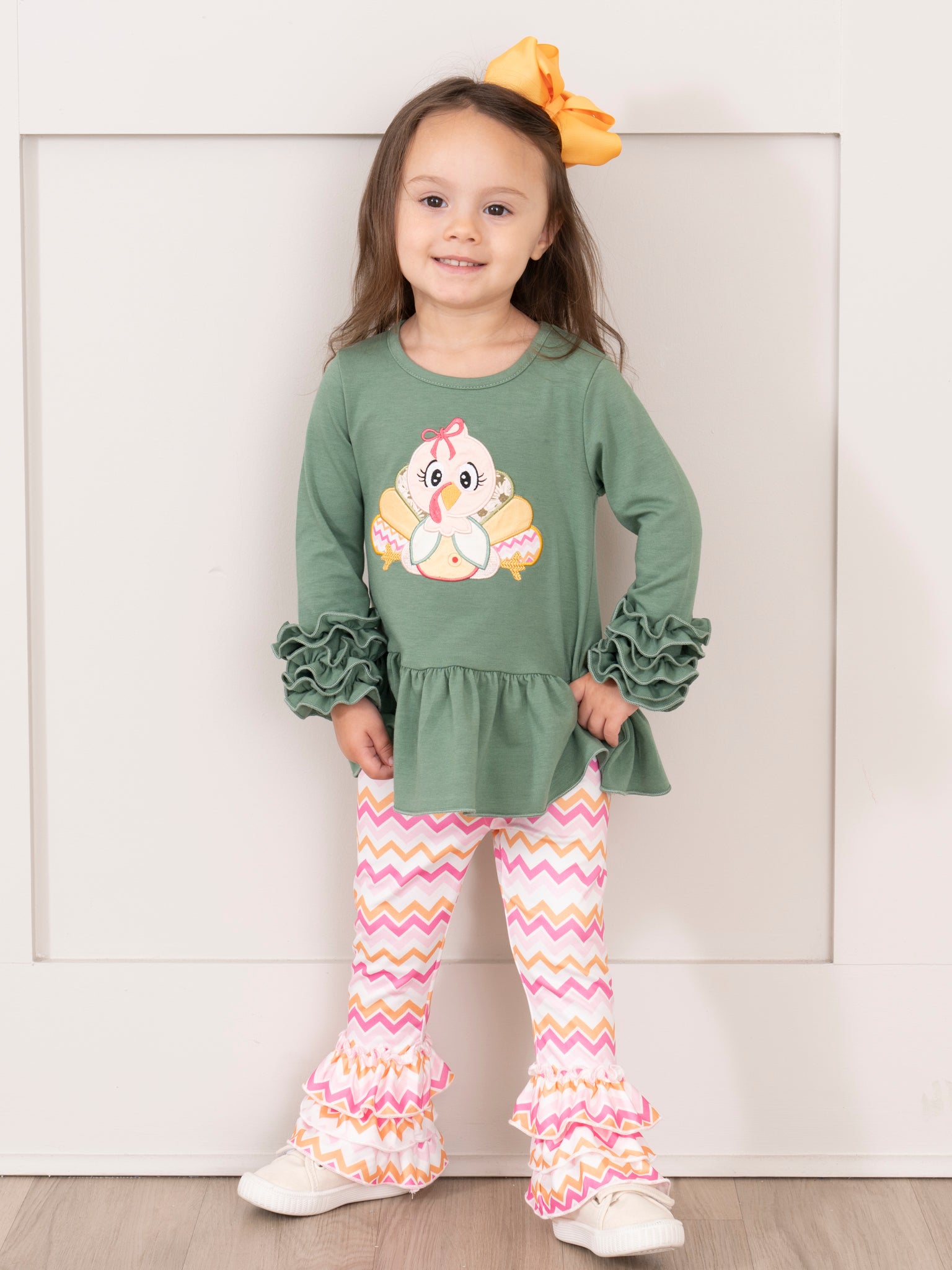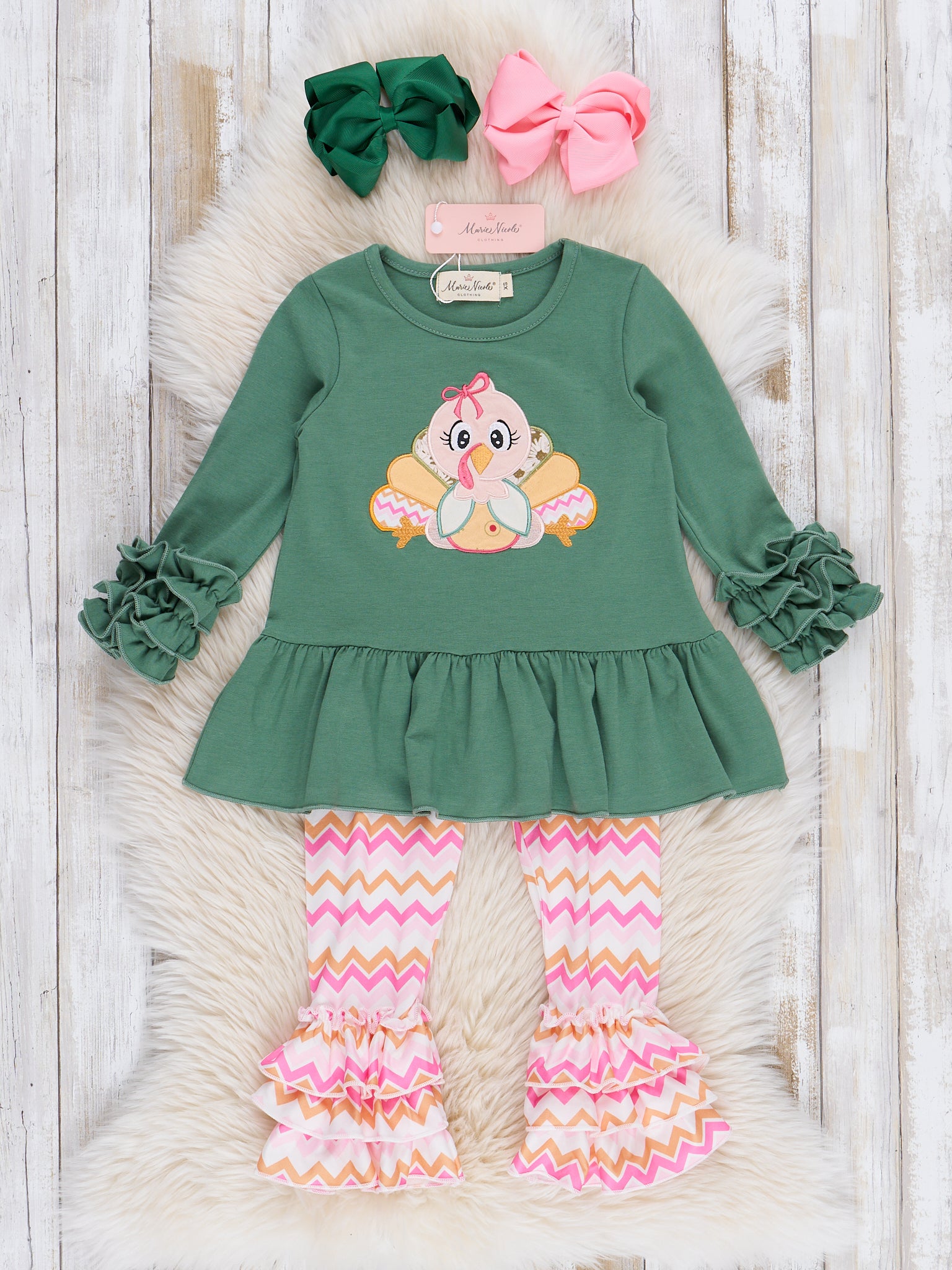 A charming sister set perfect for this Thanksgiving! This outfit features a green top with icing ruffles at the wrists & an adorable turkey appliqué paired with chevron ruffle pants.