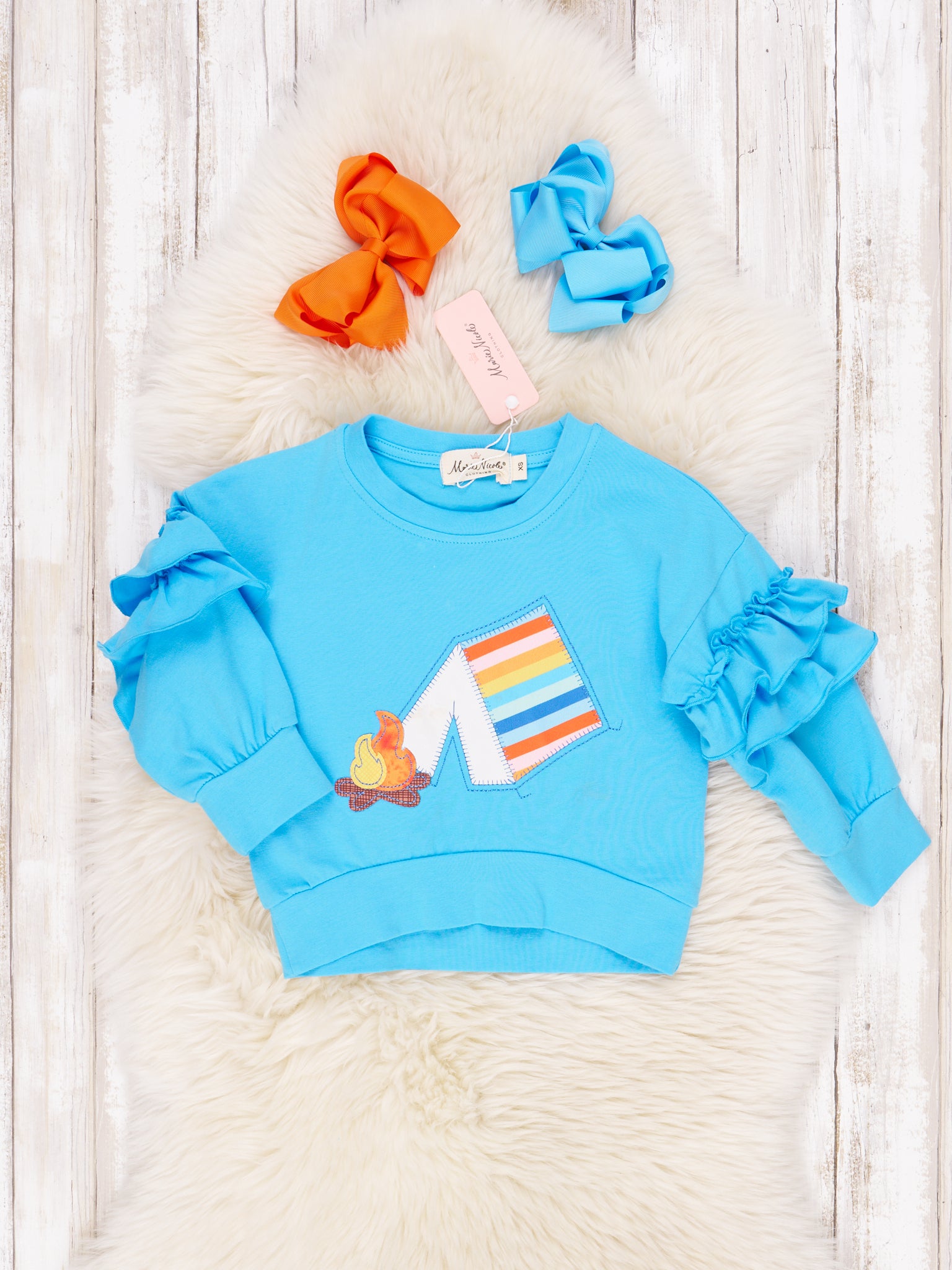 Commemorate your fall camping trip with this bright sister set! This super soft crewneck features ruffle sleeves and embroidered rainbow tent & campfire detail.