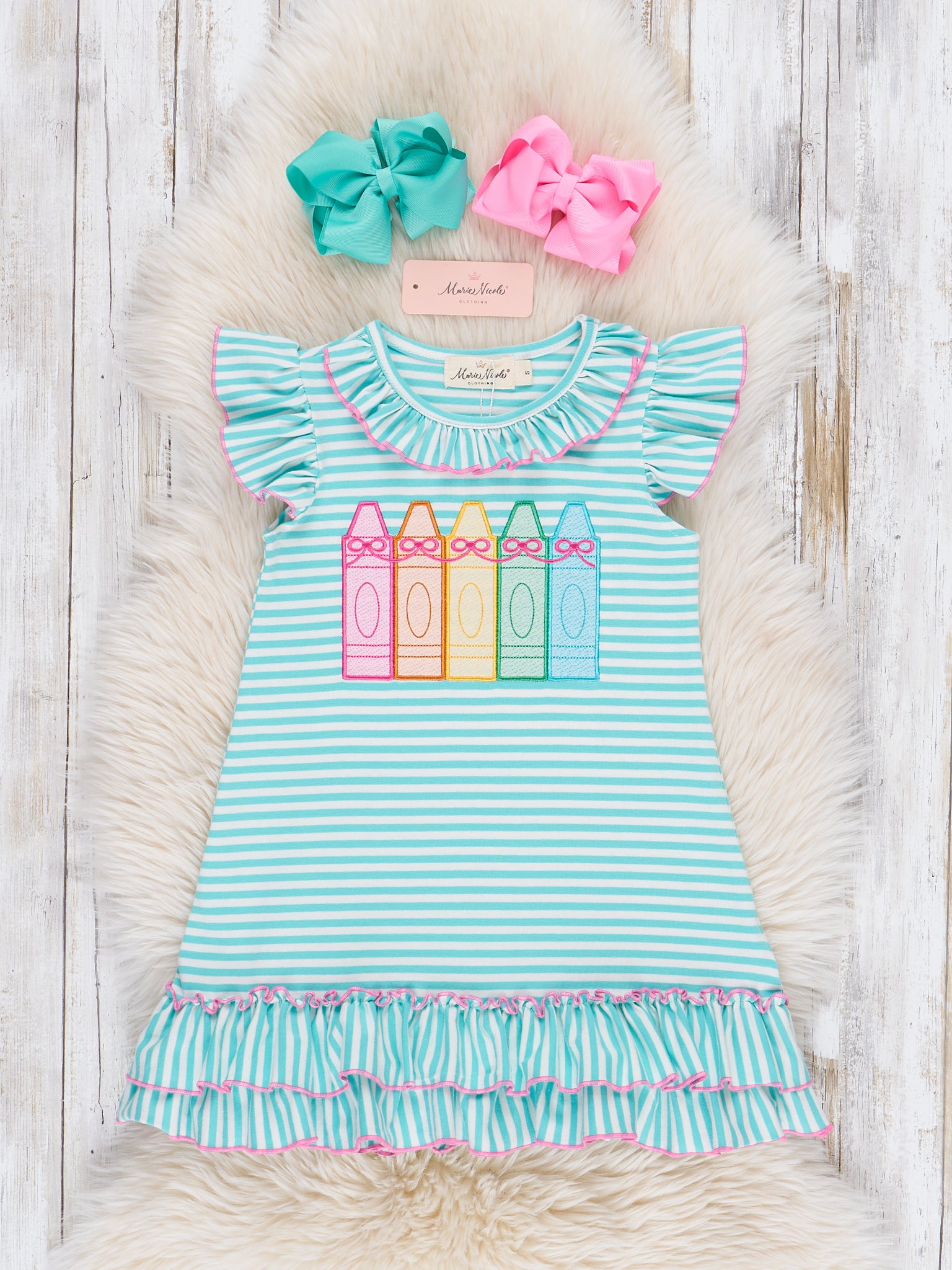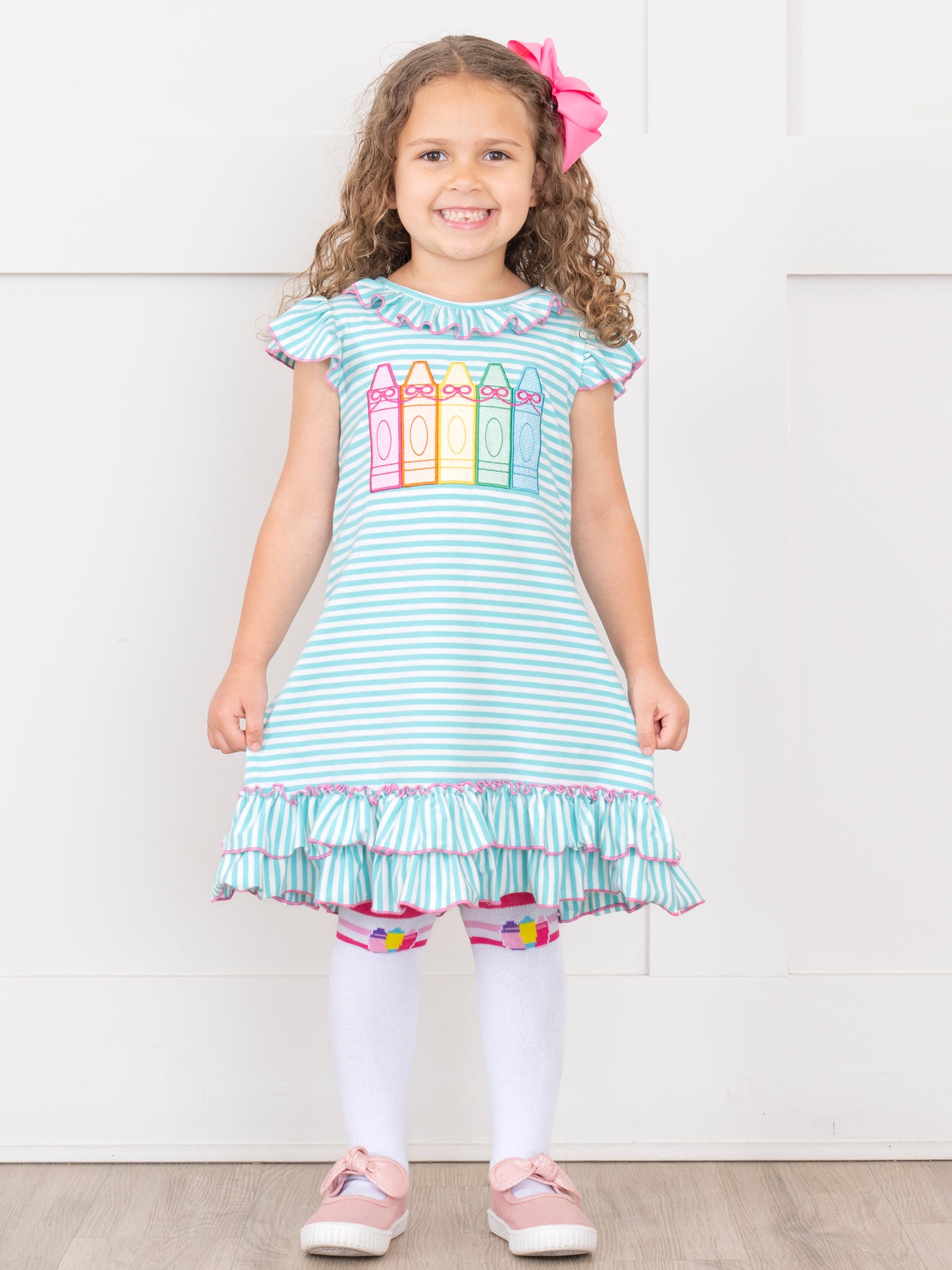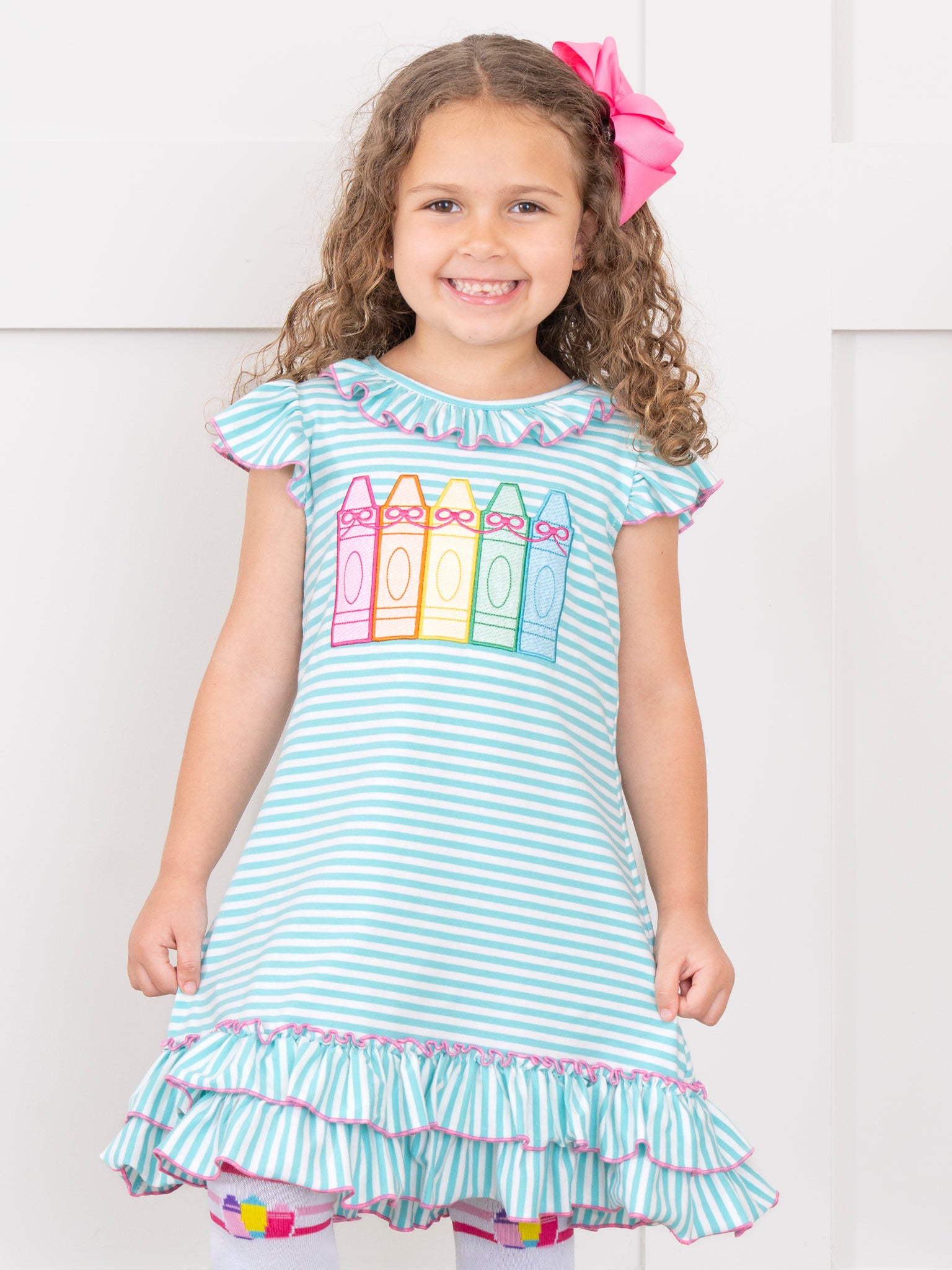 The Color Me Happy Striped Crayon Dress is a bright and cheerful favorite that’s perfect for back-to-school and playful days. Featuring colorful stripes and fun crayon details, this dress from Marie Nicole Clothing brings creativity and charm to her everyday wardrobe. Lightweight and comfortable, it’s ideal for classroom fun, art time, or any day she wants to shine in full color.