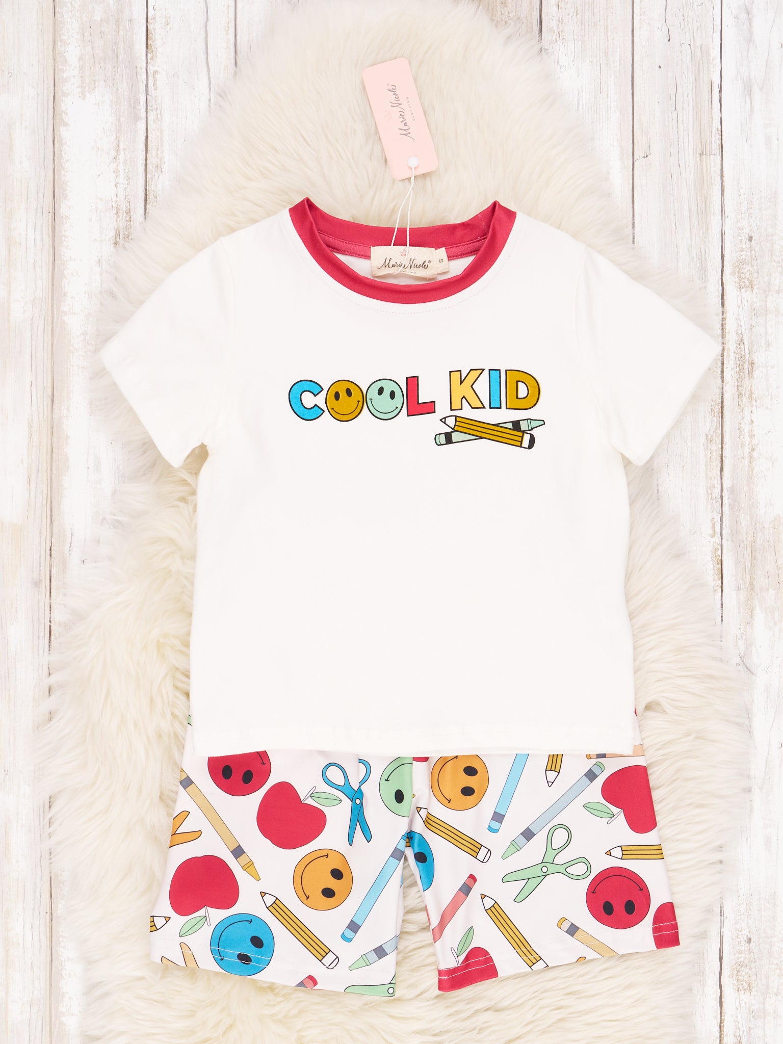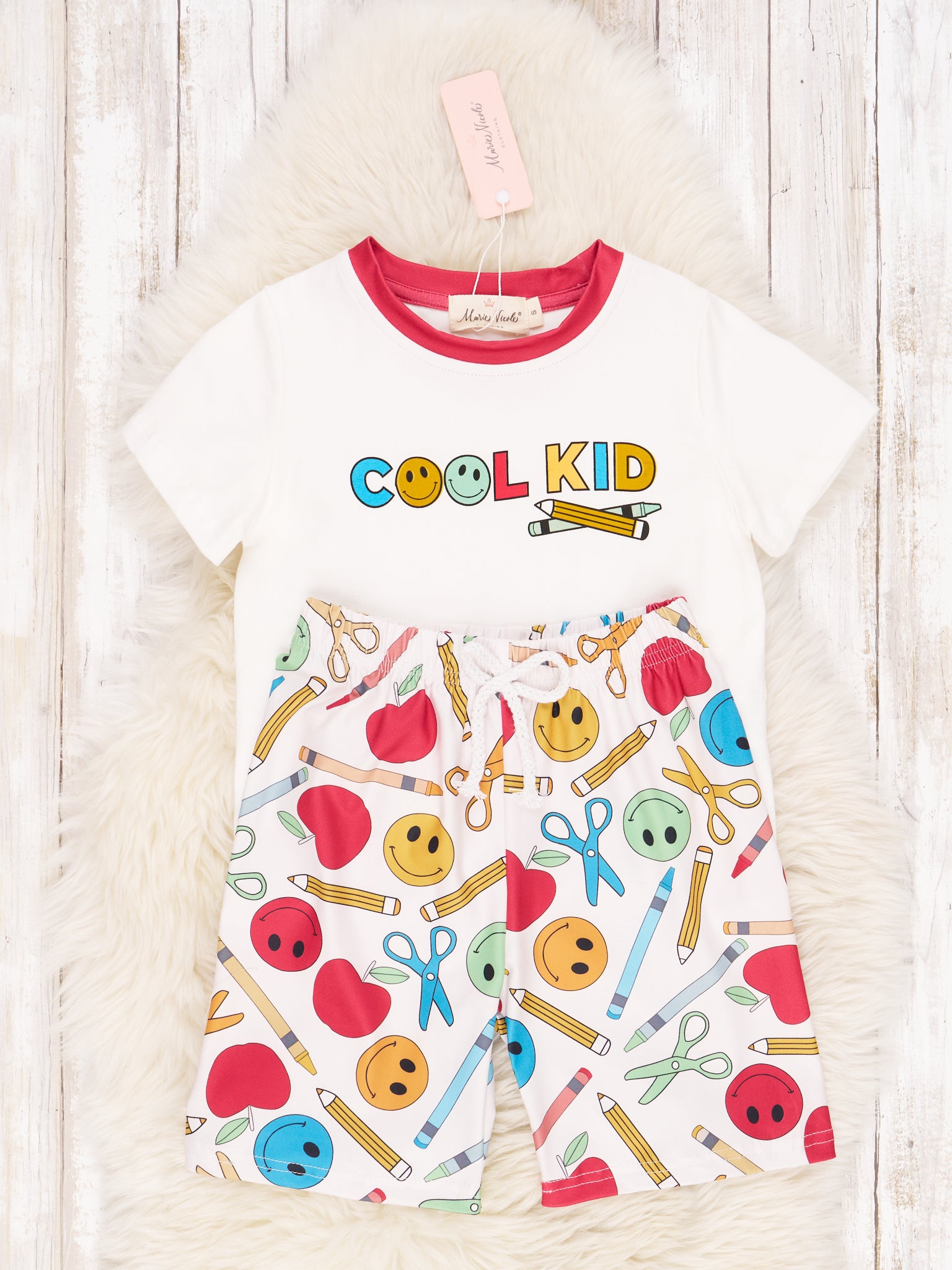 Make 'back to school' look cool with this "Cool Kid" Smiley School Outfit! Featuring a trendy "cool kid" top and smiley & school supplies accent shorts, with an elastic waistband for a comfortable fit. Get ready to rock the hallways in style!