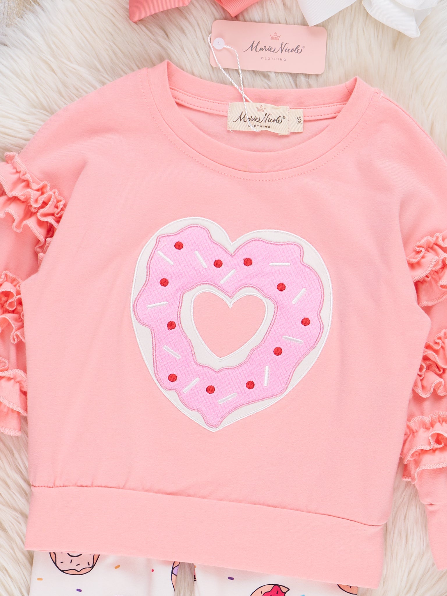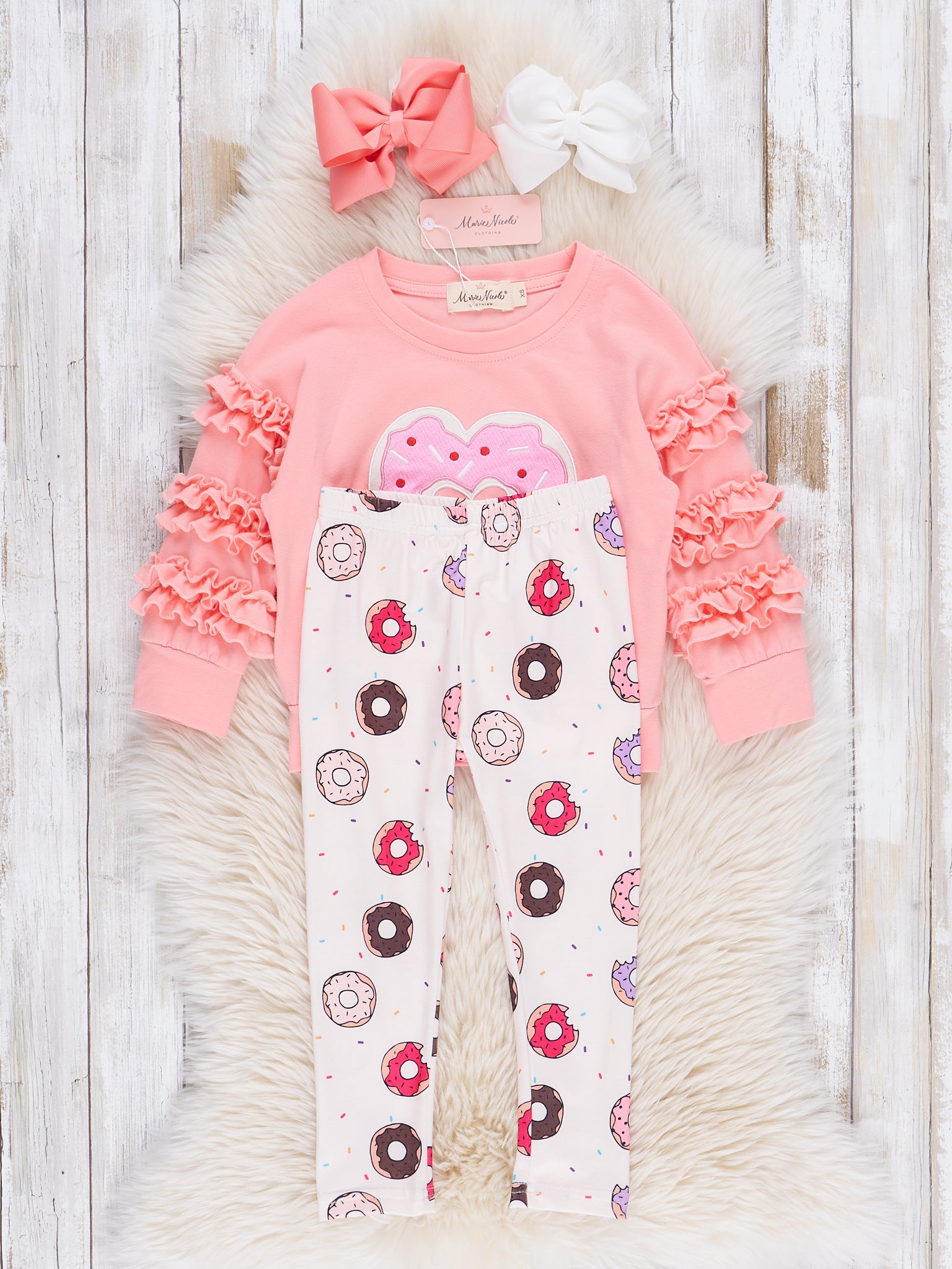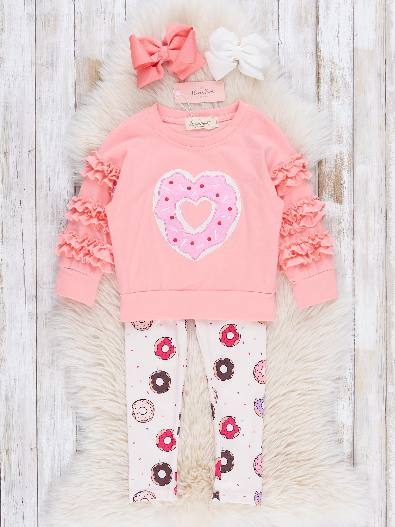 This Coral & Brown Donut Hearts sister set is the perfect way to dress up your little sweethearts! It features a coral top with ruffle sleeves and an adorable embroidered donut heart on the chest paired with donut print leggings so your little one will be ready to take on the holiday. Perfect for a special occasion or a day out with the fam.