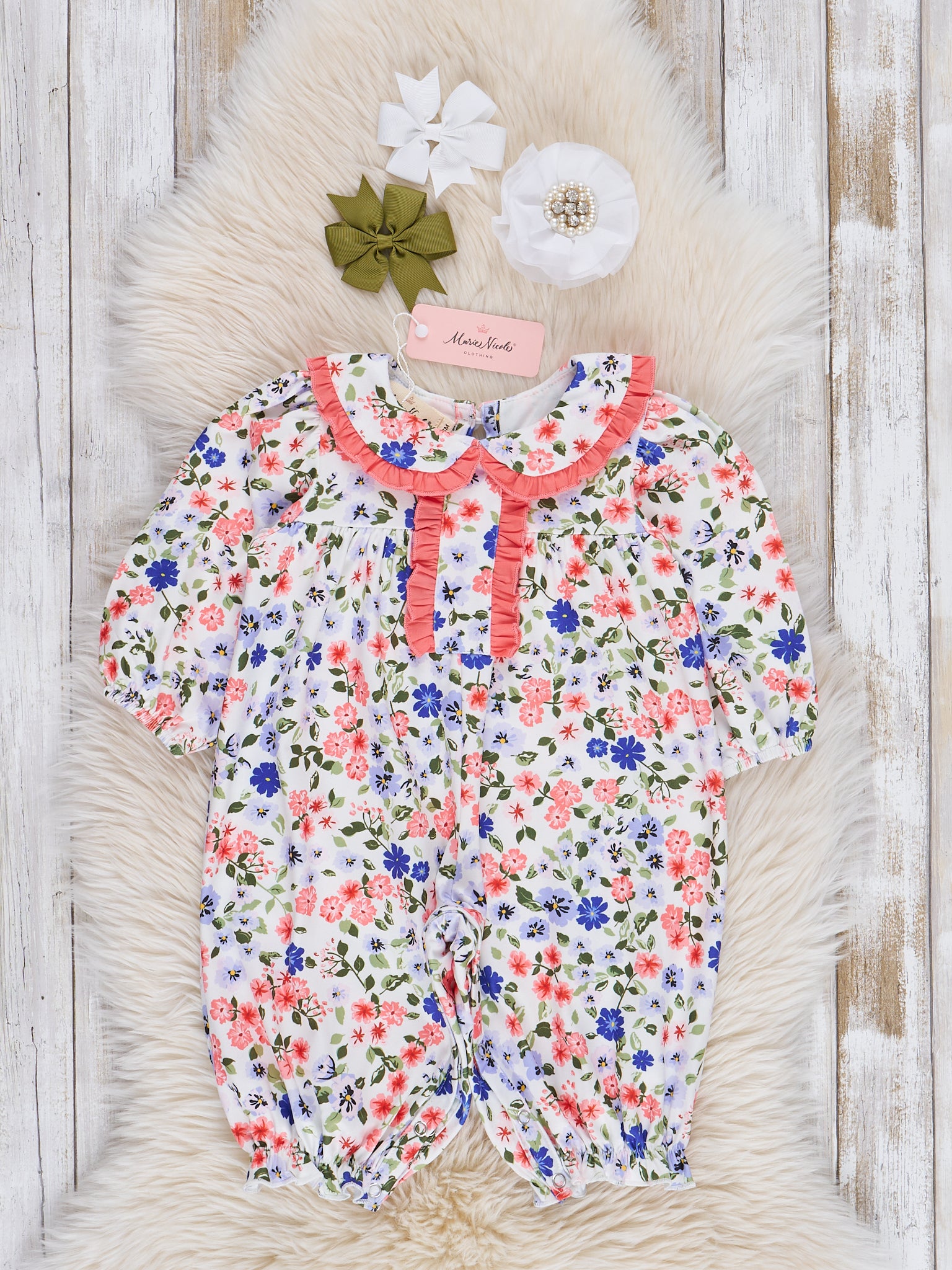Get ready for some major flower power with our Coral Crazy Daisies Ruffle Romper! Perfect for your little girl, this romper features a fun allover daisy print and playful coral ruffle trim. Don't forget to check out our sister set for even more cuteness!