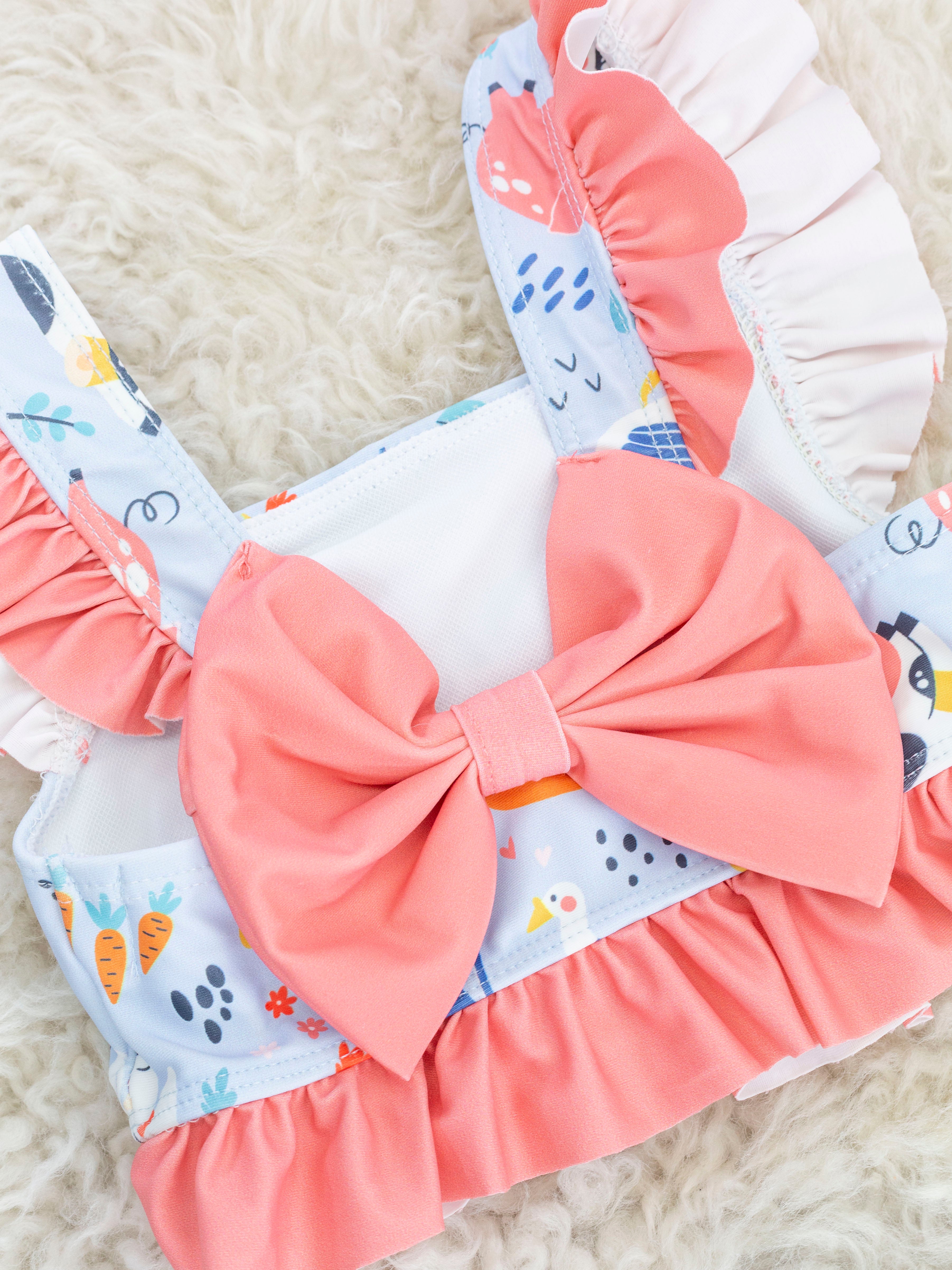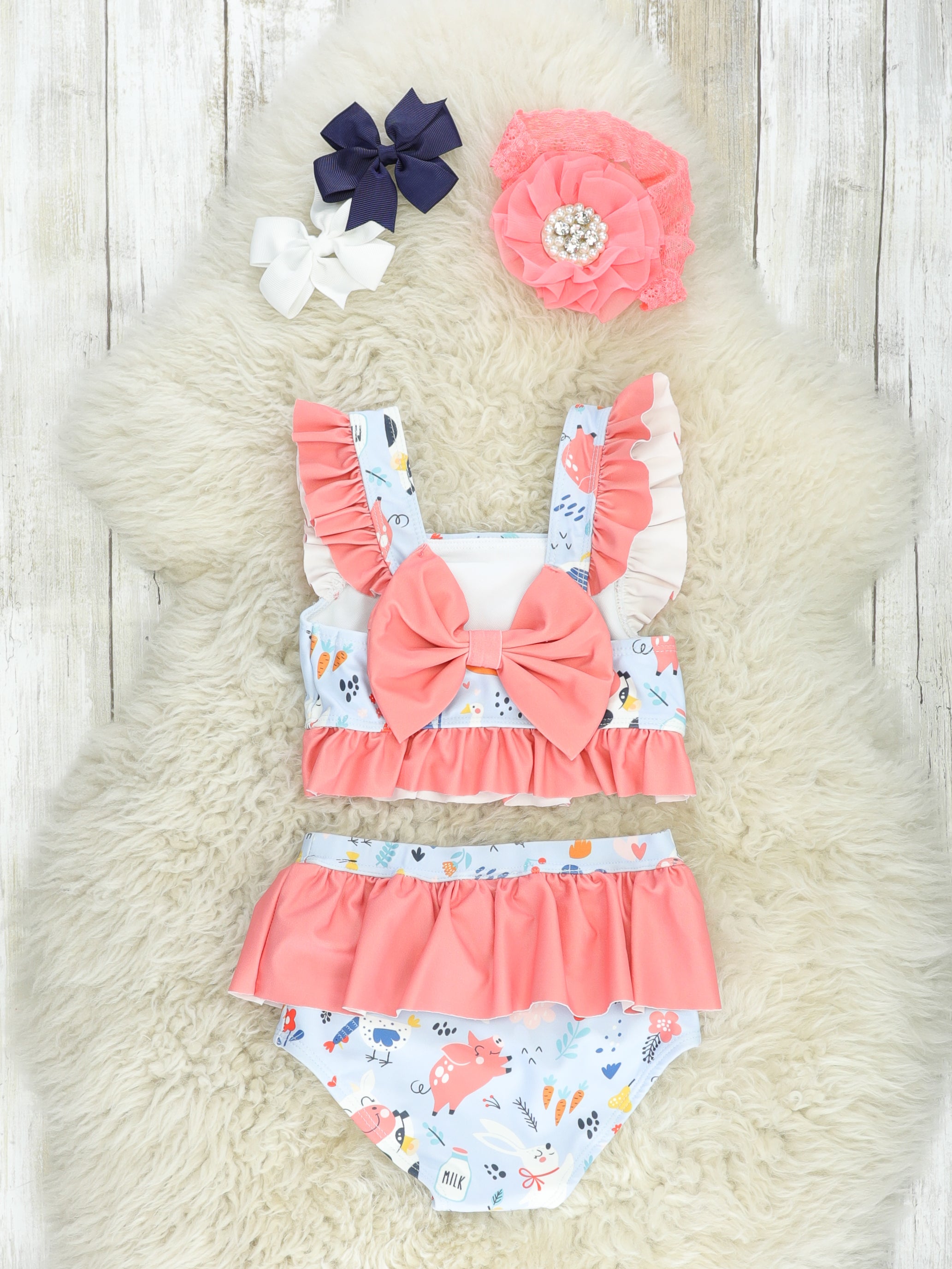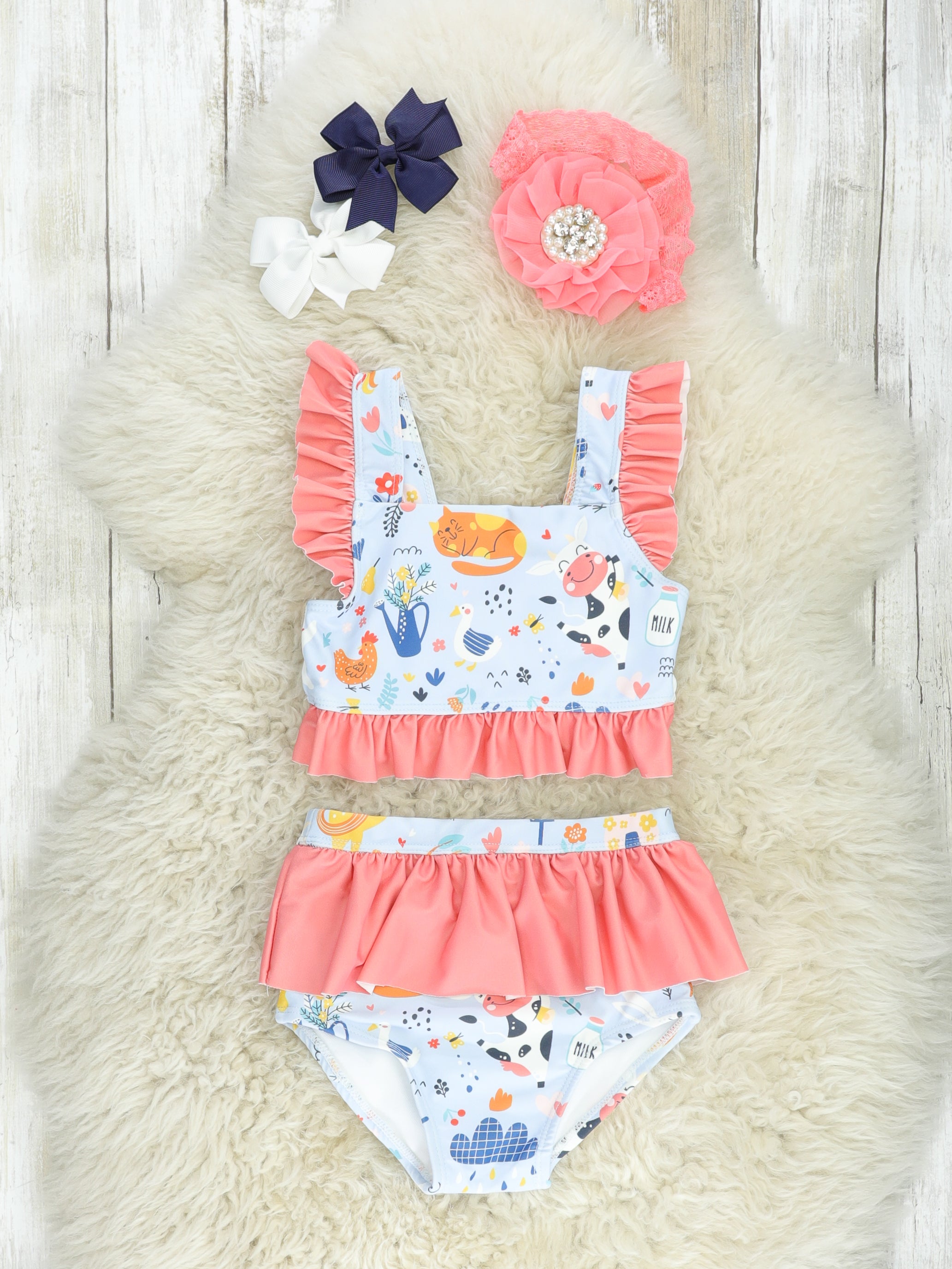 sassy sister set for your farm gals! This swimsuit features a fun farm print, a coral ruffles, & an elastic waistband.