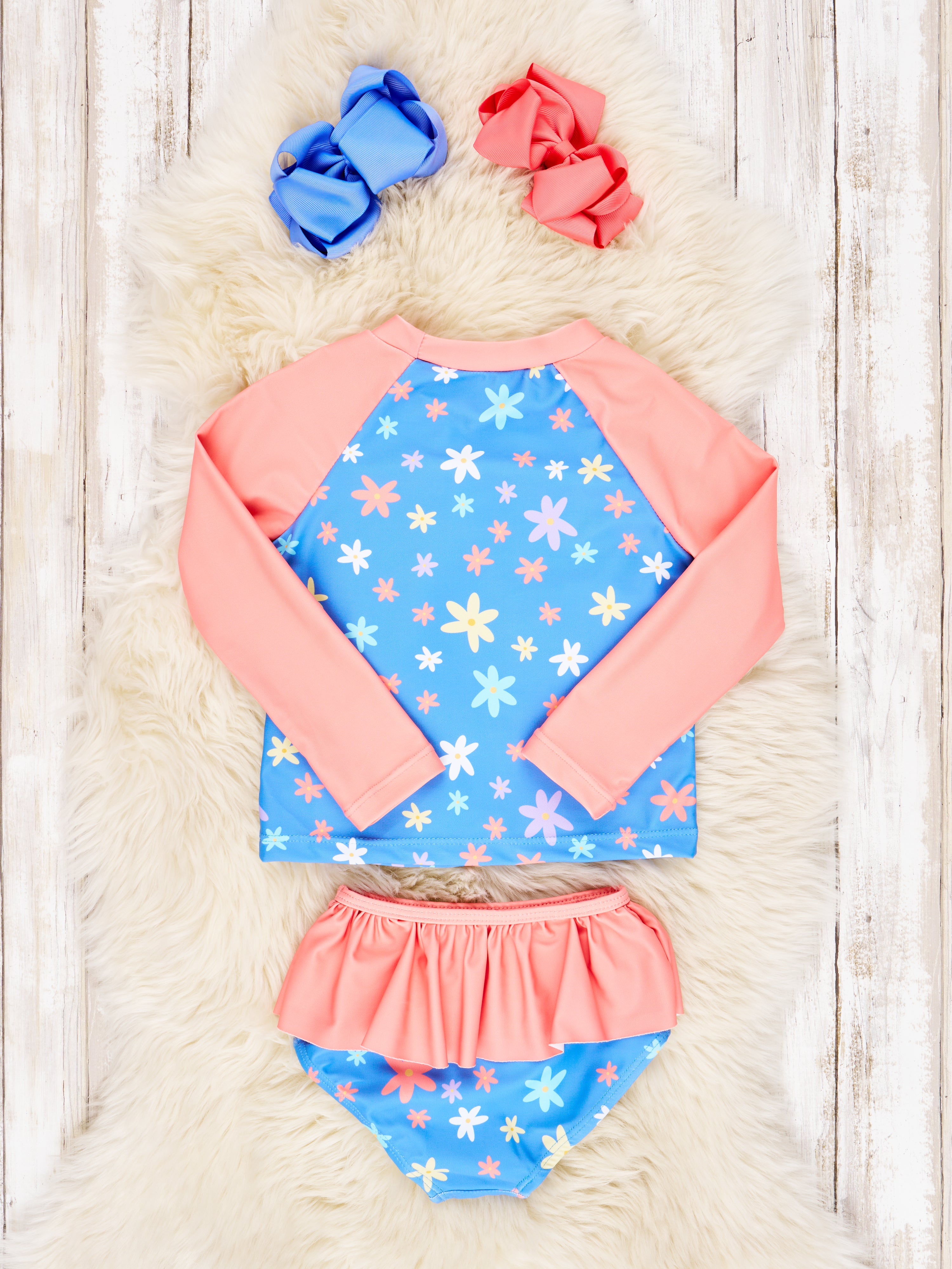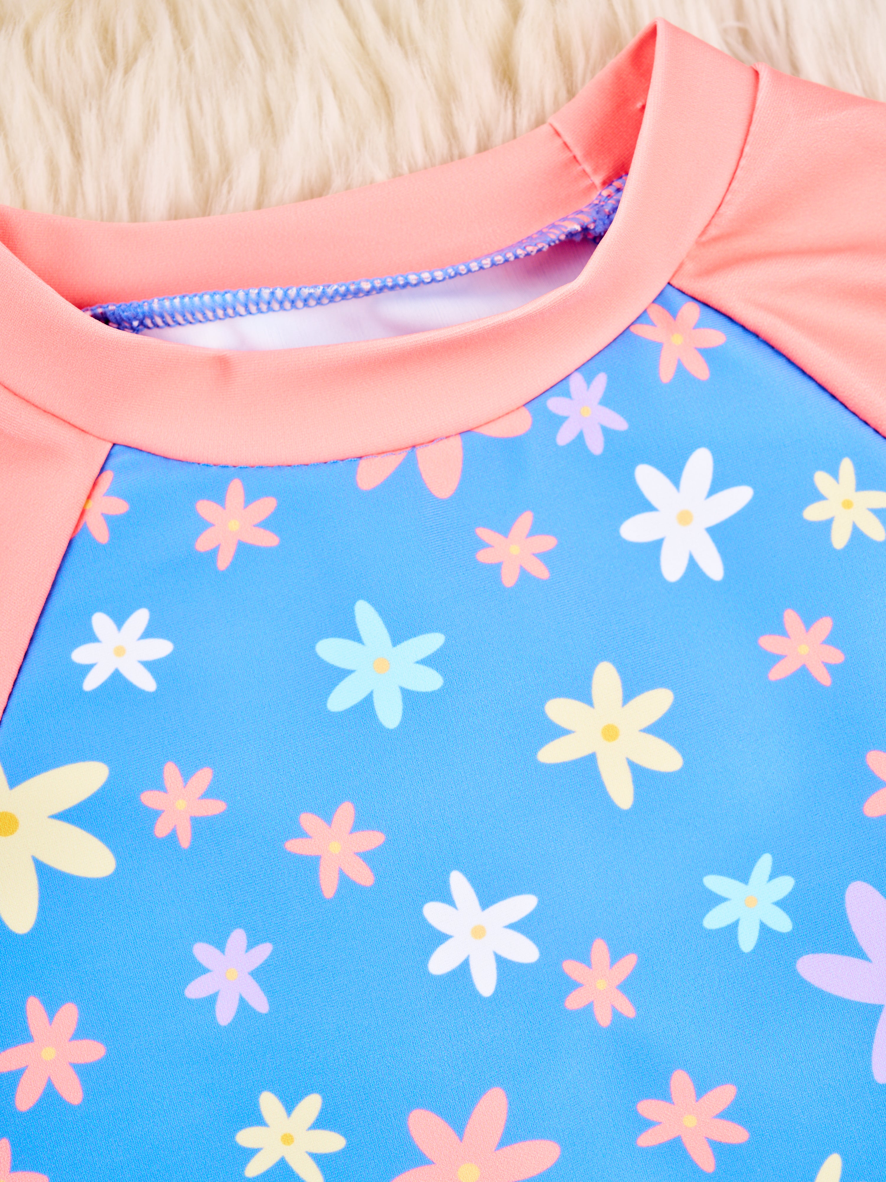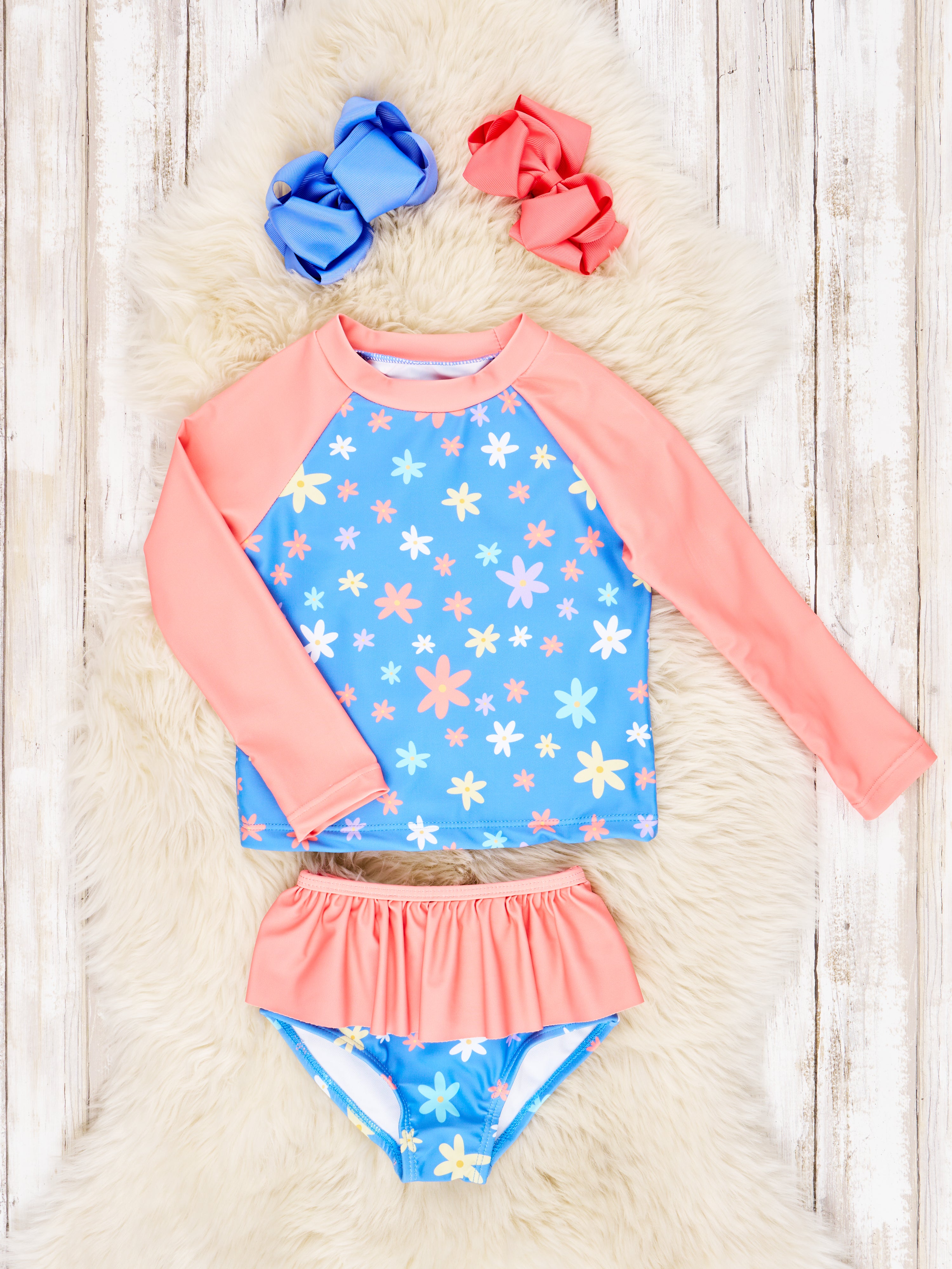 Make a splash with this fun Coral Floral Raglan Rash Guard Swimsuit! This cool two-piece features stylish raglan sleeves and a bright floral print, perfect for protecting your kiddo from the sun's glare. Ahoy! Its charming ruffles and bright colors guarantee your girl will be the cutest thing on the beach.